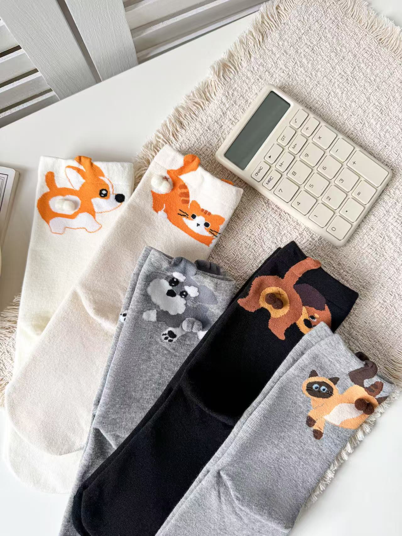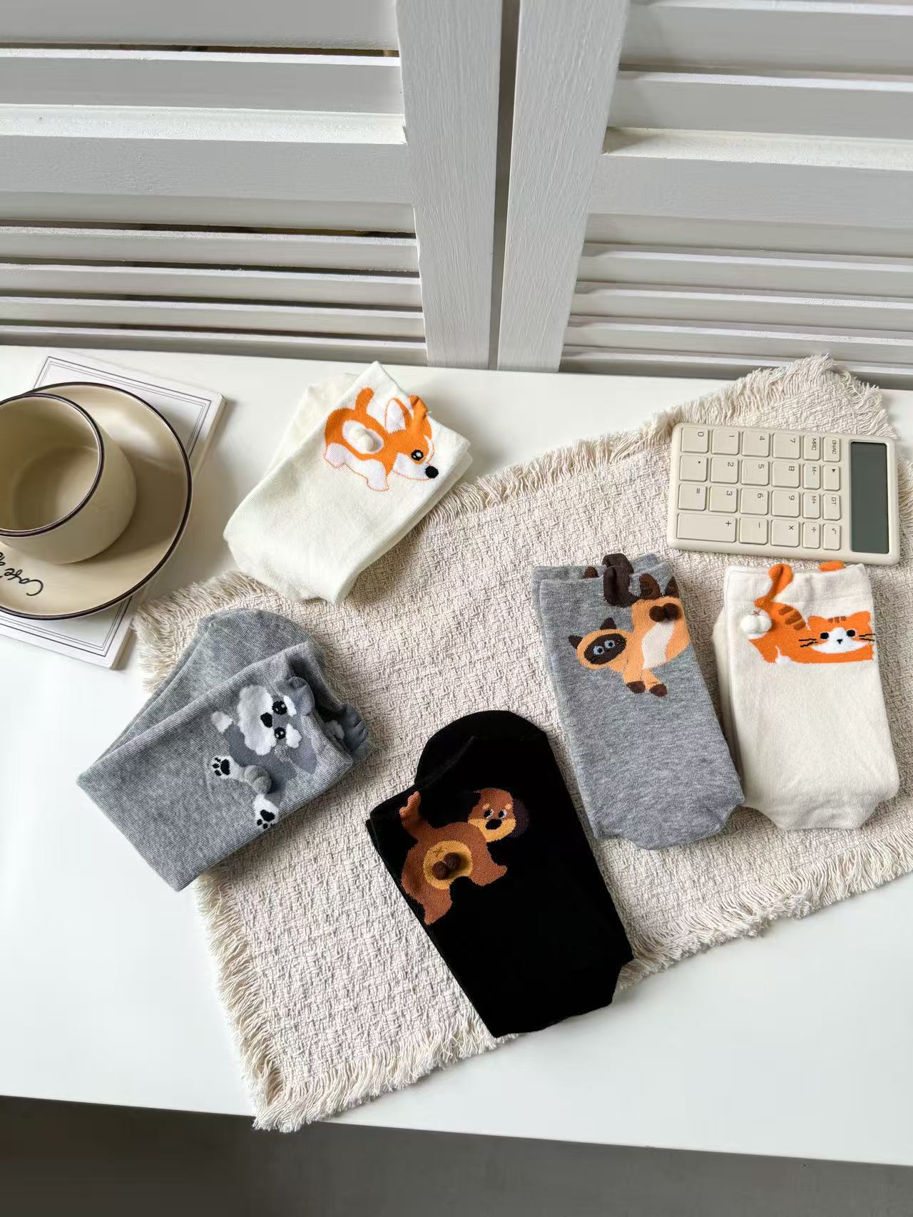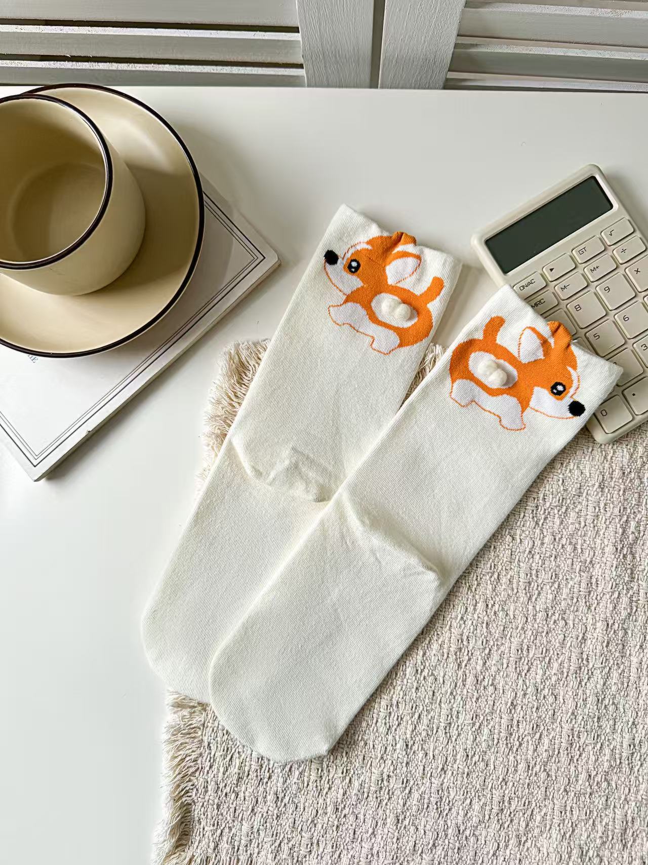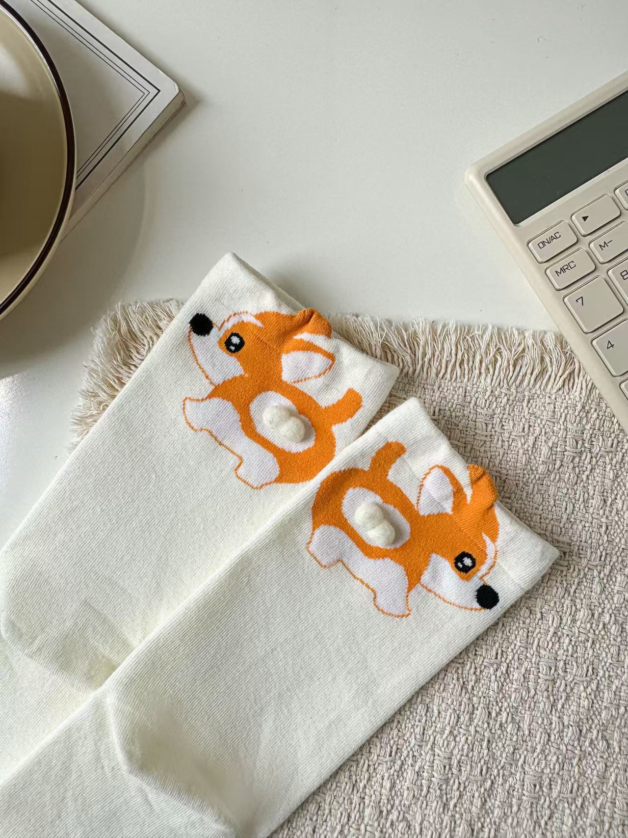 [재고 있음] 여름 여성용 흰색 만화 고양이 징글 달걀 양말 ins 코튼 귀여운 웃긴 중간 튜브 양말