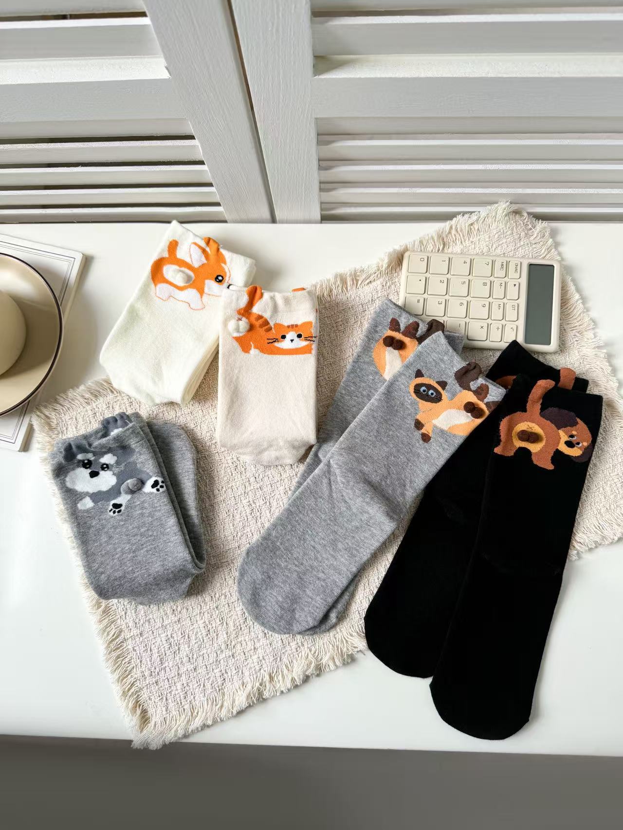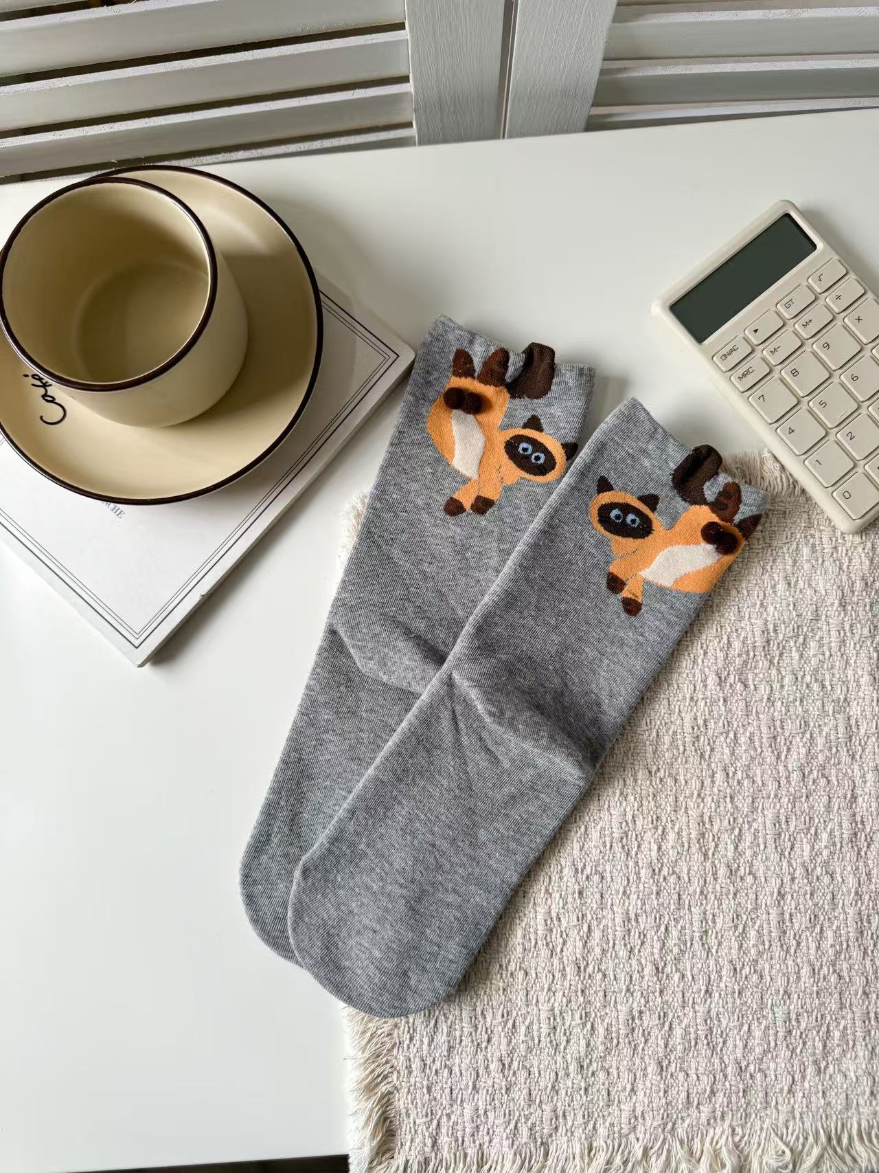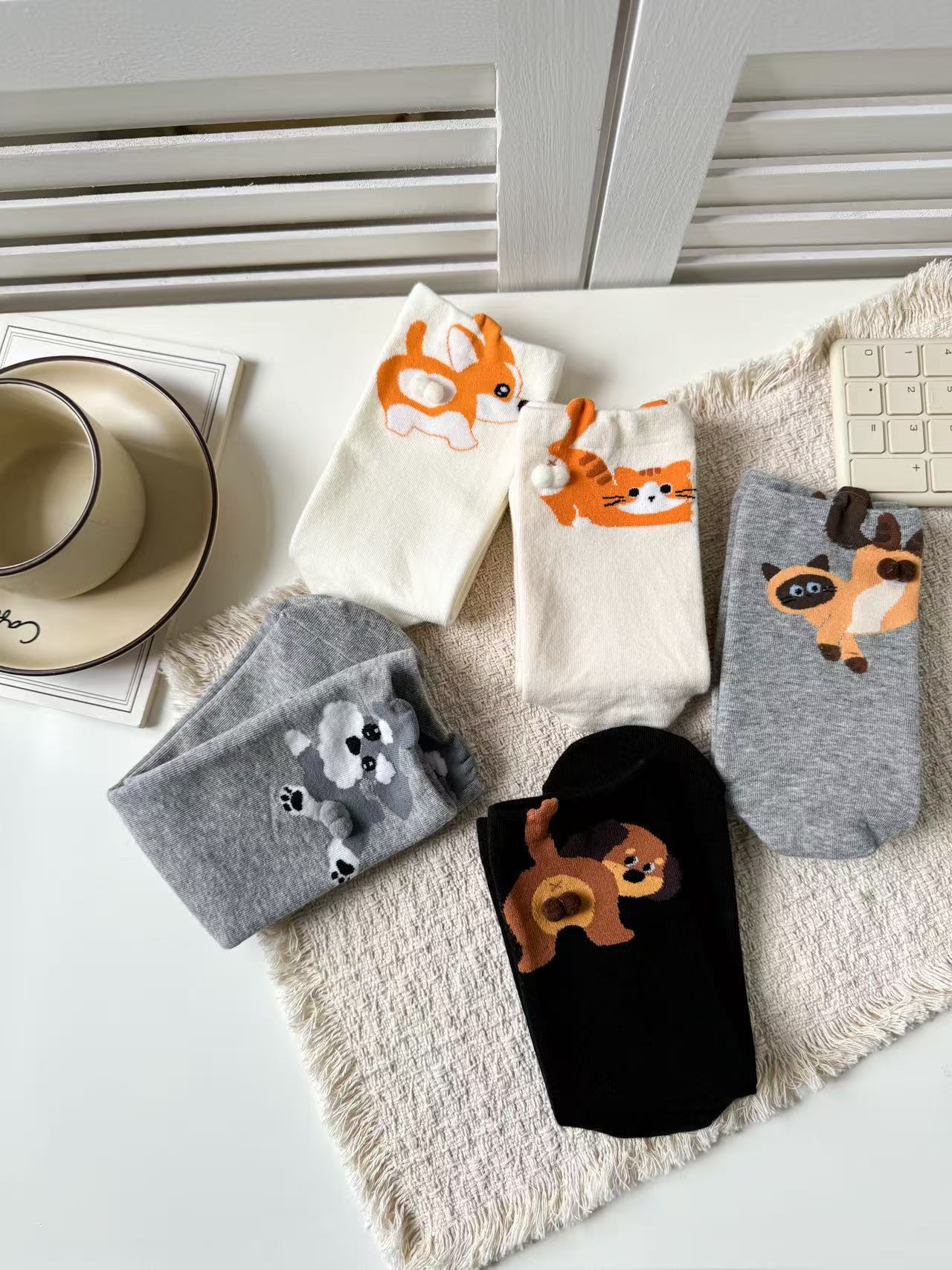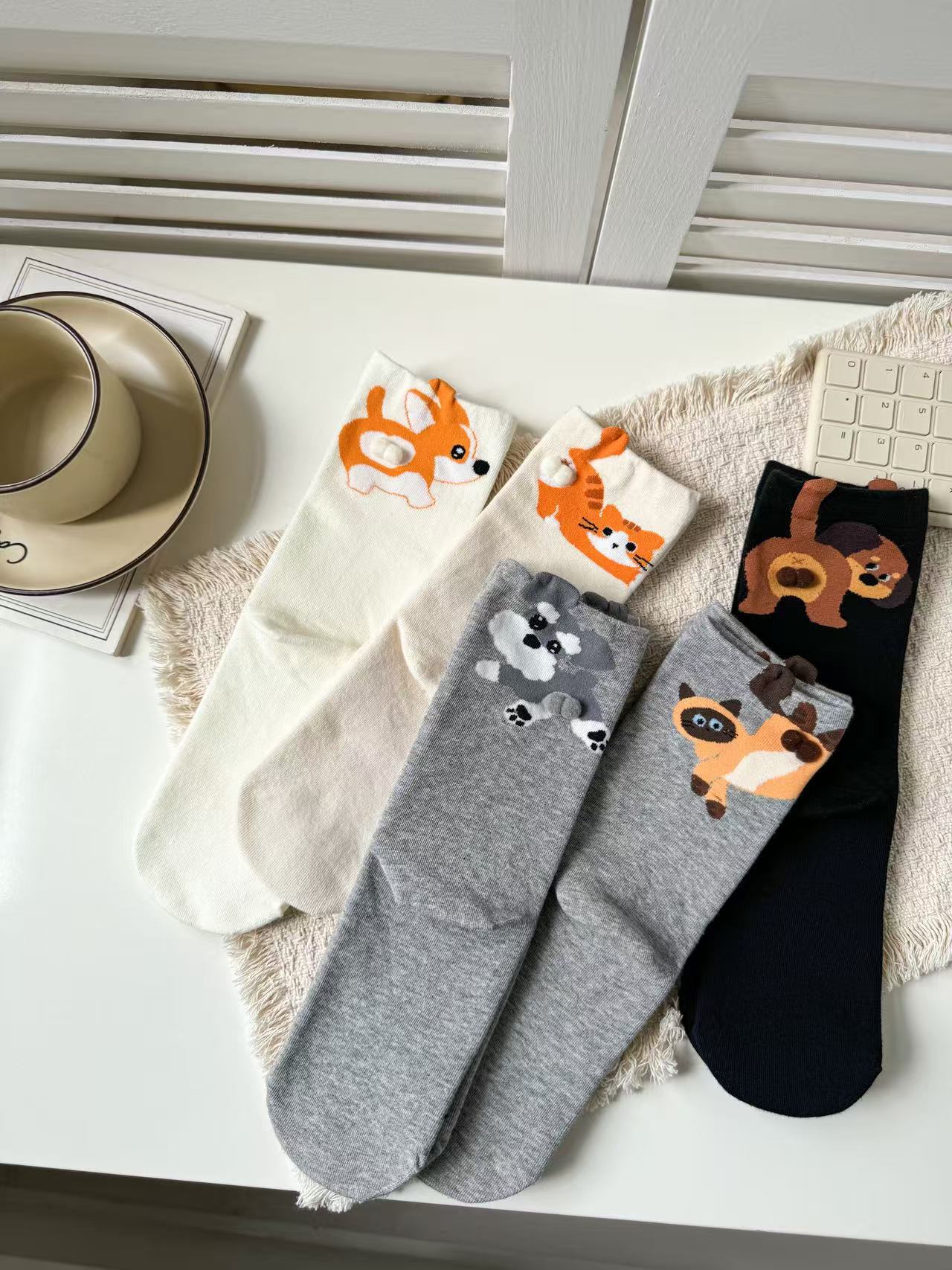 [재고 있음] 여름 여성용 흰색 만화 고양이 징글 달걀 양말 ins 코튼 귀여운 웃긴 중간 튜브 양말