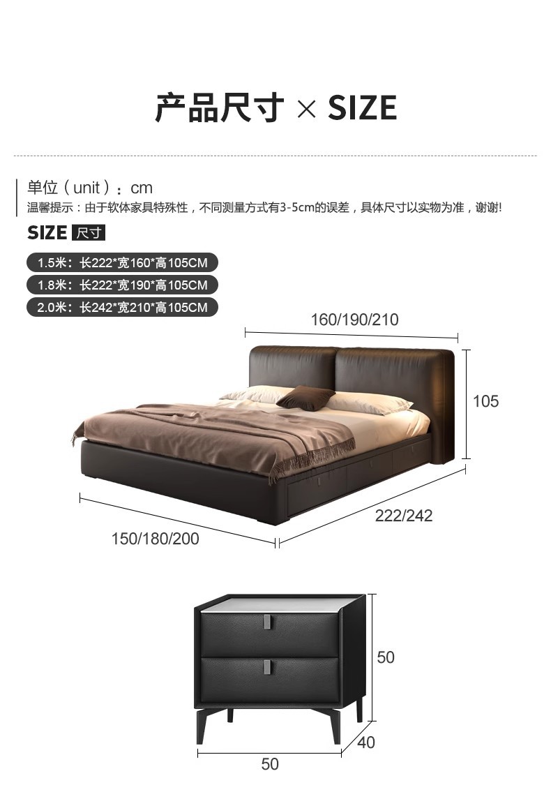 빅 블랙 소 가죽 침대 마스터 침실 더블 침대 소프트 박스형 수납 침대 이탈리안 모던 미니멀리스트 1.8m 웨딩 침대
