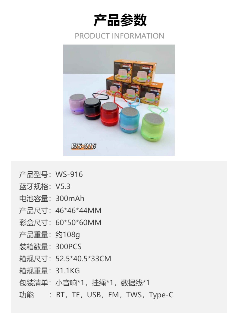 국경 간 새로운 유리 RGB 미니 오디오 선물 서브 우퍼 대용량 WS916 카드 포켓 블루투스 스피커