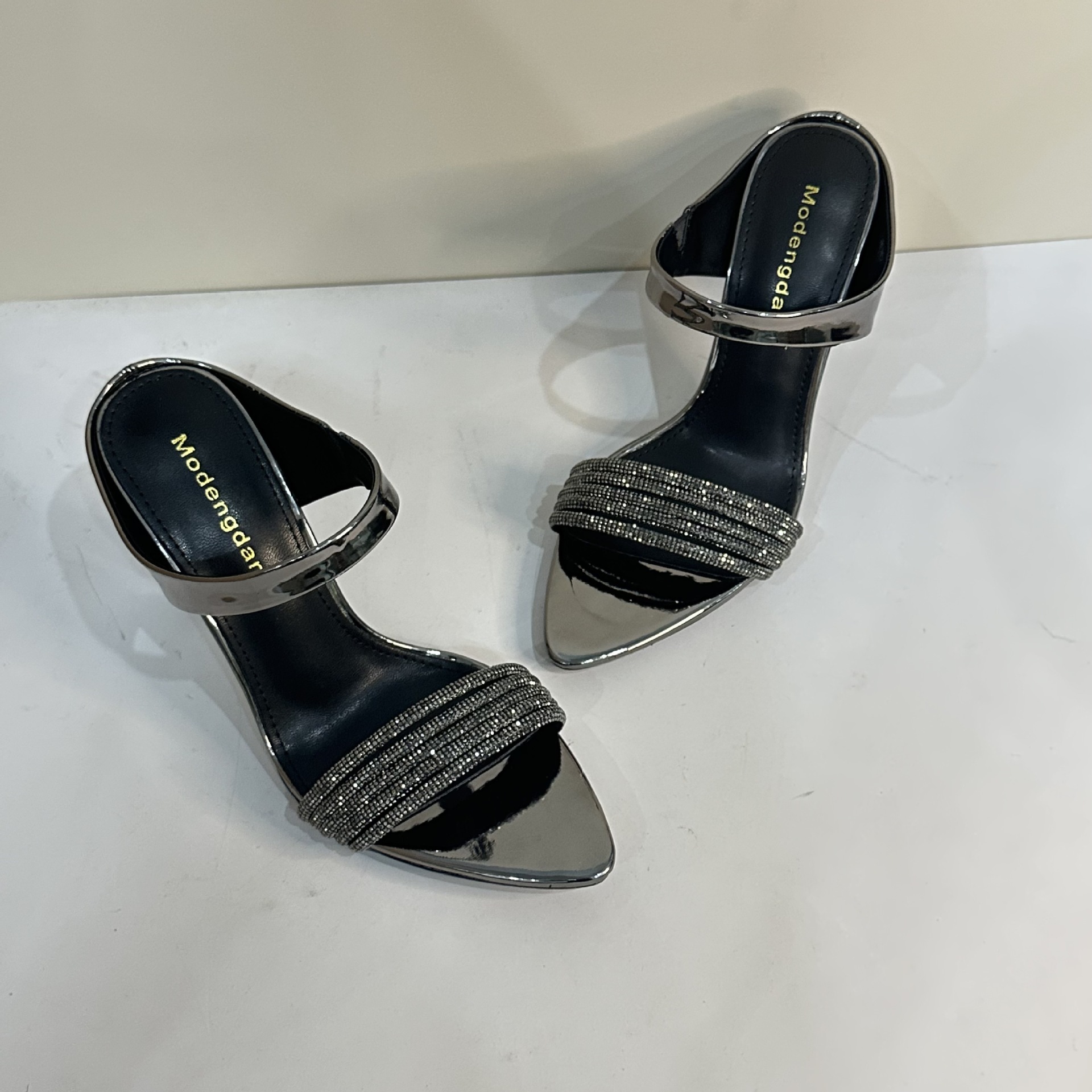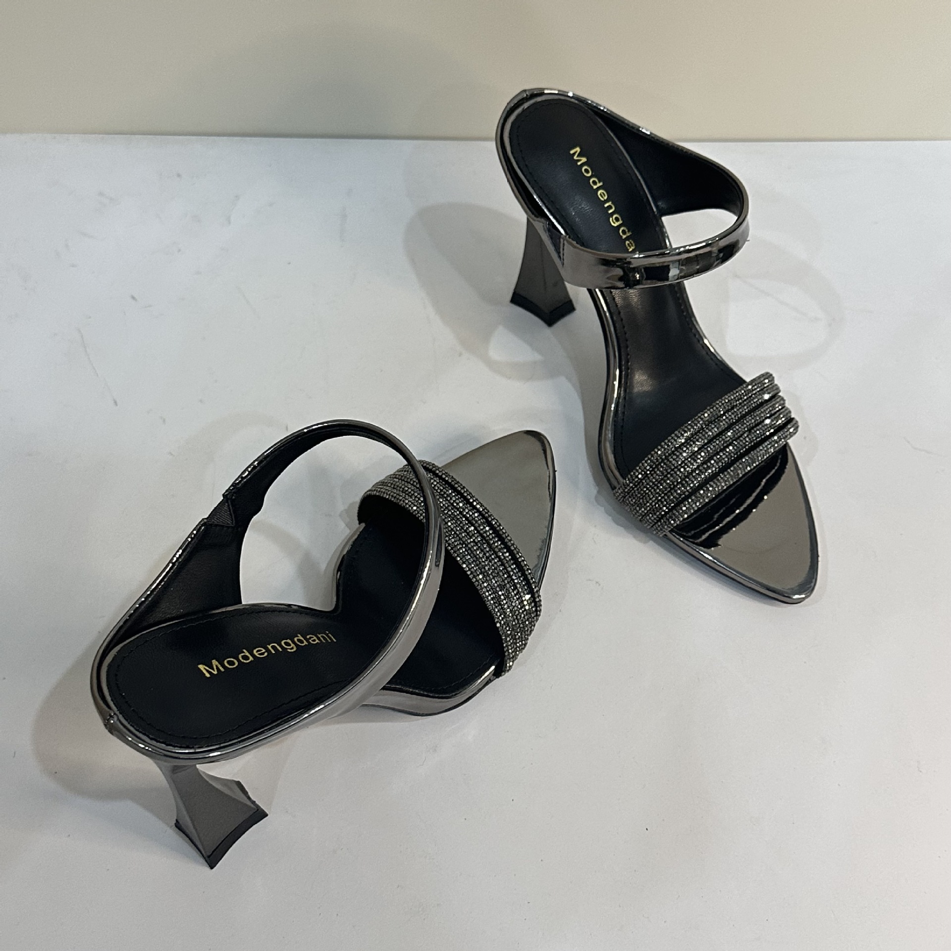 2025 새로운 스타일의 뾰족한 라인스톤 원 스트랩 샌들, 여성용 스틸레토 섹시 오픈 토 하이힐, 여성용 건메탈 샌들