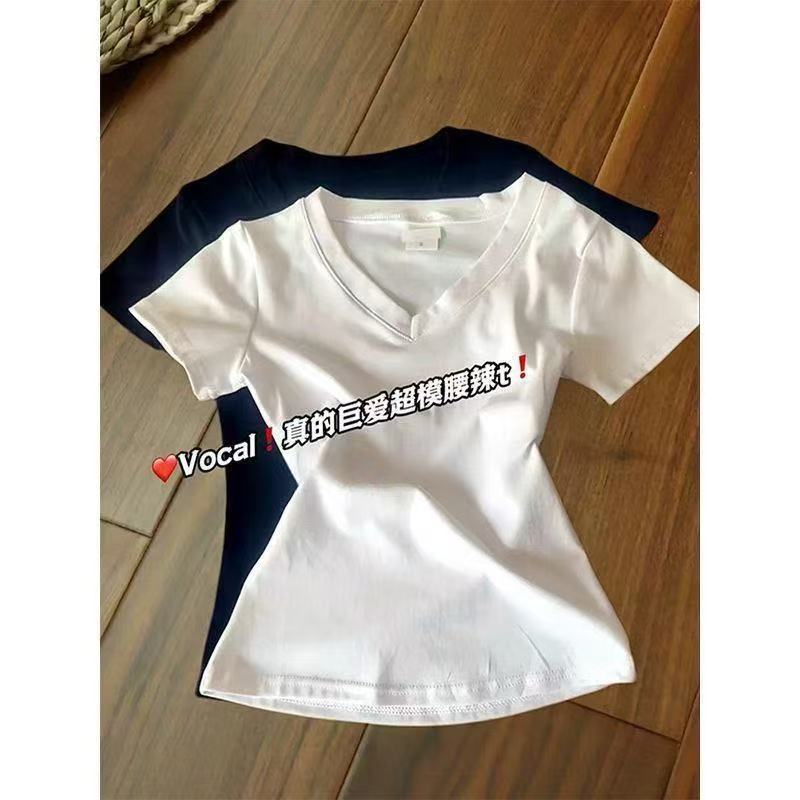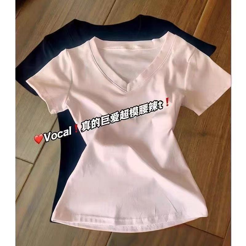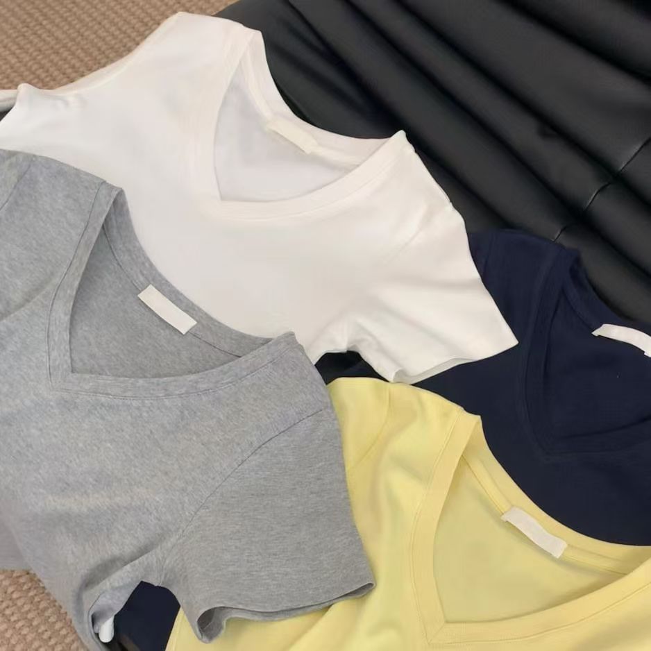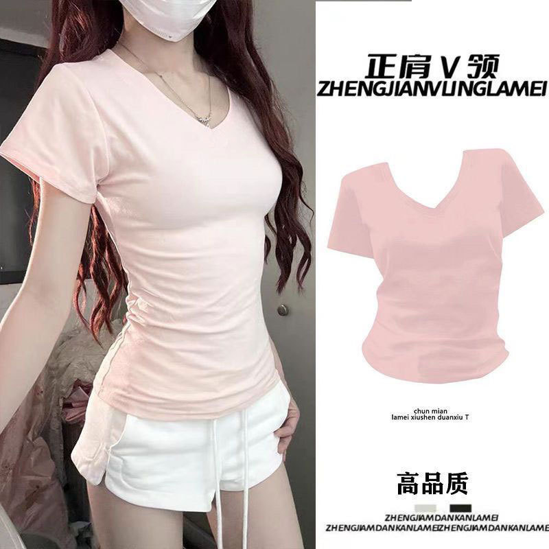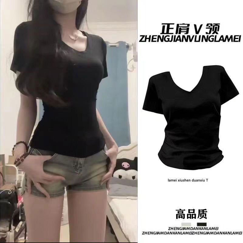 순수 코튼 슬리밍 학생 핫 소녀 오른쪽 어깨 칼라 반팔 티셔츠 여름 2025 여성을위한 새로운 슬림 피트 심플 v 넥 탑