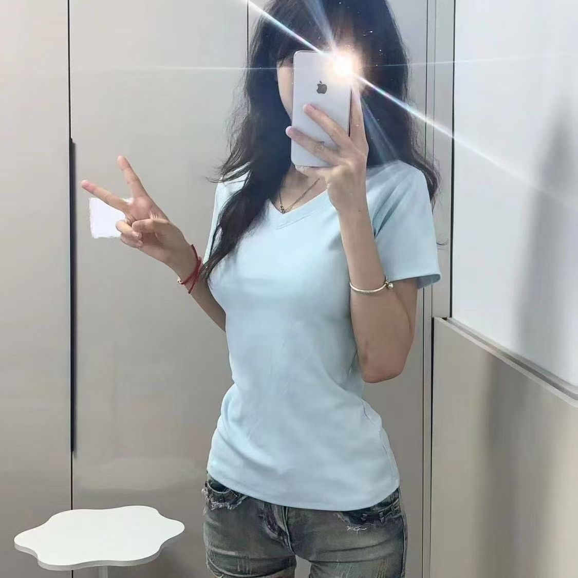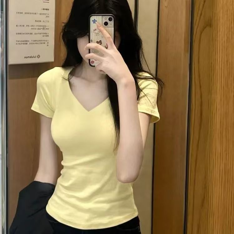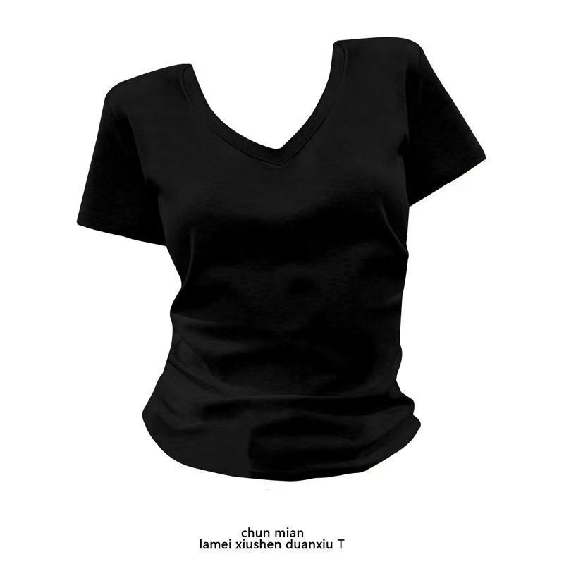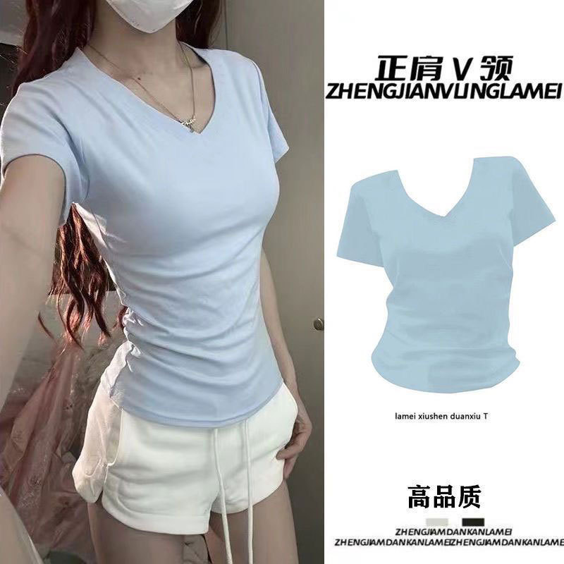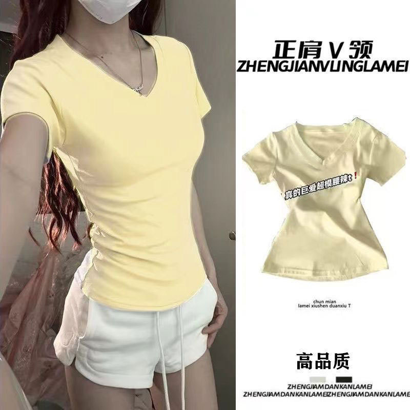 순수 코튼 슬리밍 학생 핫 소녀 오른쪽 어깨 칼라 반팔 티셔츠 여름 2025 여성을위한 새로운 슬림 피트 심플 v 넥 탑