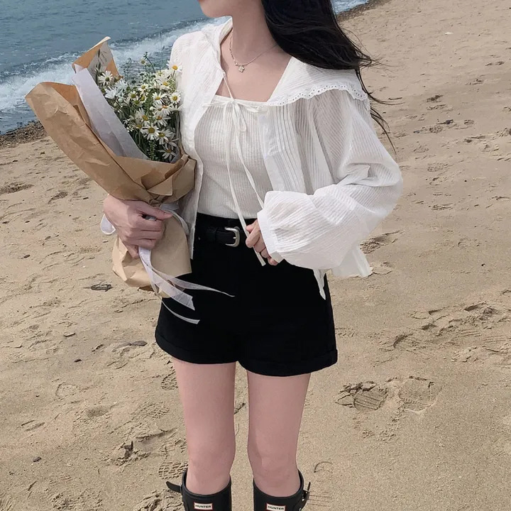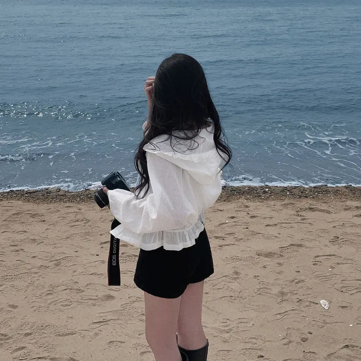 한국 세련된 여름 프랑스 틈새 달콤한 레이스 스플 라이스 후드 프릴 허리 자외선 차단 셔츠 자켓 여성용
