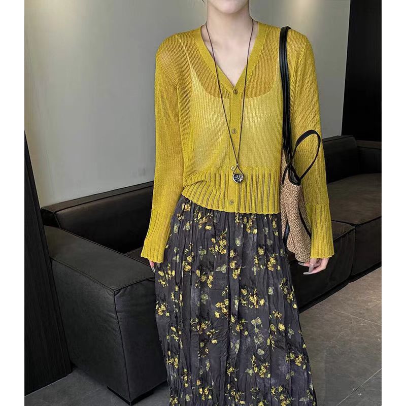 여성을위한 한국 스타일 패션 v 넥 싱글 브레스트 아이스 실크 니트 카디건 2025 여름 새로운 다목적 긴팔 자외선 차단 탑스토어 가기