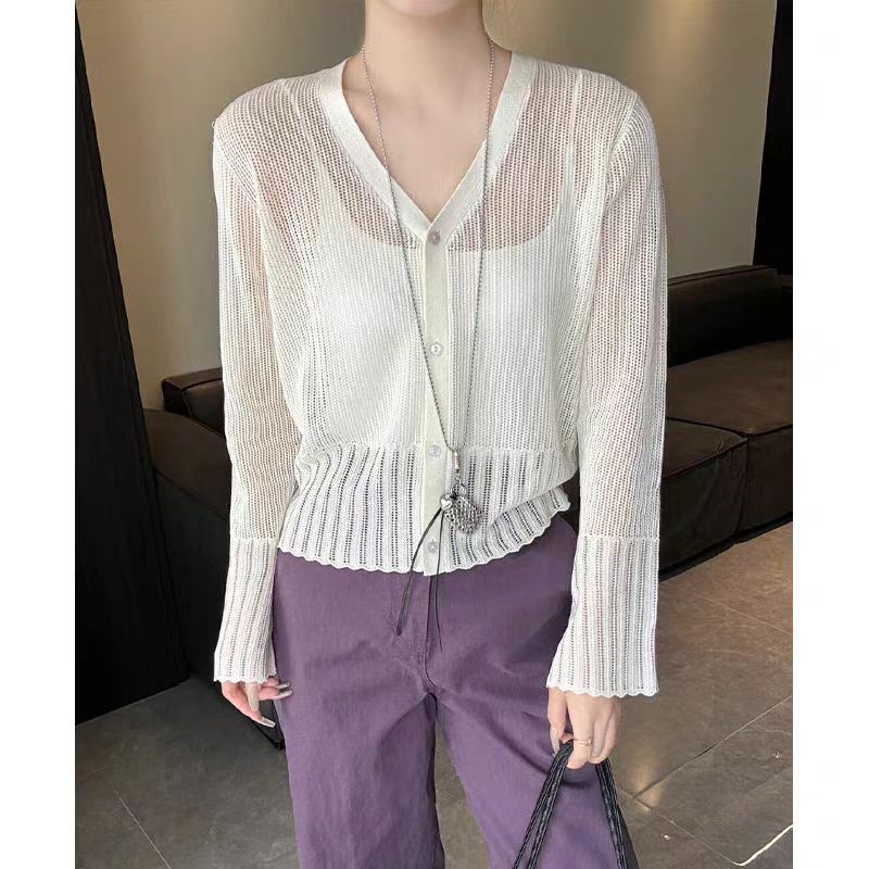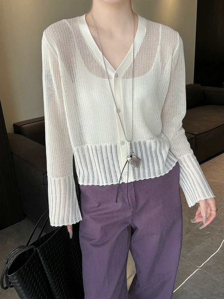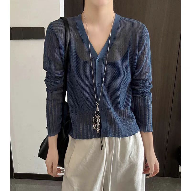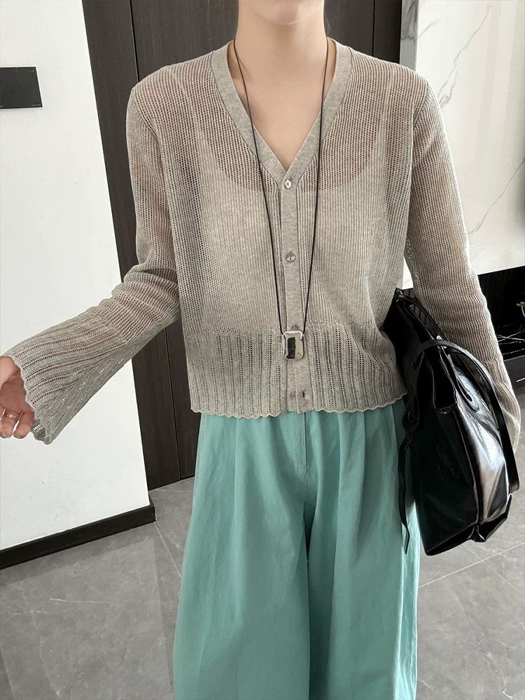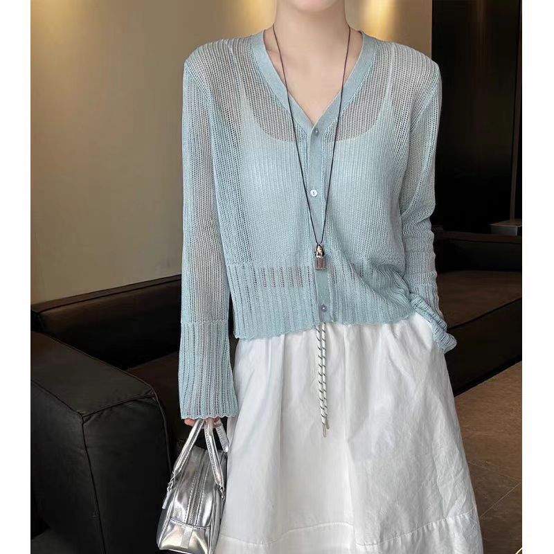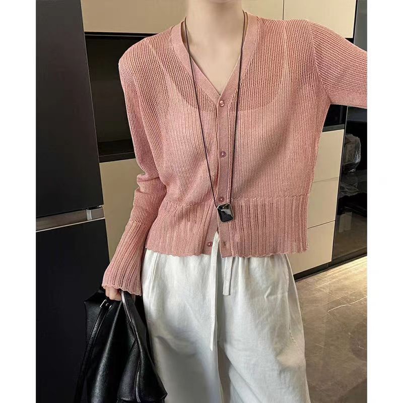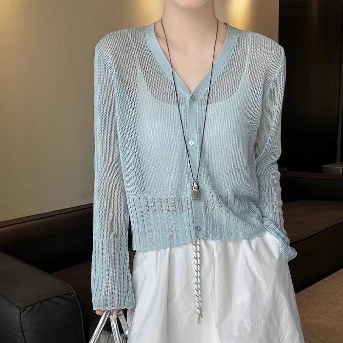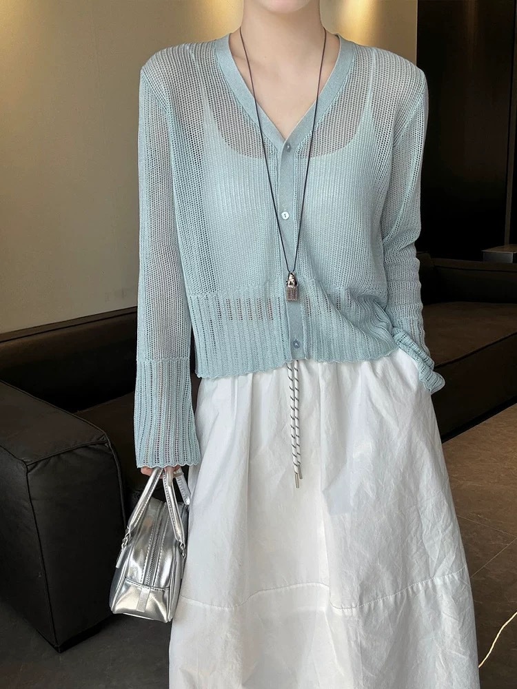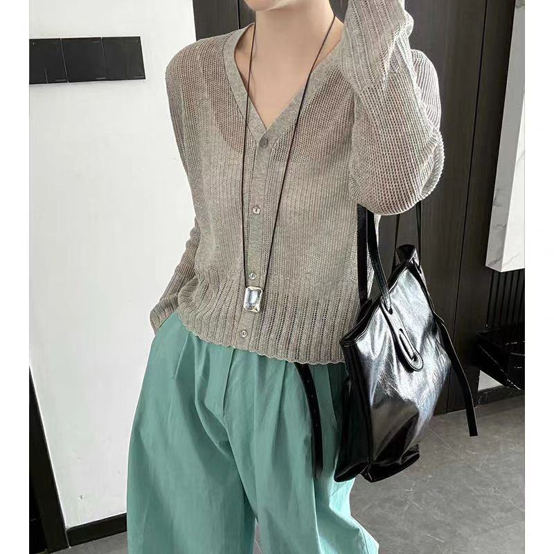 여성을위한 한국 스타일 패션 v 넥 싱글 브레스트 아이스 실크 니트 카디건 2025 여름 새로운 다목적 긴팔 자외선 차단 탑