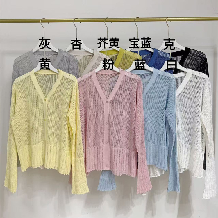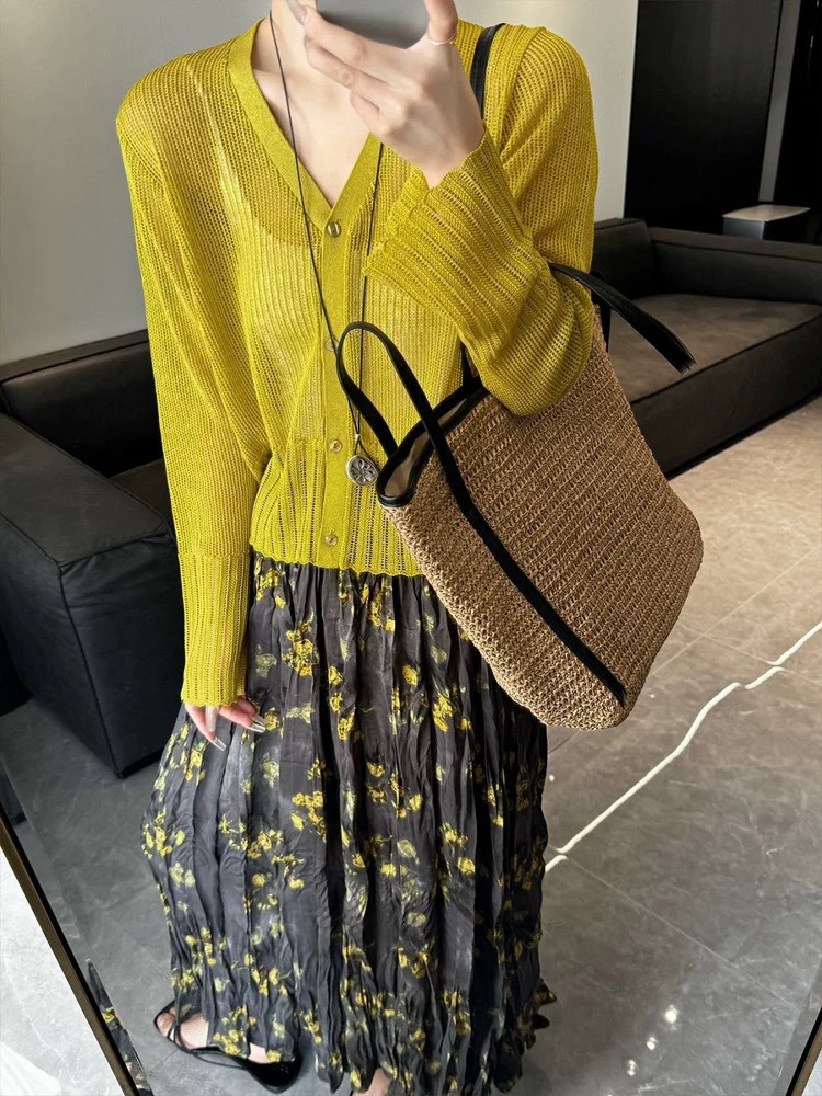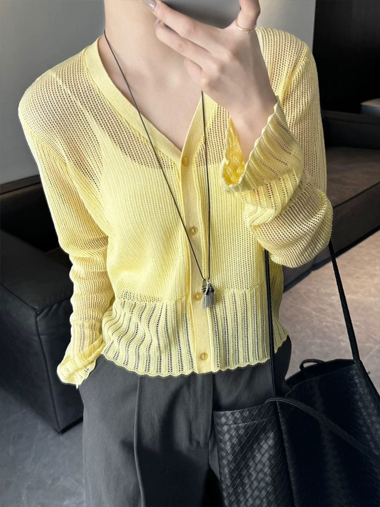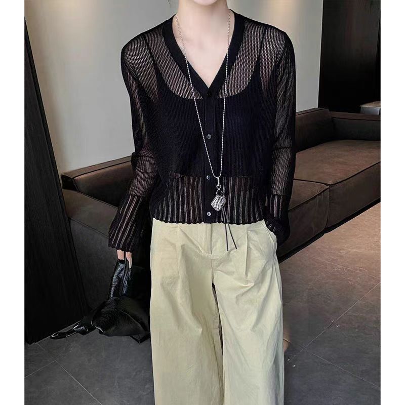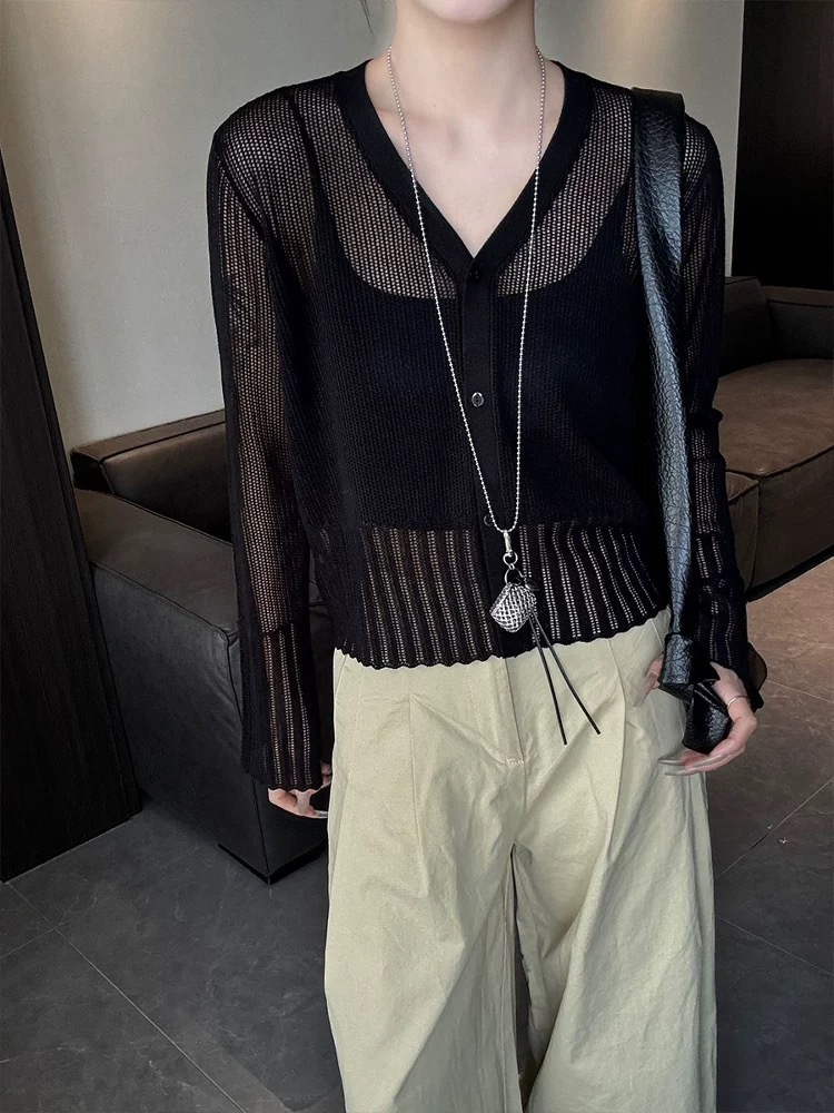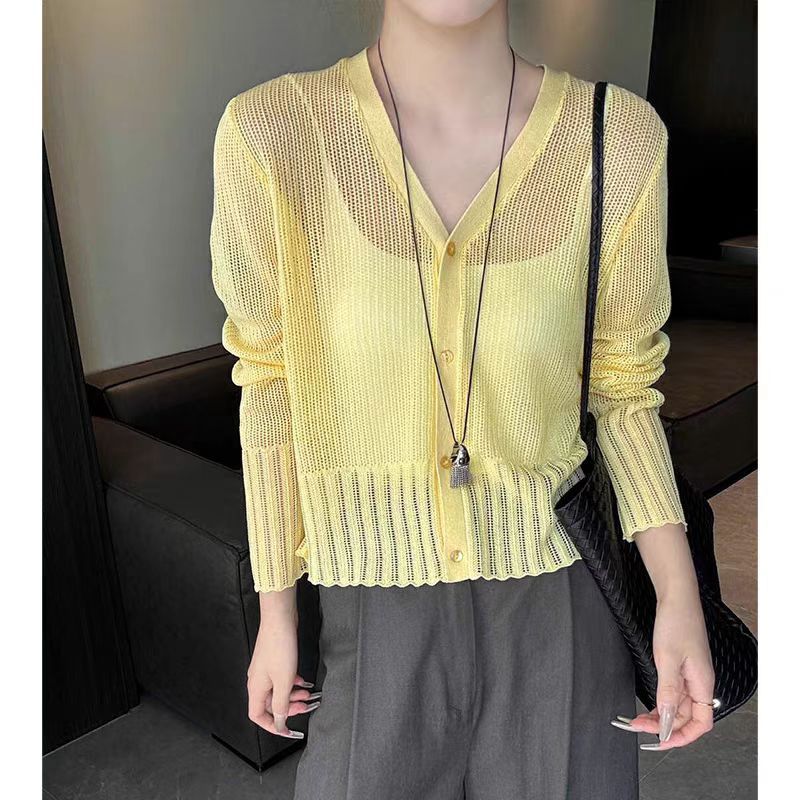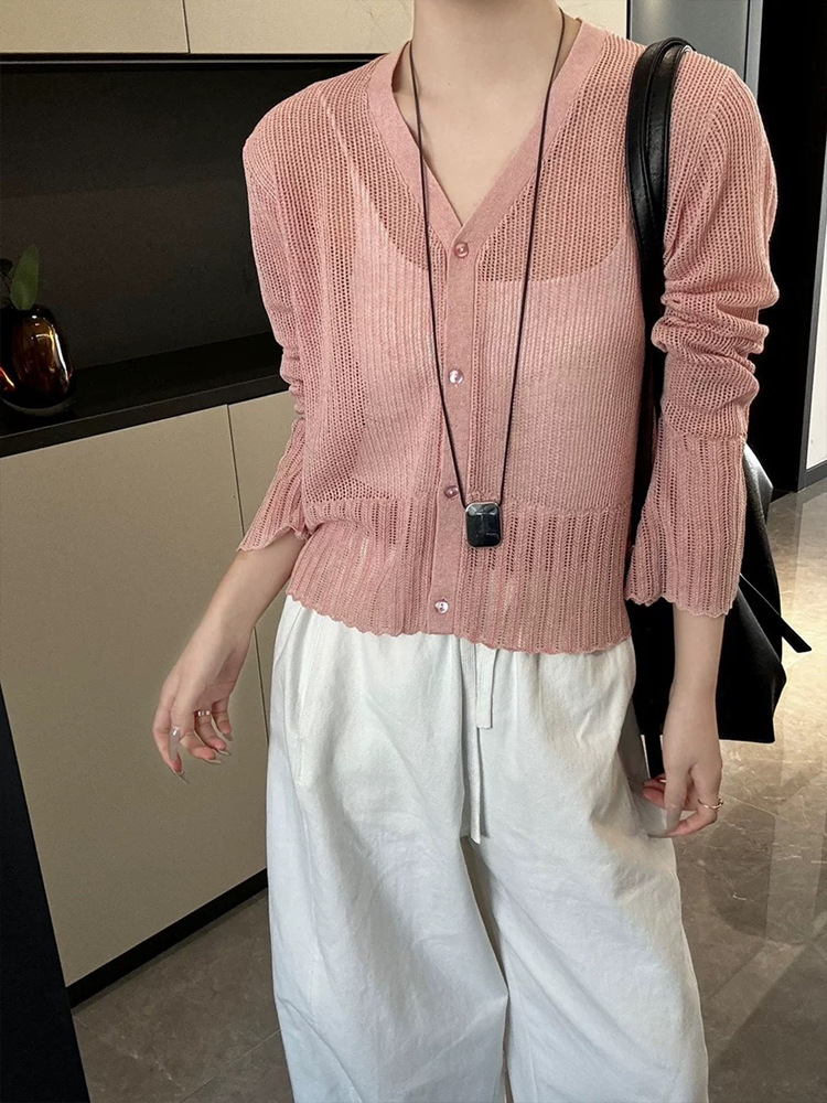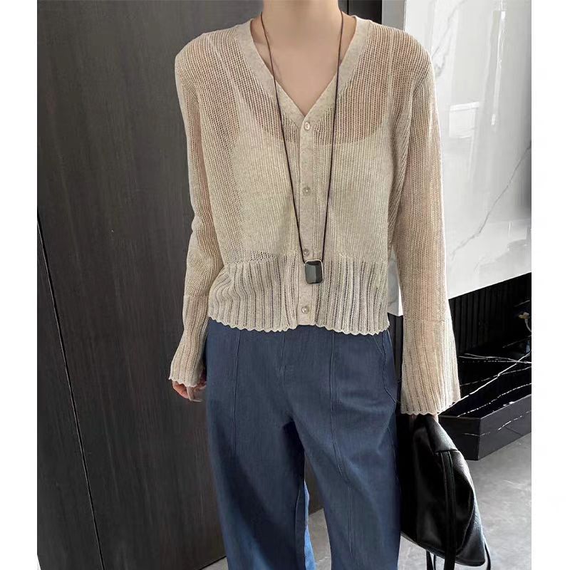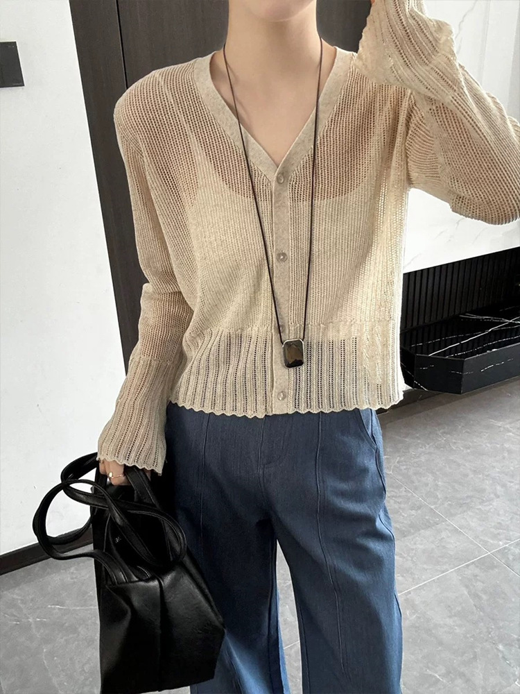 여성을위한 한국 스타일 패션 v 넥 싱글 브레스트 아이스 실크 니트 카디건 2025 여름 새로운 다목적 긴팔 자외선 차단 탑