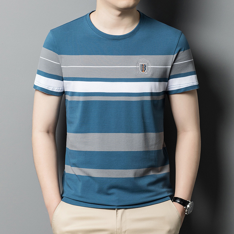 라운드 넥 반팔 티셔츠 남성용 자수 티셔츠 여름 반팔 탑 청년 및 중년 캐주얼 스트라이프 티셔츠