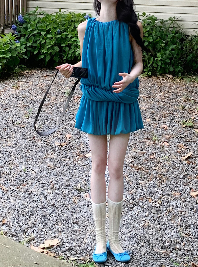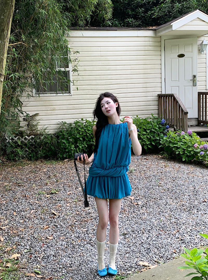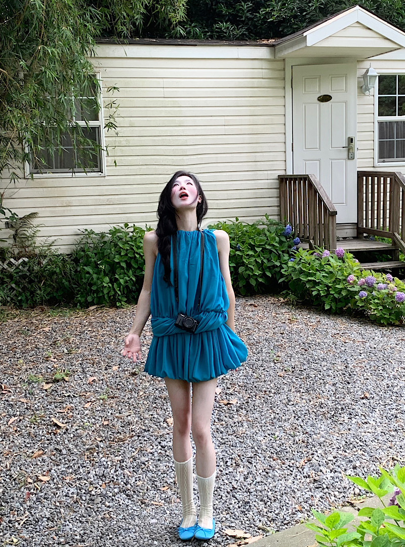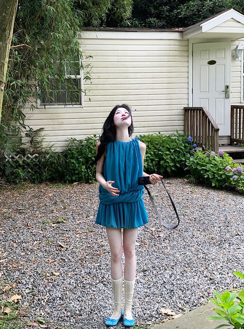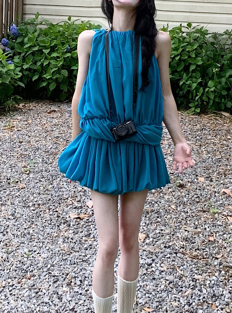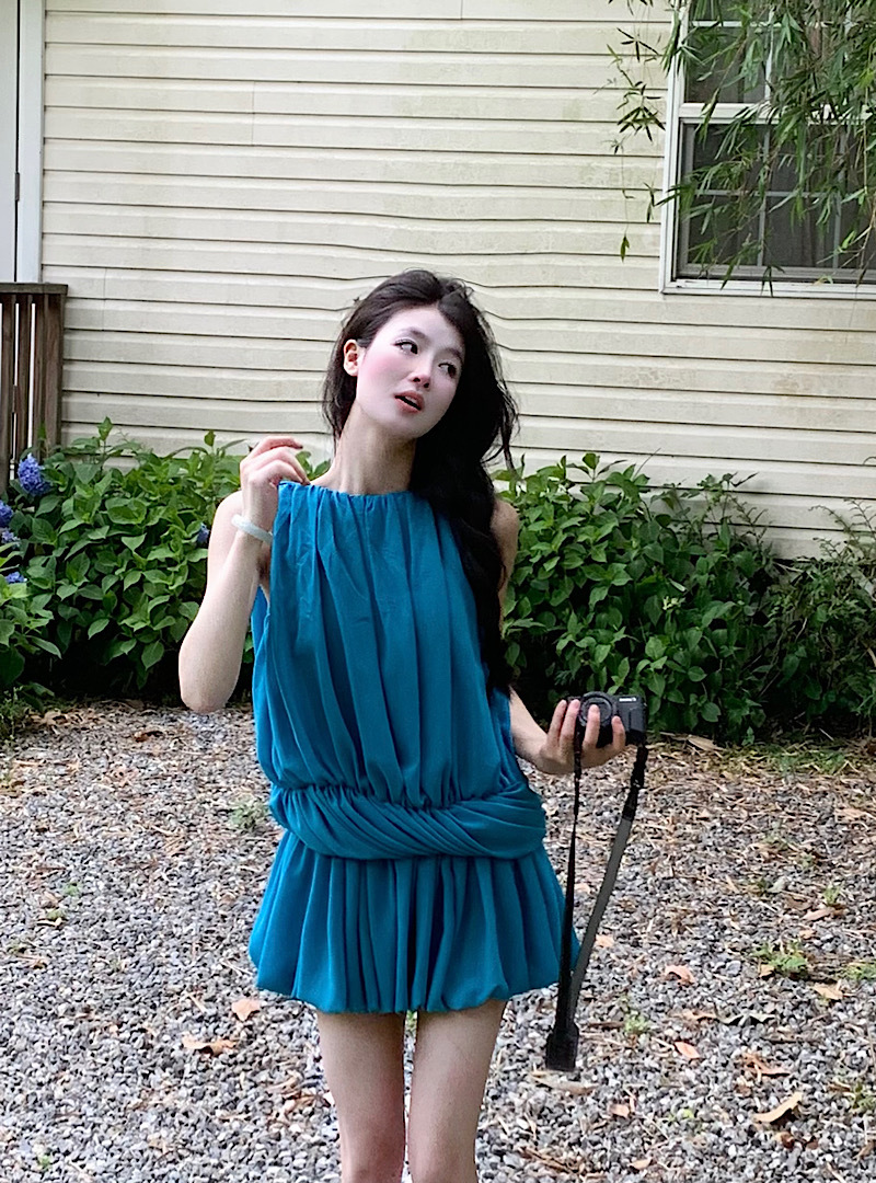 2025 새로운 여름 스타일 공작 블루 쉬폰 세련된 하이 엔드 불규칙한 스탠드 업 주름 민소매 드레스 여성 의류스토어 가기