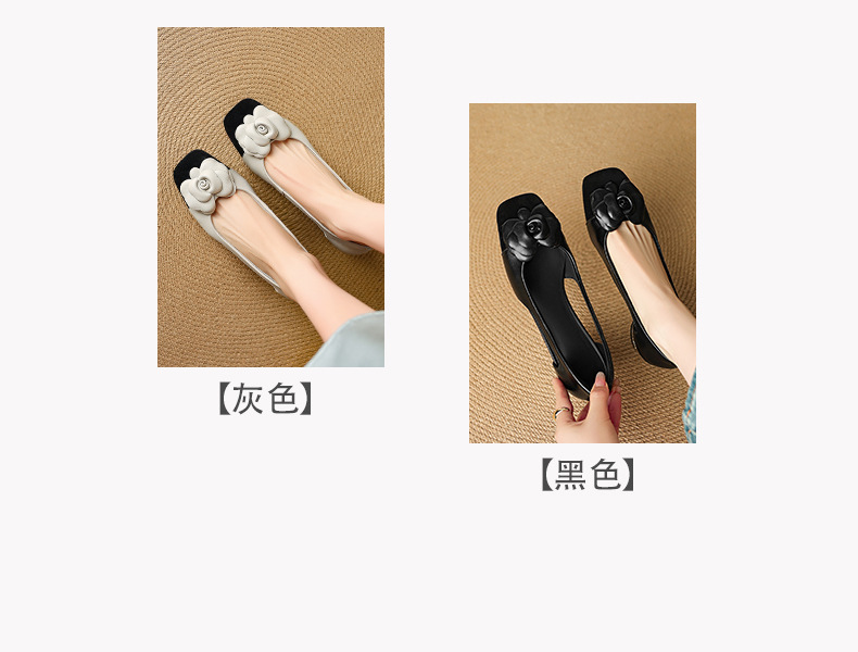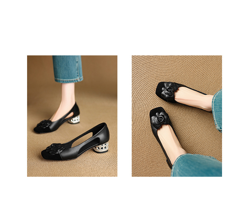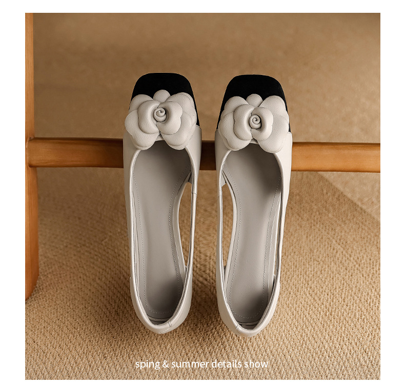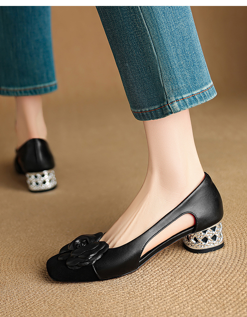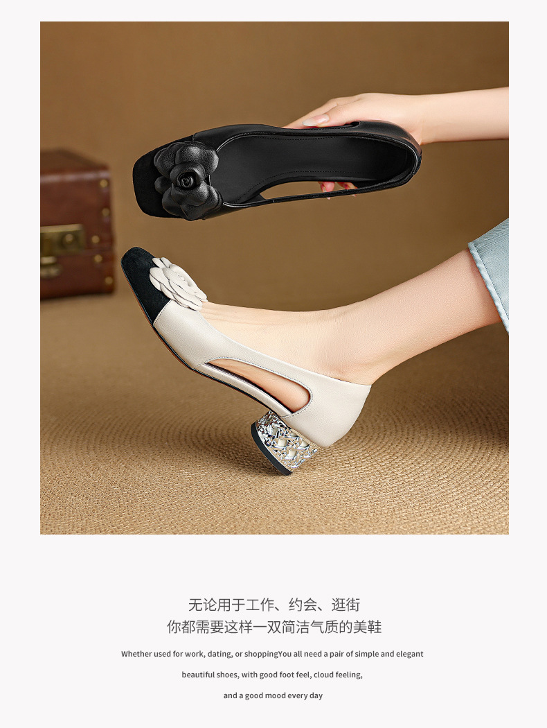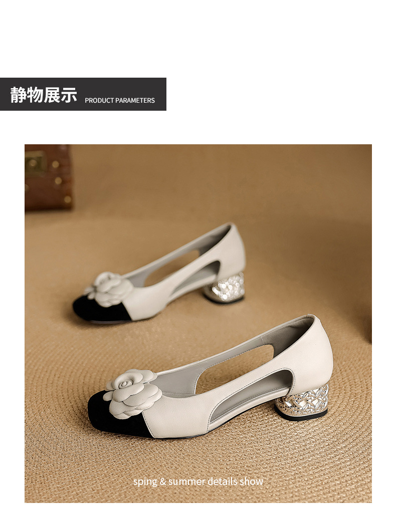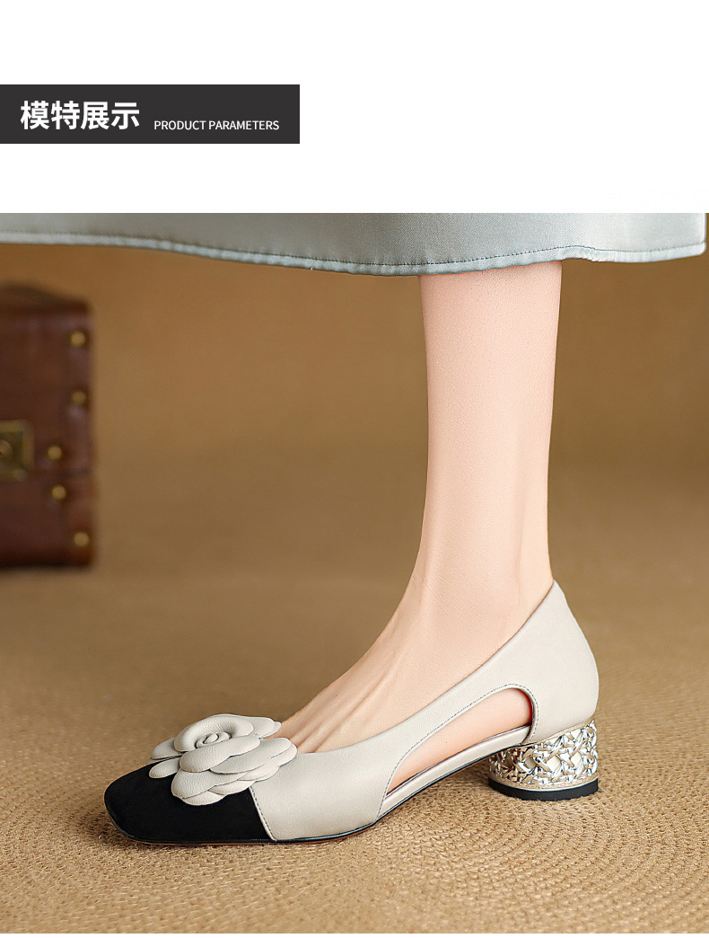 1층 소가죽 프렌치 미드힐 컬러블로킹 동백 포인티드 토 슈즈 25 봄, 가을 두꺼운 굽 얕은 입구 다용도 여성화