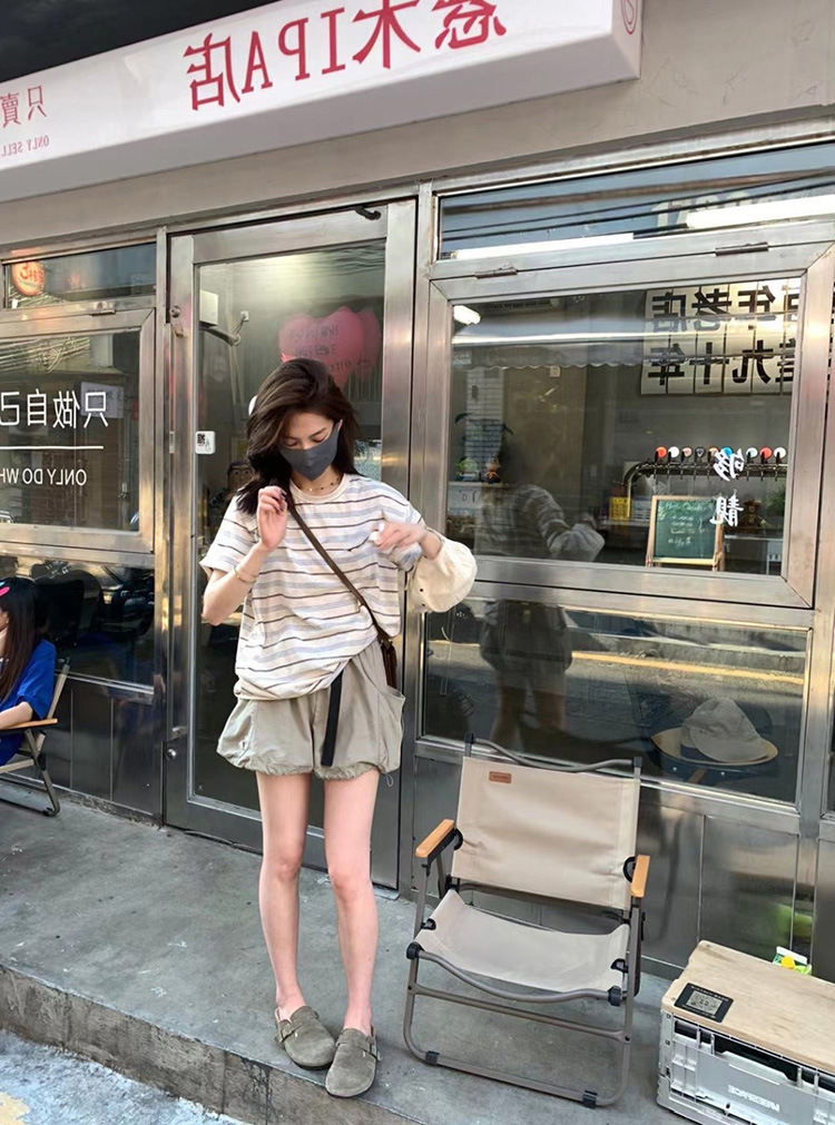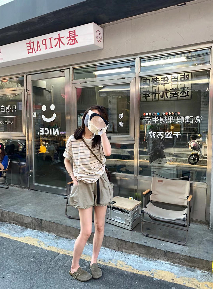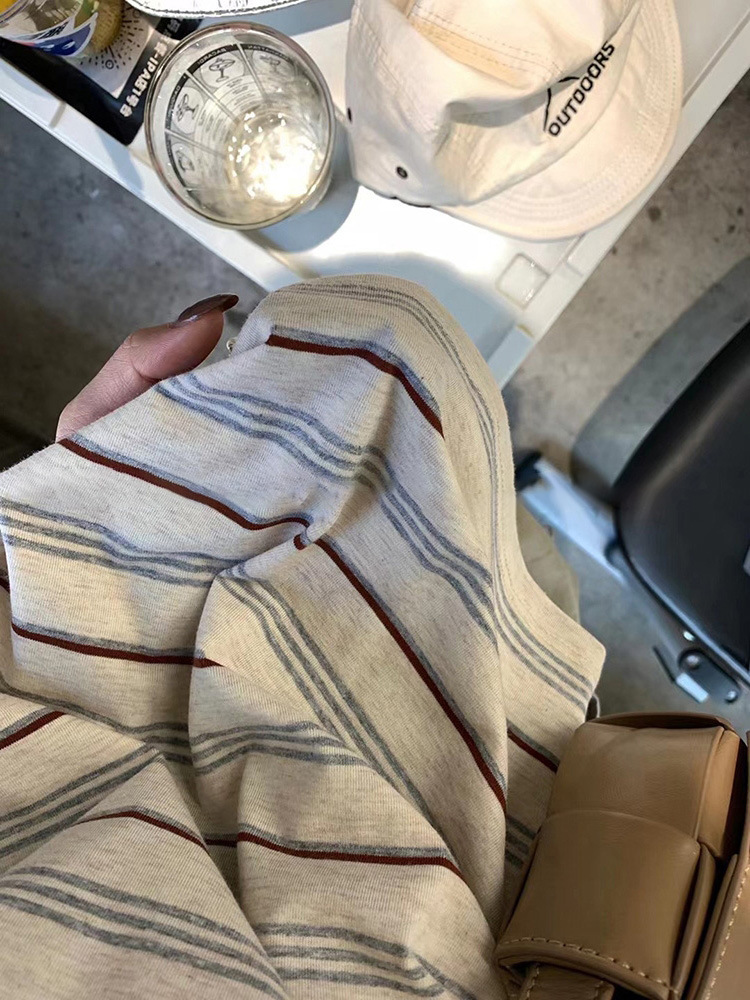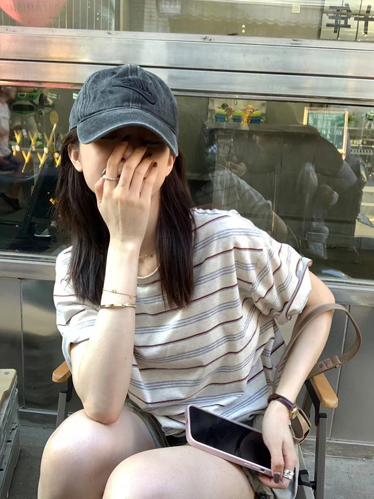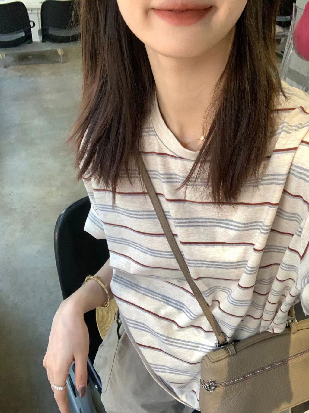 여성을위한 대비 색 줄무늬 반팔 티셔츠 여름 2025 새로운 느슨한 캐주얼 디자인 틈새 반팔 티셔츠 탑스토어 가기