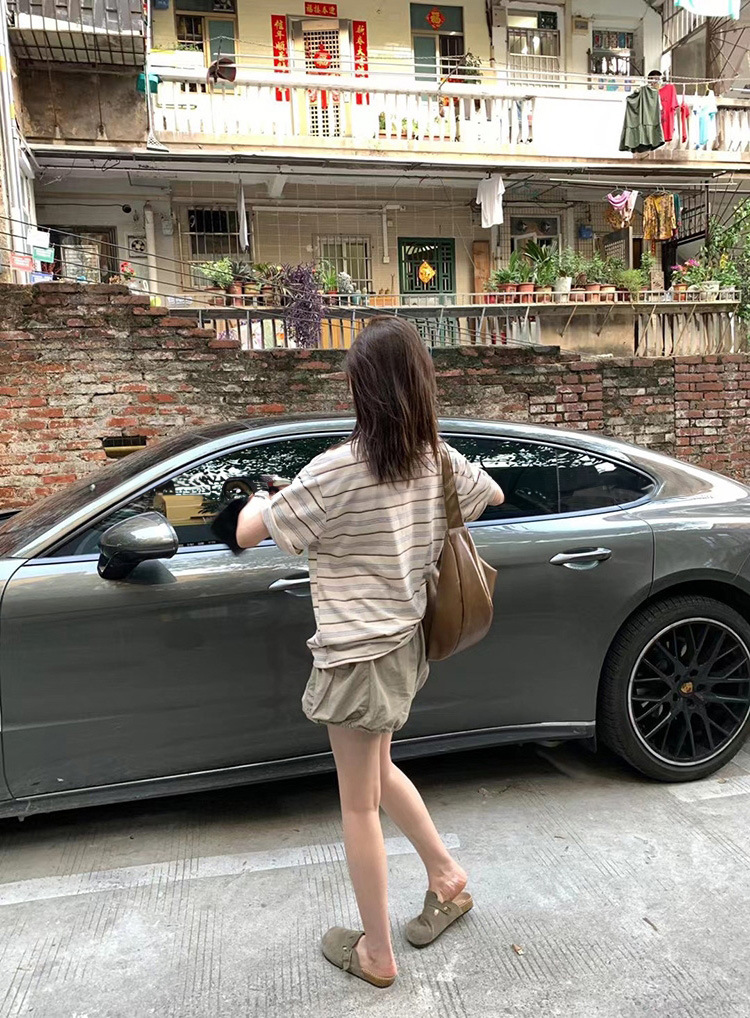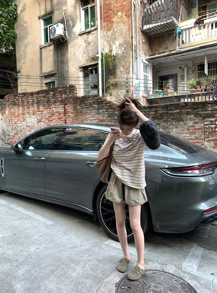 여성을위한 대비 색 줄무늬 반팔 티셔츠 여름 2025 새로운 느슨한 캐주얼 디자인 틈새 반팔 티셔츠 탑