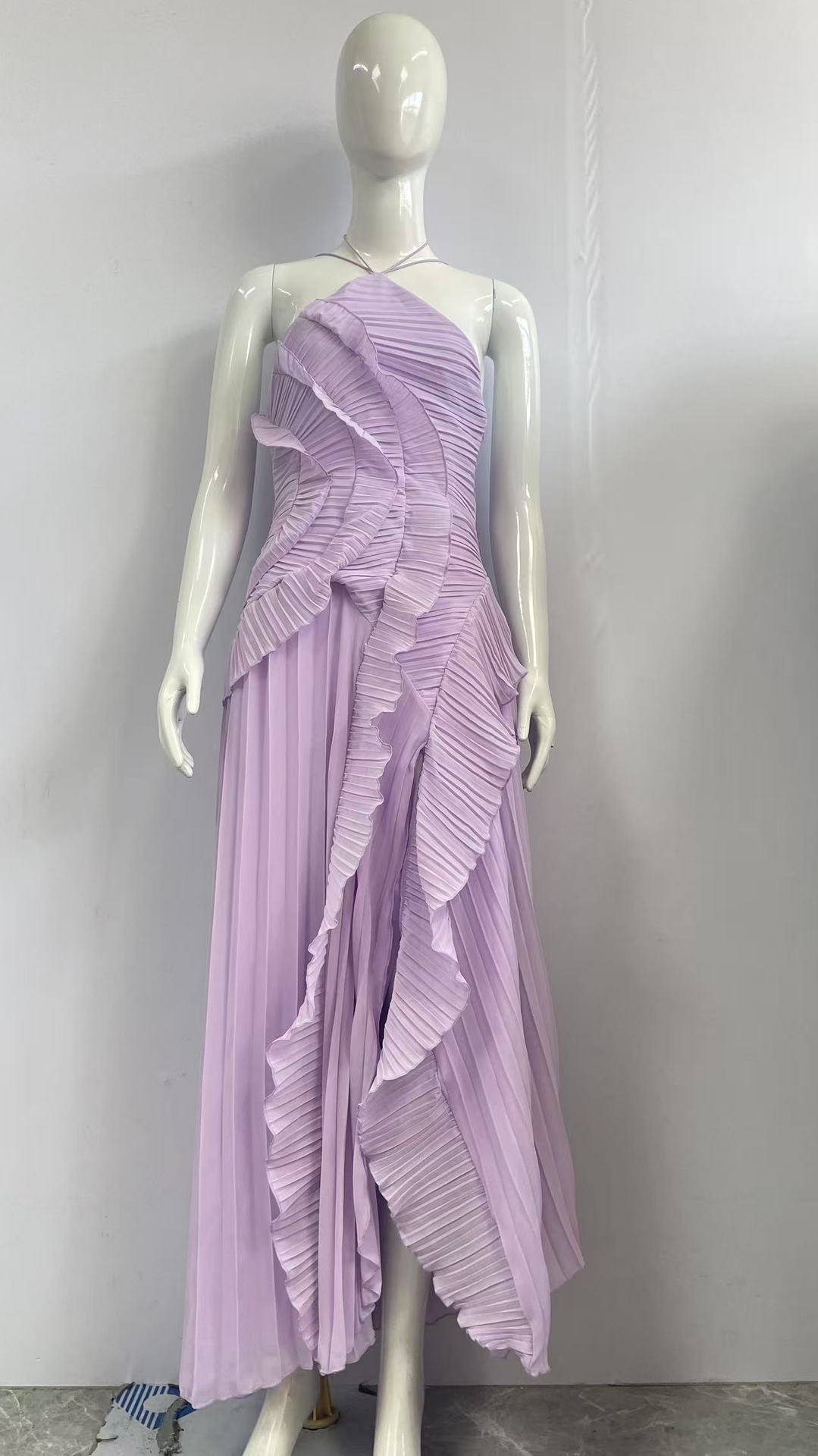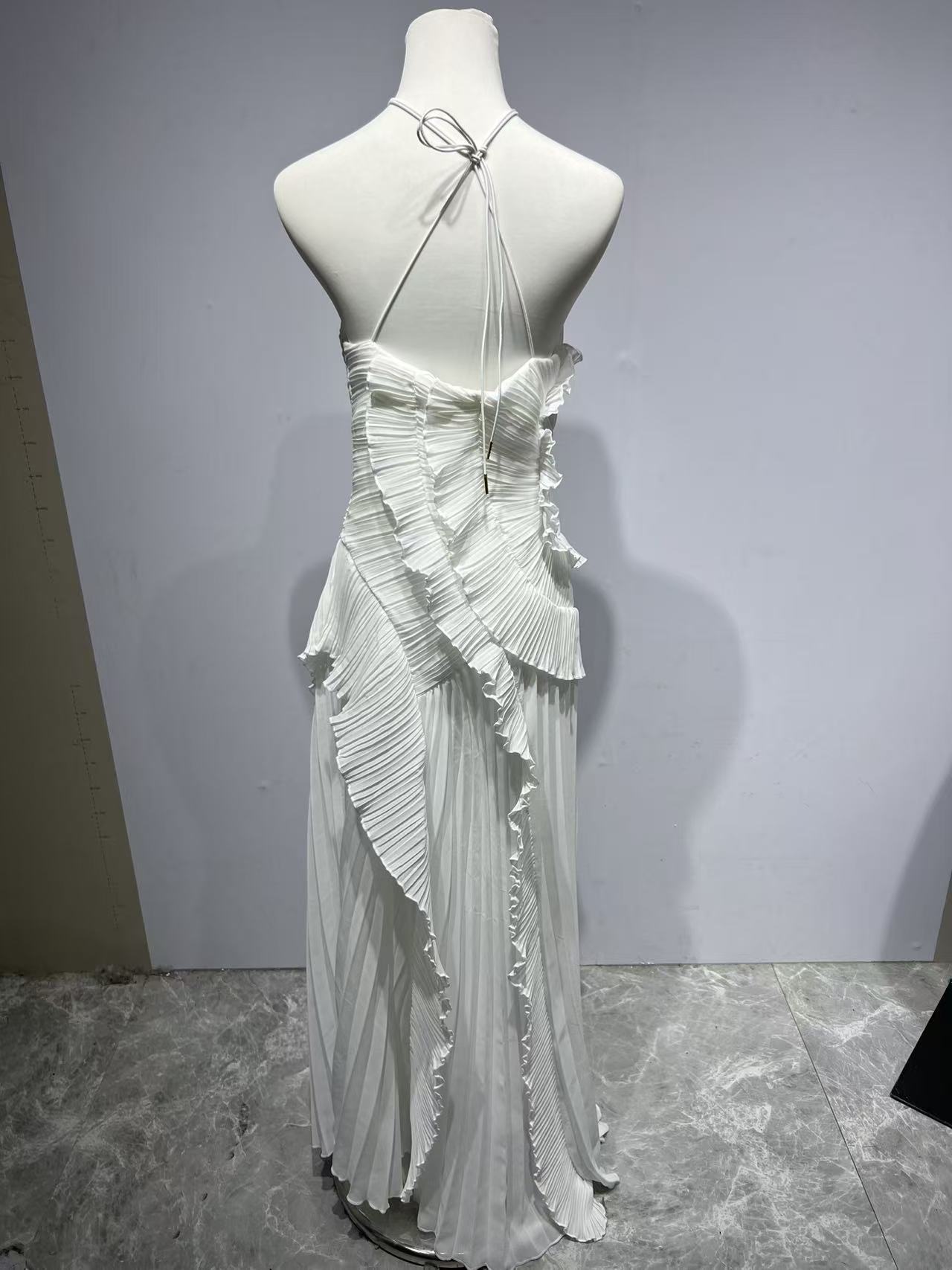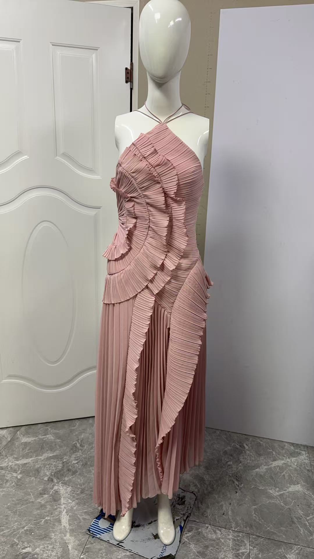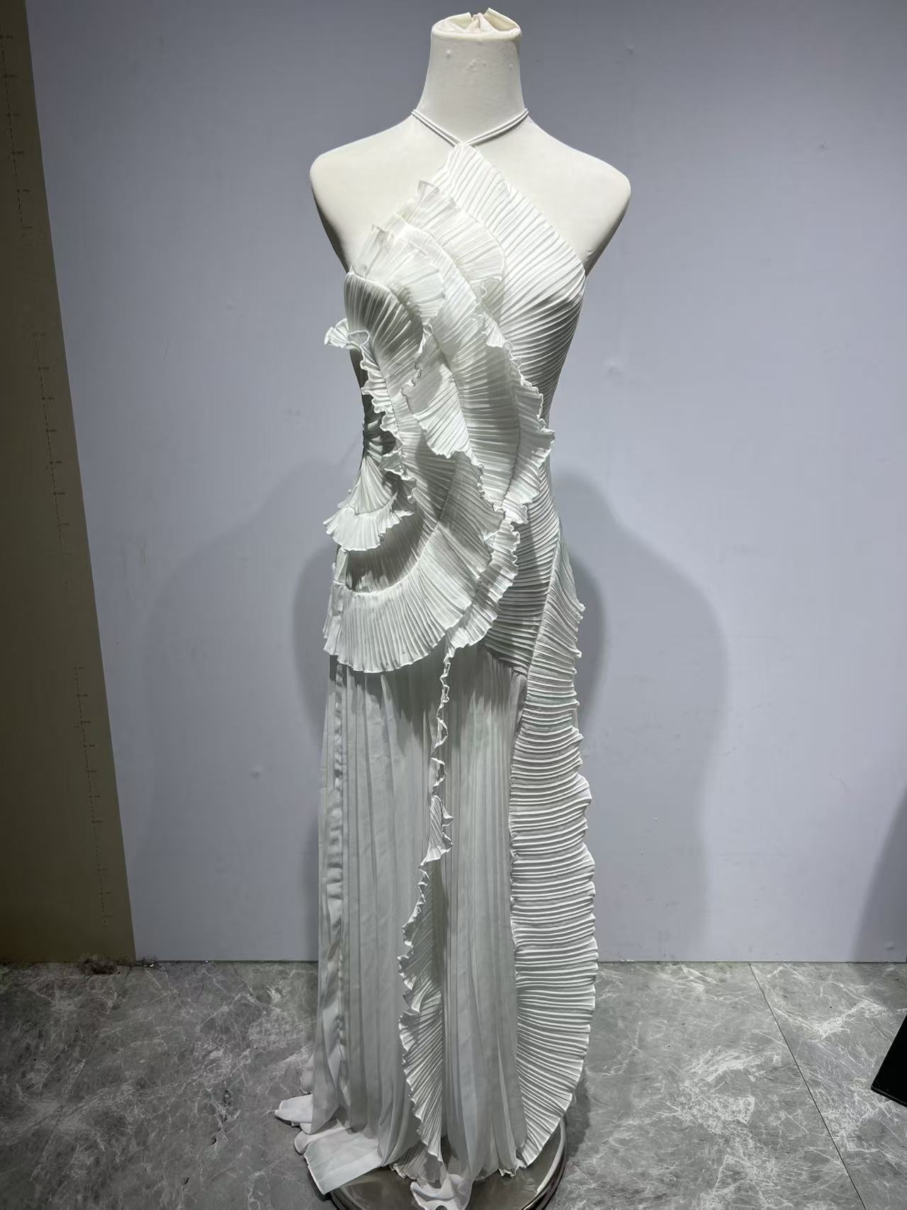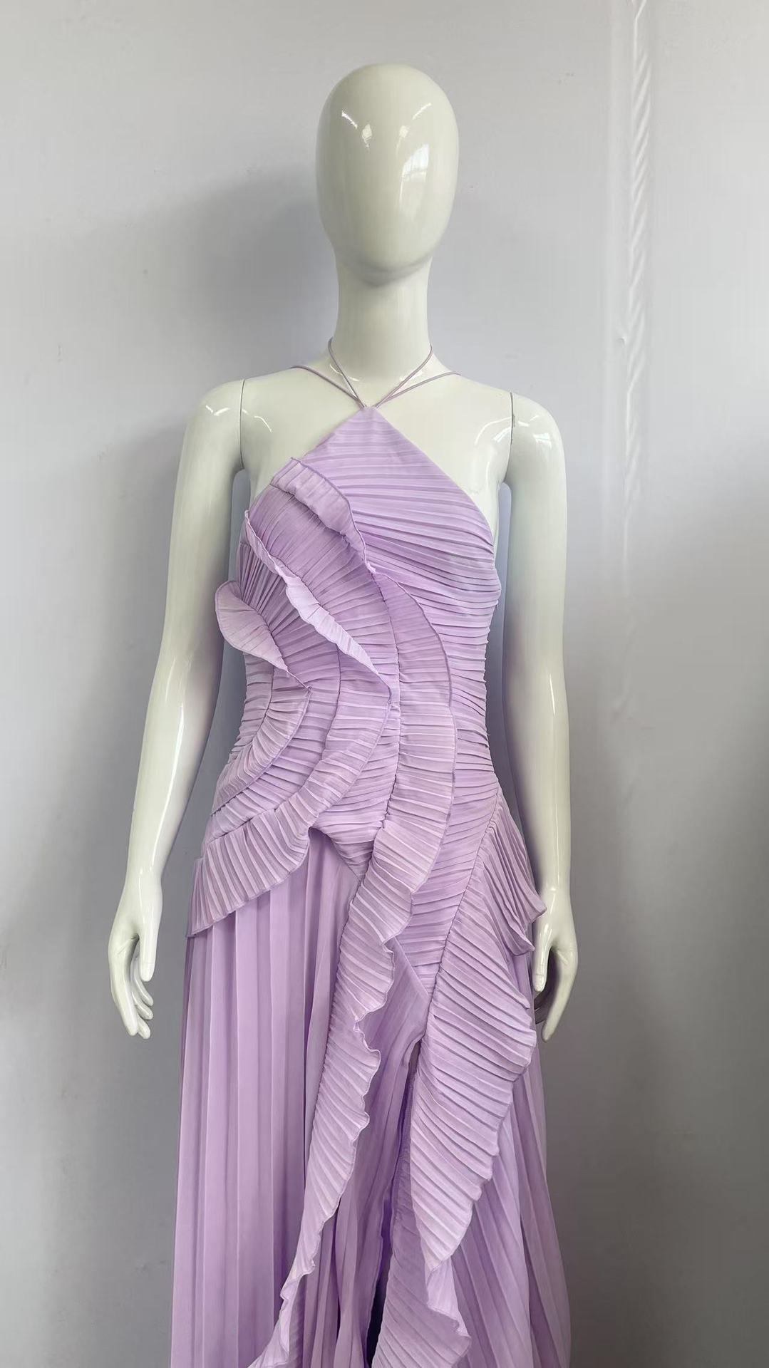 여성용 고급 쉬폰 드레스, 러플 주름 디자인, 슬리밍 중간 길이 스커트, 유럽 및 미국 패션스토어 가기