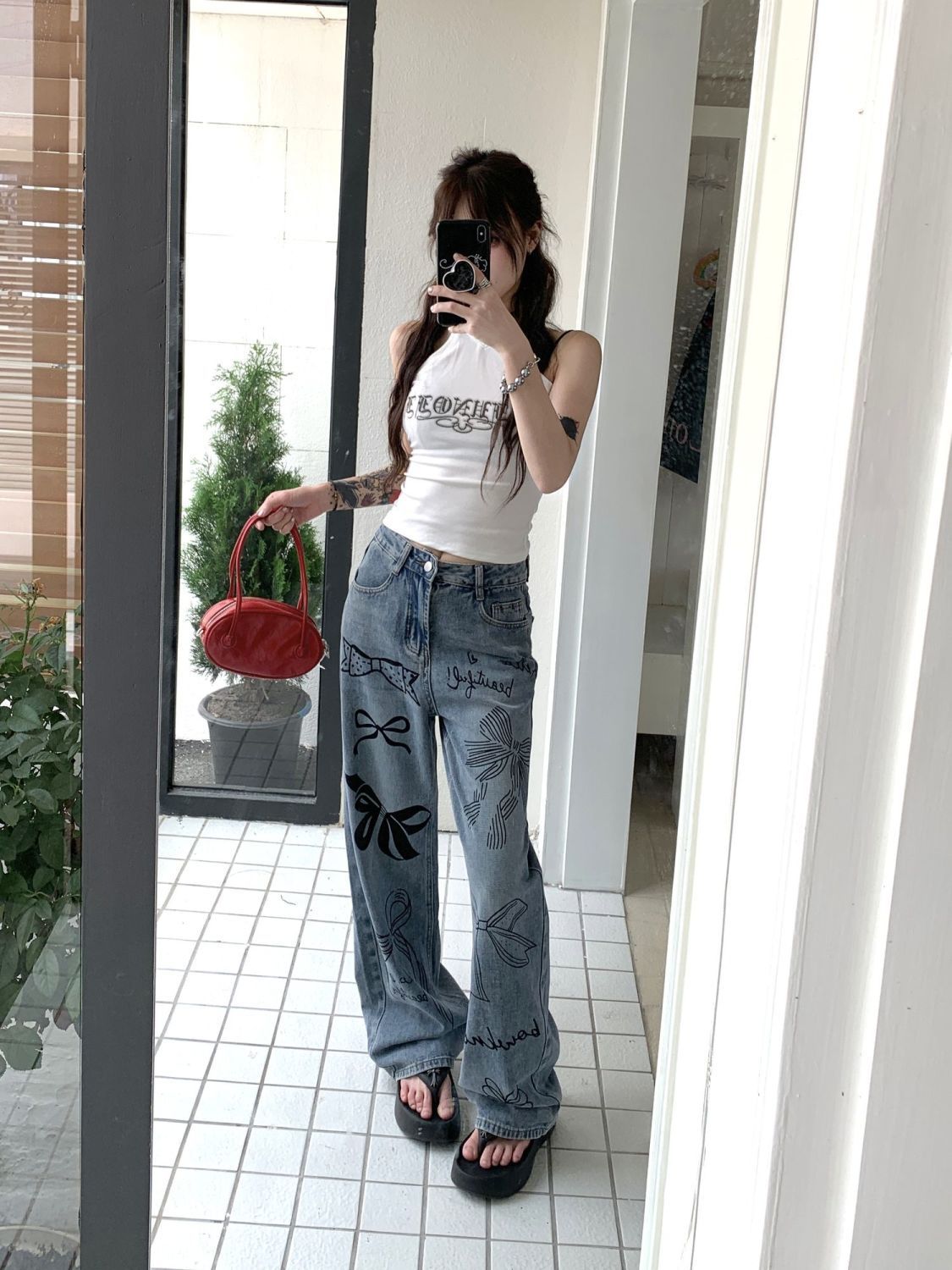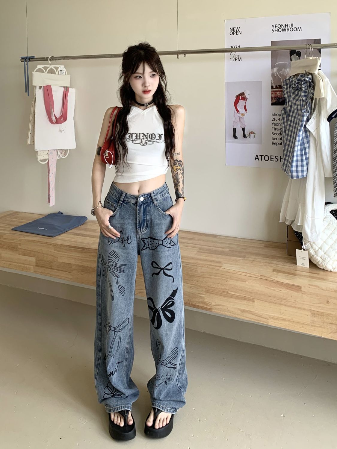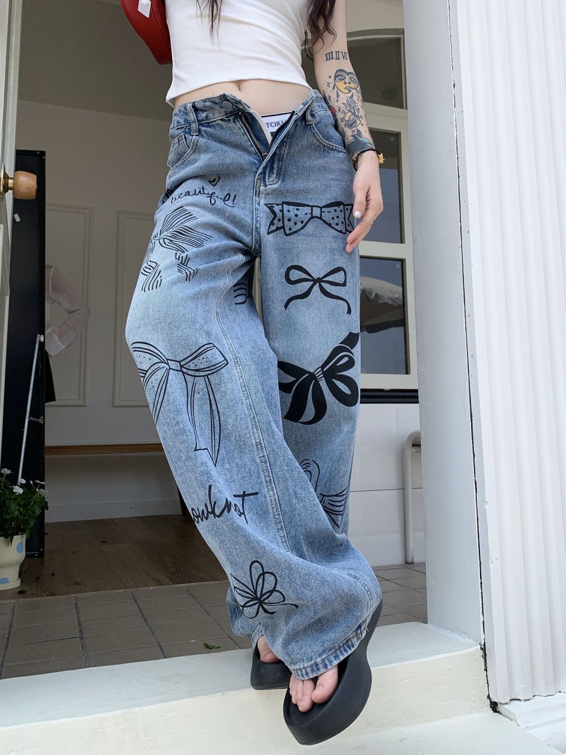 여성을 위한 디자인 니치 그래피티 청바지, 봄, 가을 새로운 스타일, 헤비 프린트, 루즈하고 다재다능한 와이드 레그 바닥 길이 바지스토어 가기