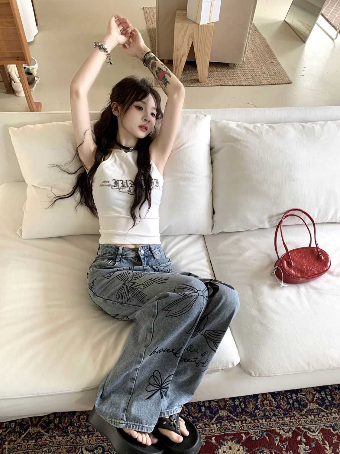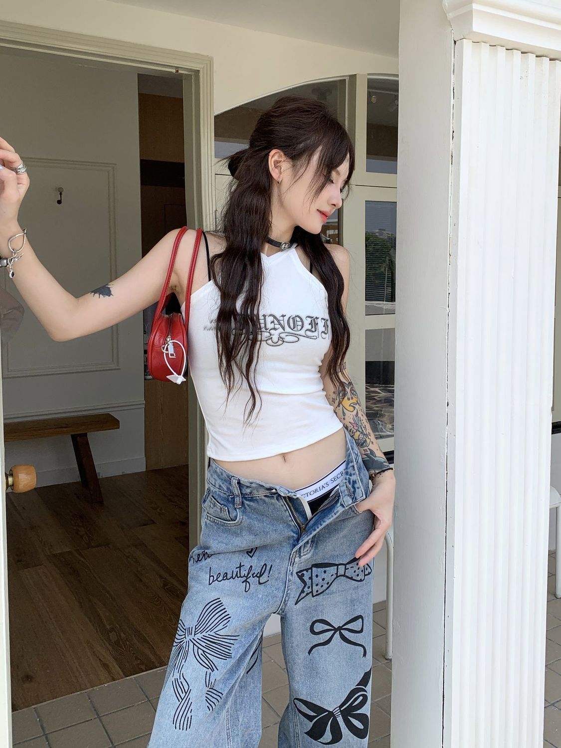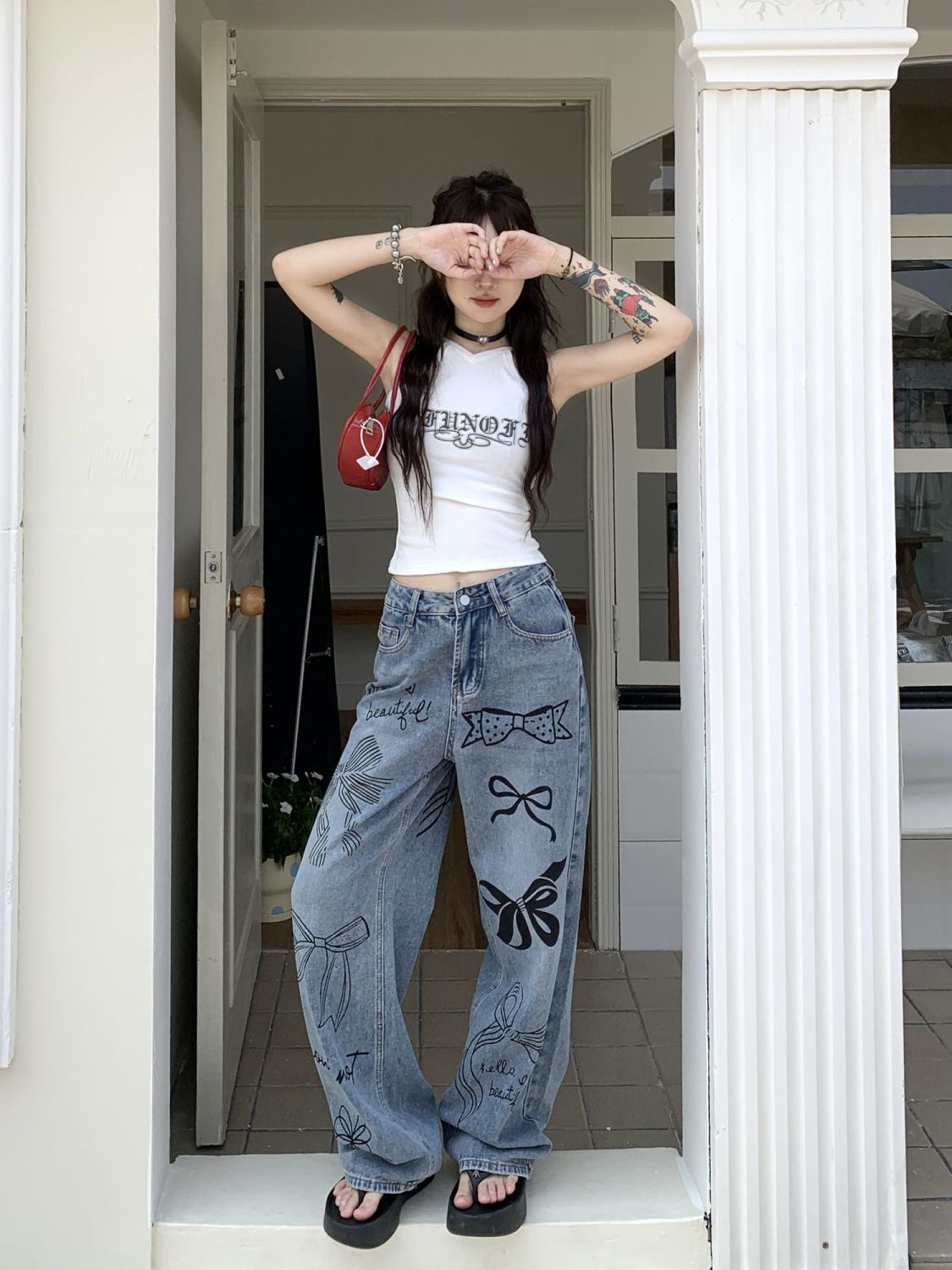 여성을 위한 디자인 니치 그래피티 청바지, 봄, 가을 새로운 스타일, 헤비 프린트, 루즈하고 다재다능한 와이드 레그 바닥 길이 바지스토어 가기