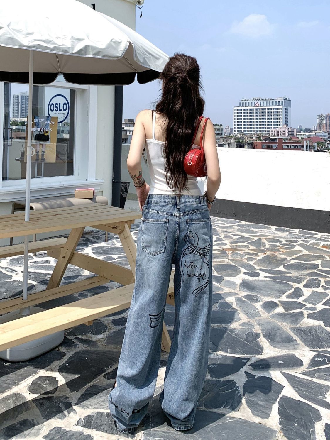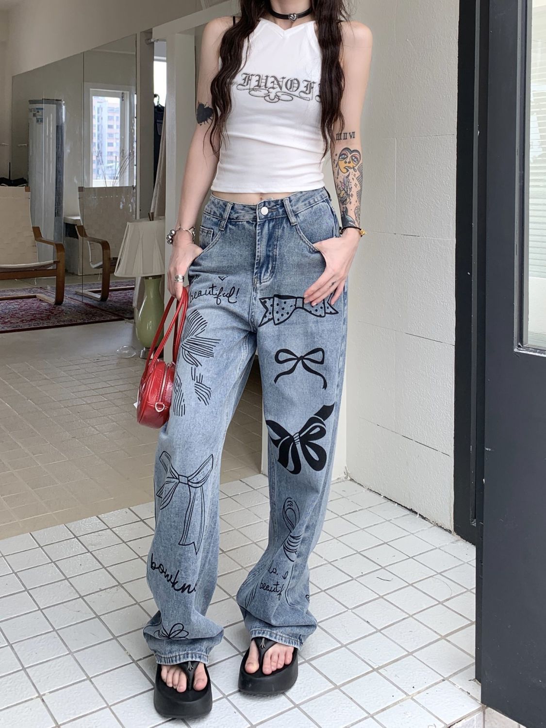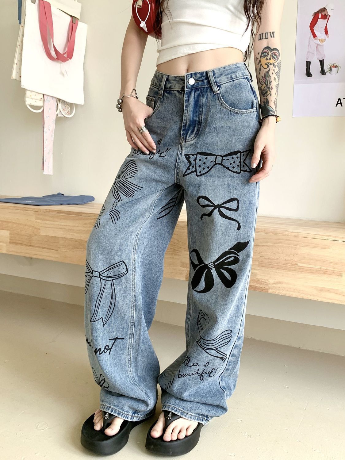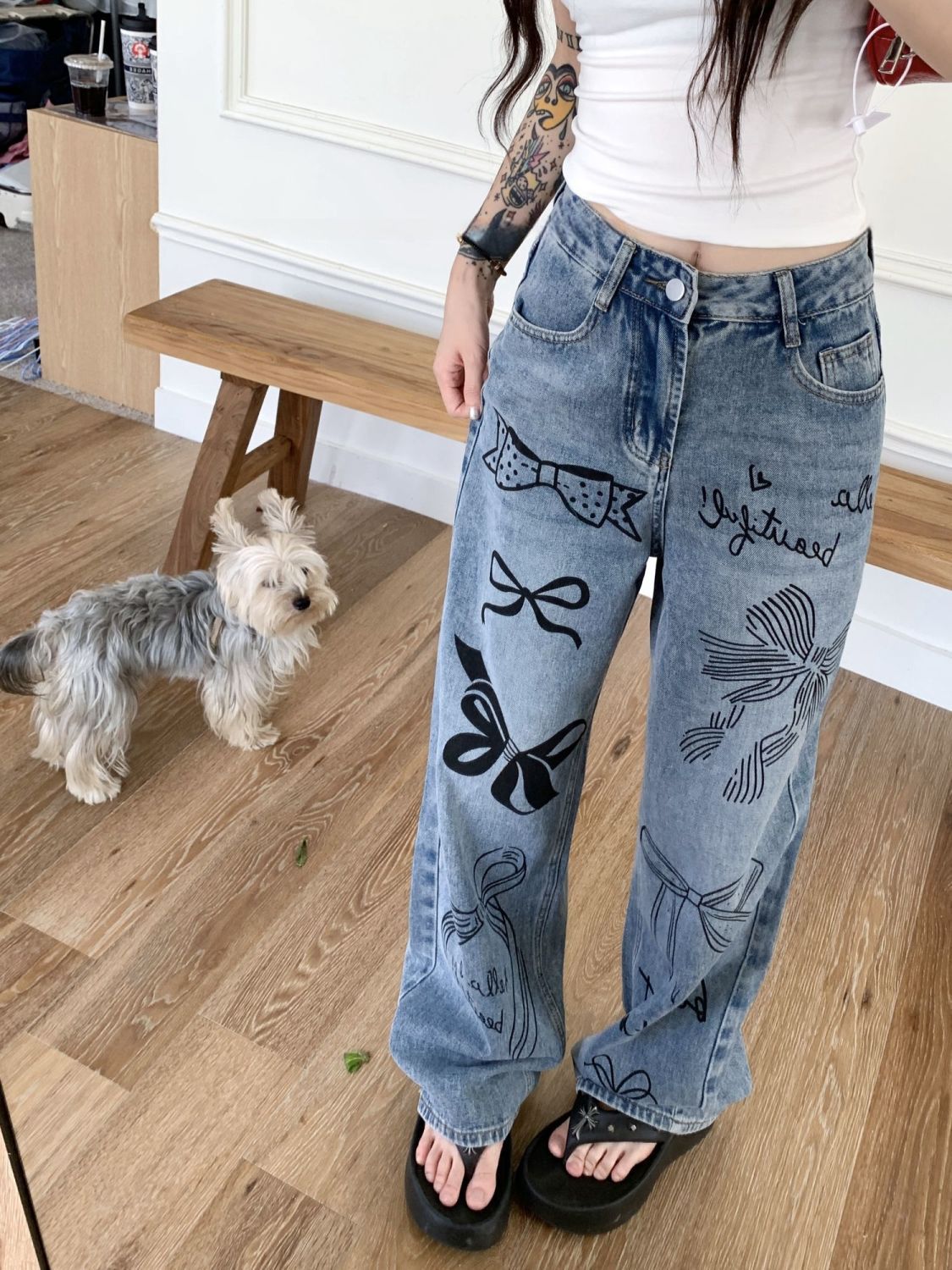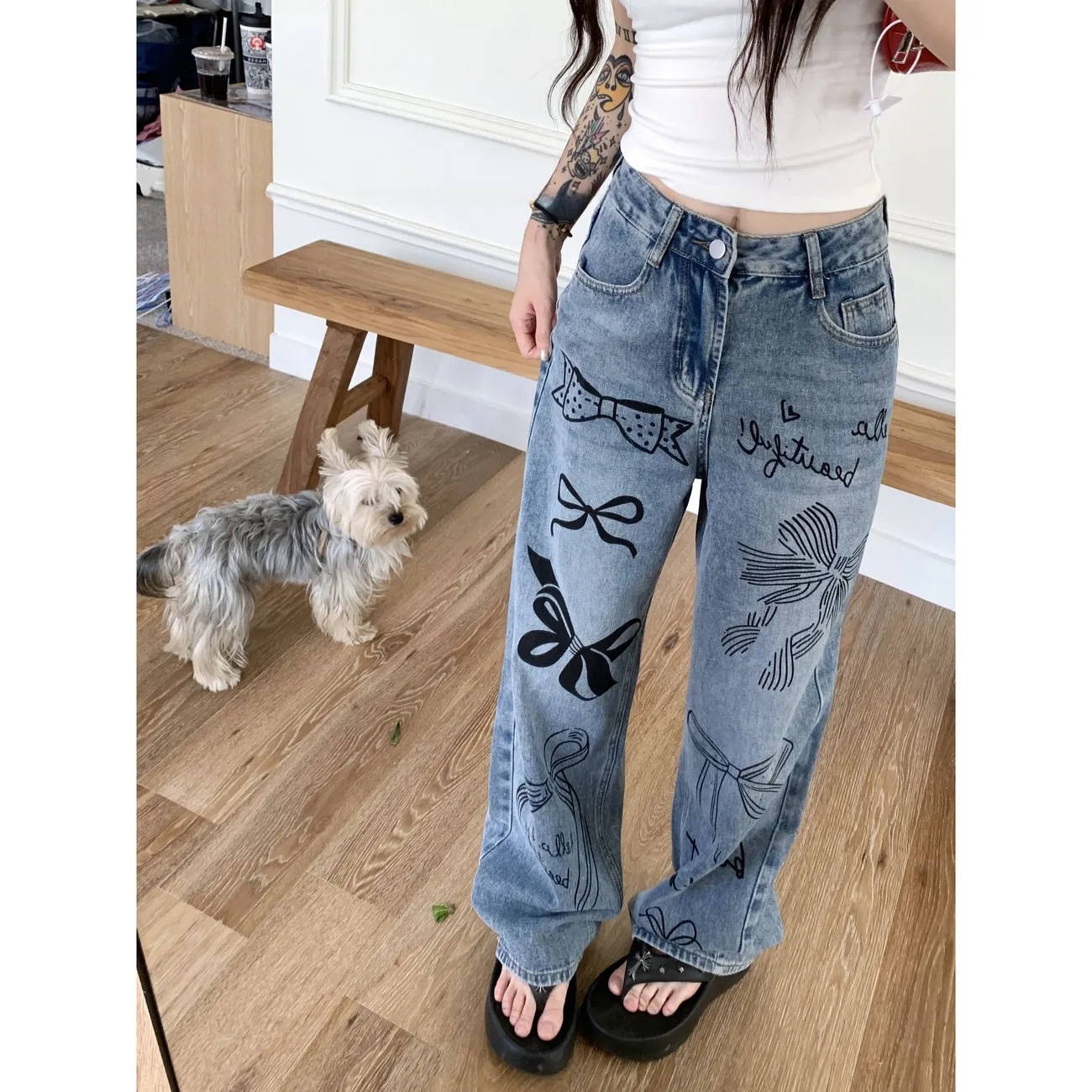 여성을 위한 디자인 니치 그래피티 청바지, 봄, 가을 새로운 스타일, 헤비 프린트, 루즈하고 다재다능한 와이드 레그 바닥 길이 바지