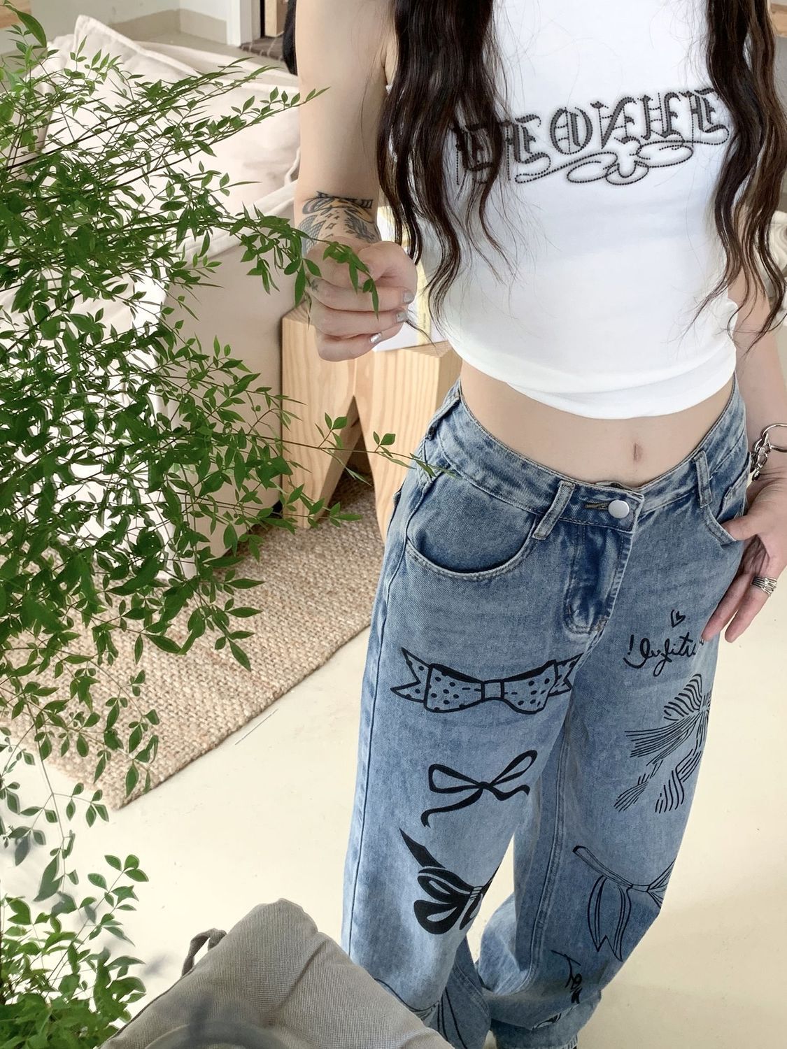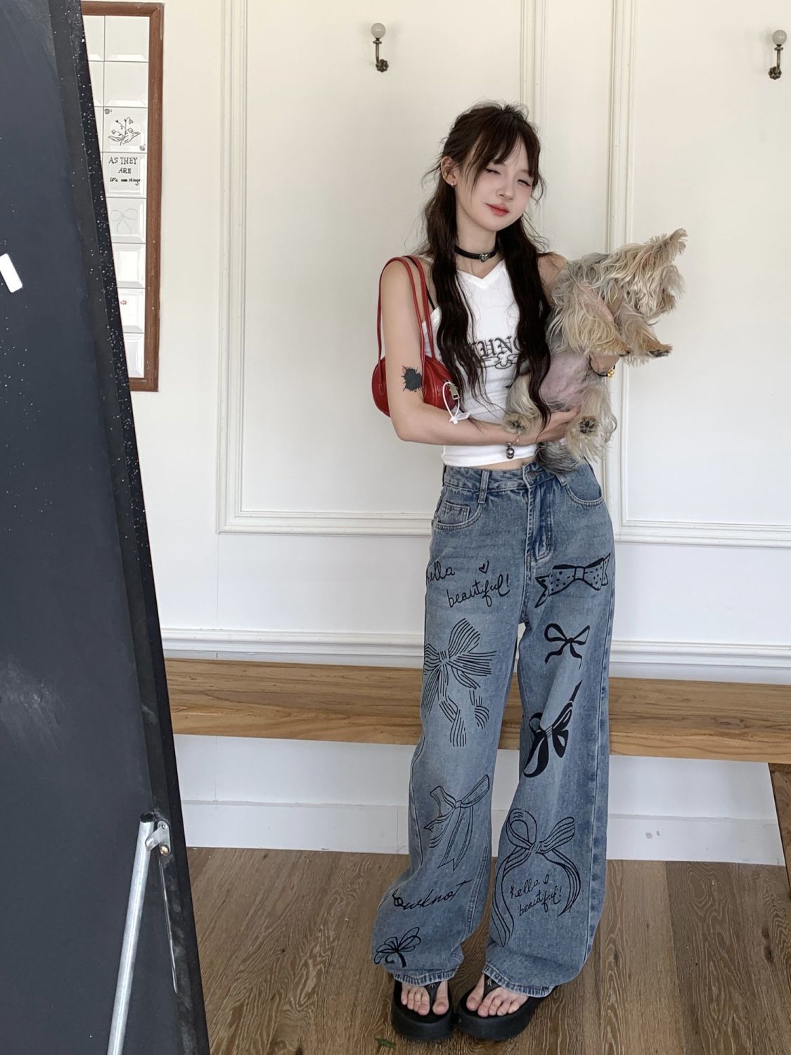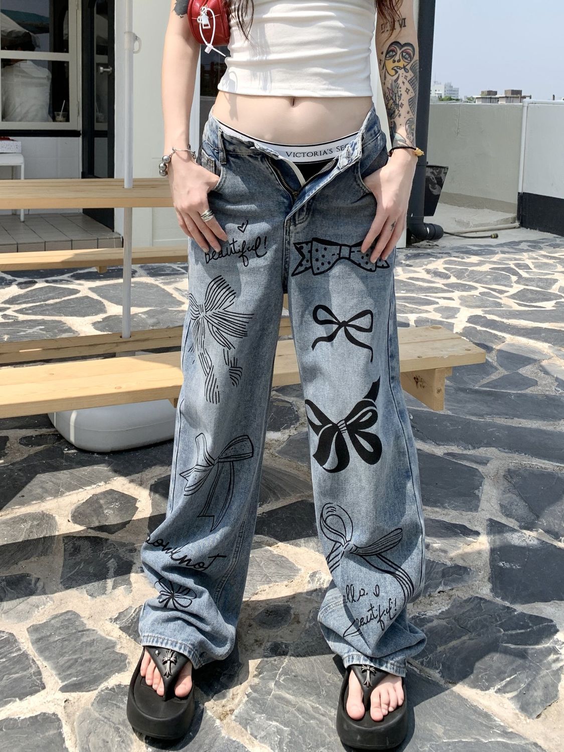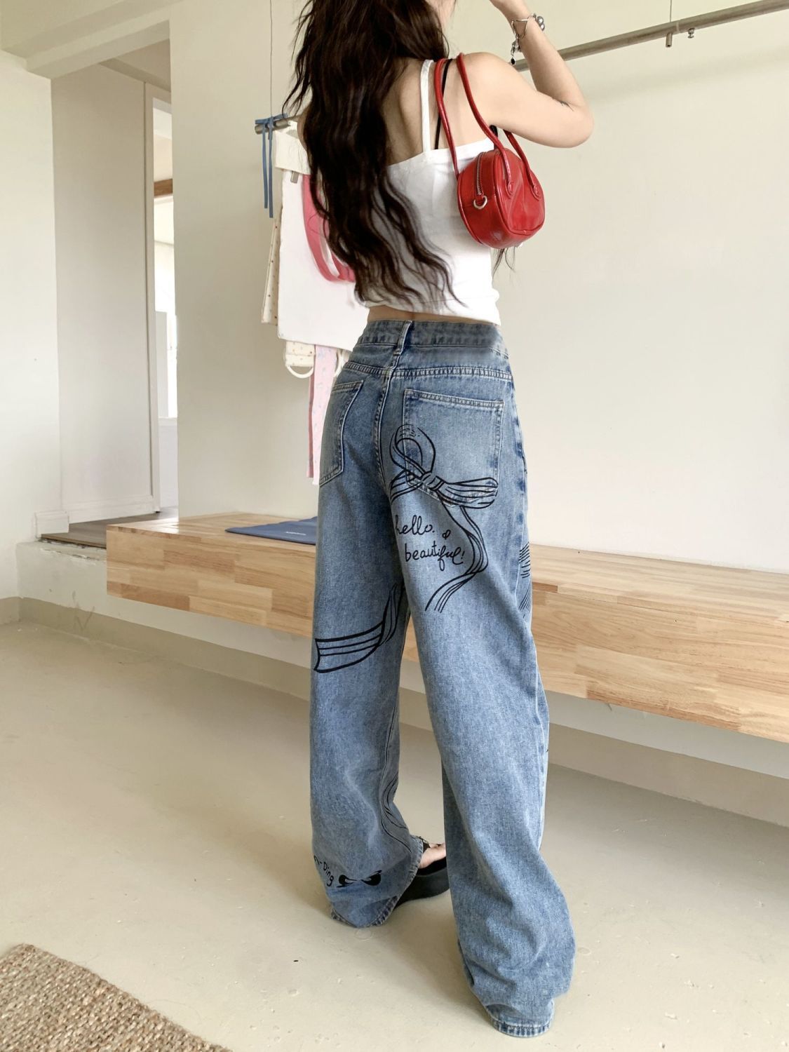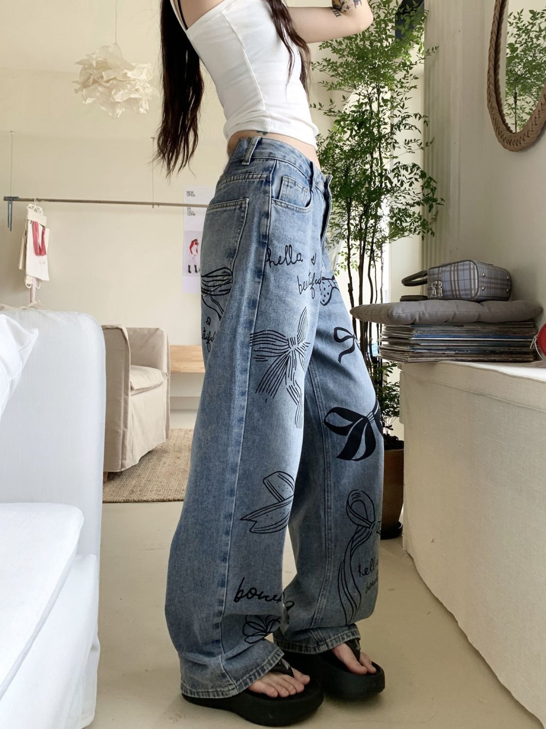 여성을 위한 디자인 니치 그래피티 청바지, 봄, 가을 새로운 스타일, 헤비 프린트, 루즈하고 다재다능한 와이드 레그 바닥 길이 바지