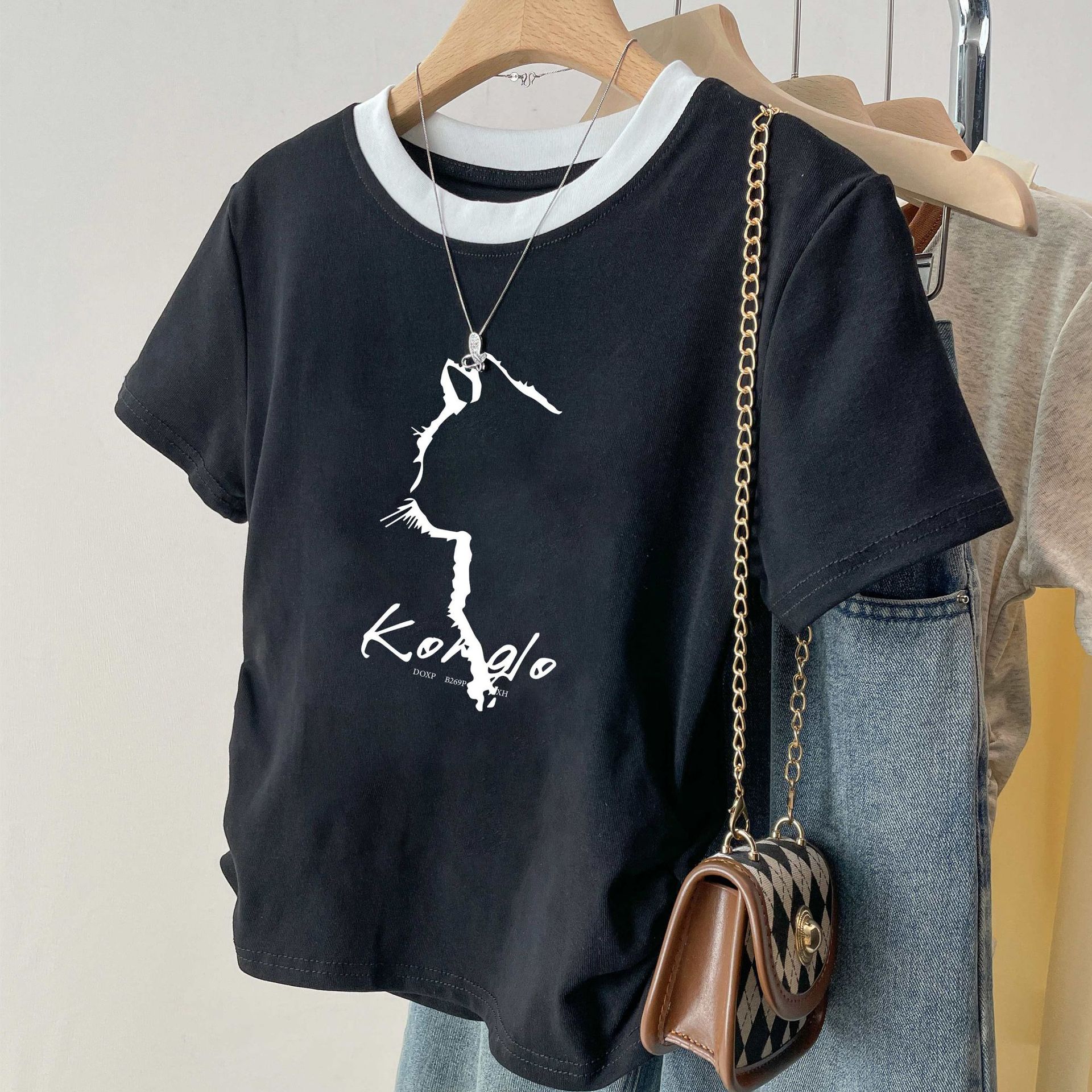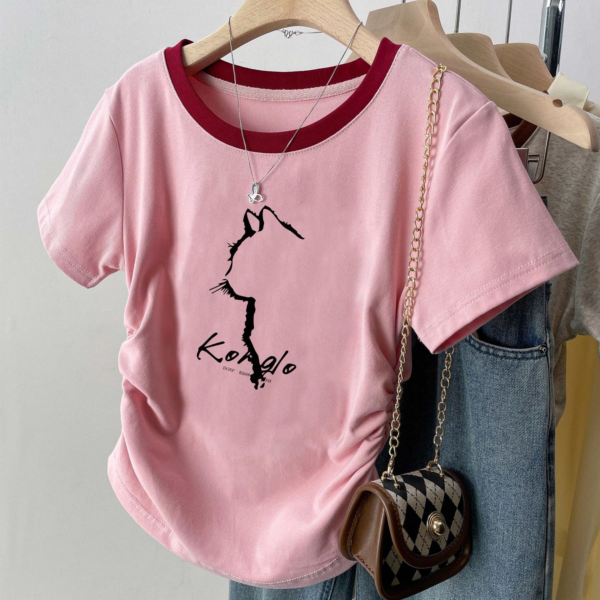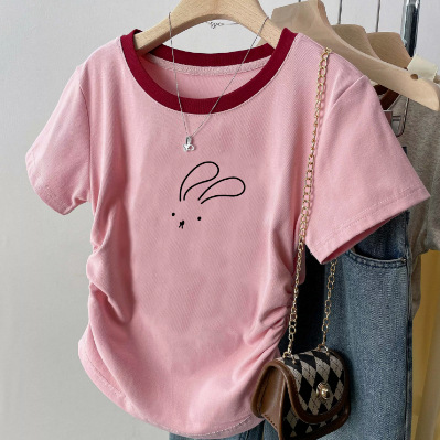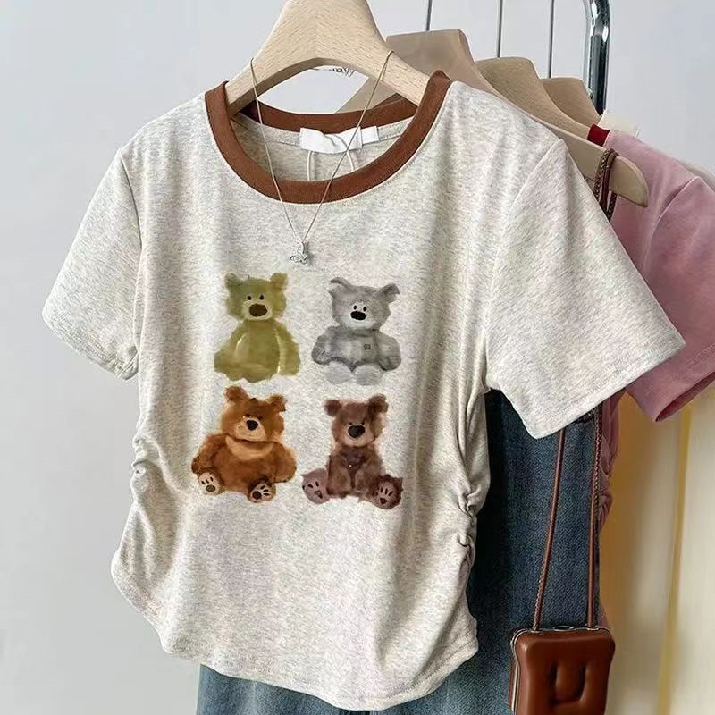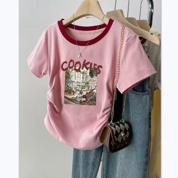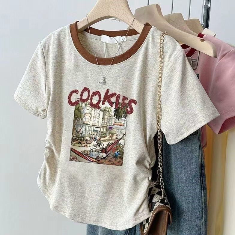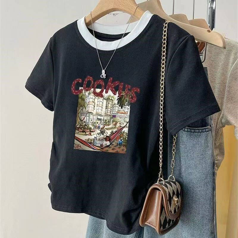 여름 여성을 위한 아메리칸 스타일 오른쪽 어깨 순면 반팔 셔츠, 새로운 스타일의 바닥 셔츠, 슬림한 디자인, 핫걸 스타일의 짧은 탑, 트렌디함스토어 가기