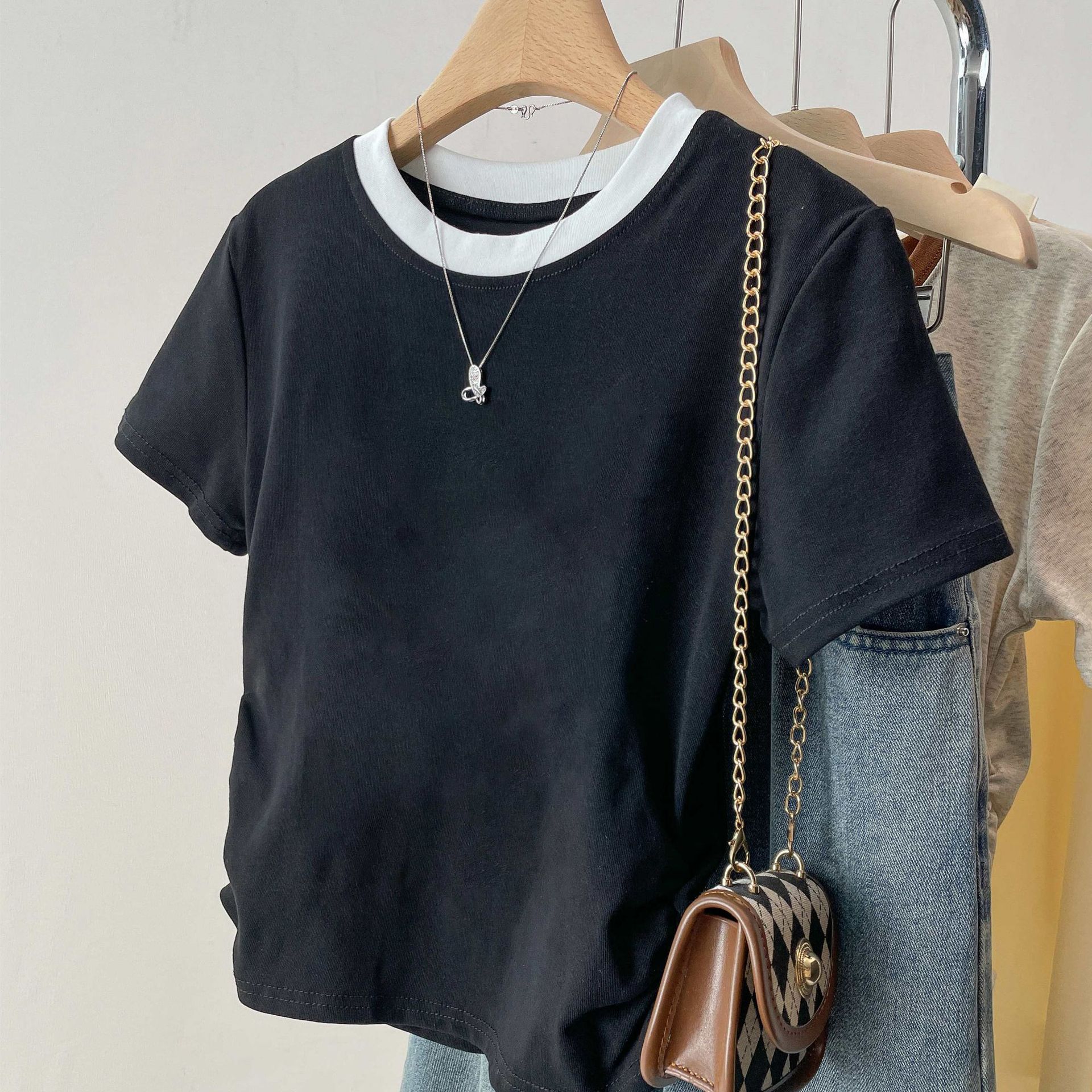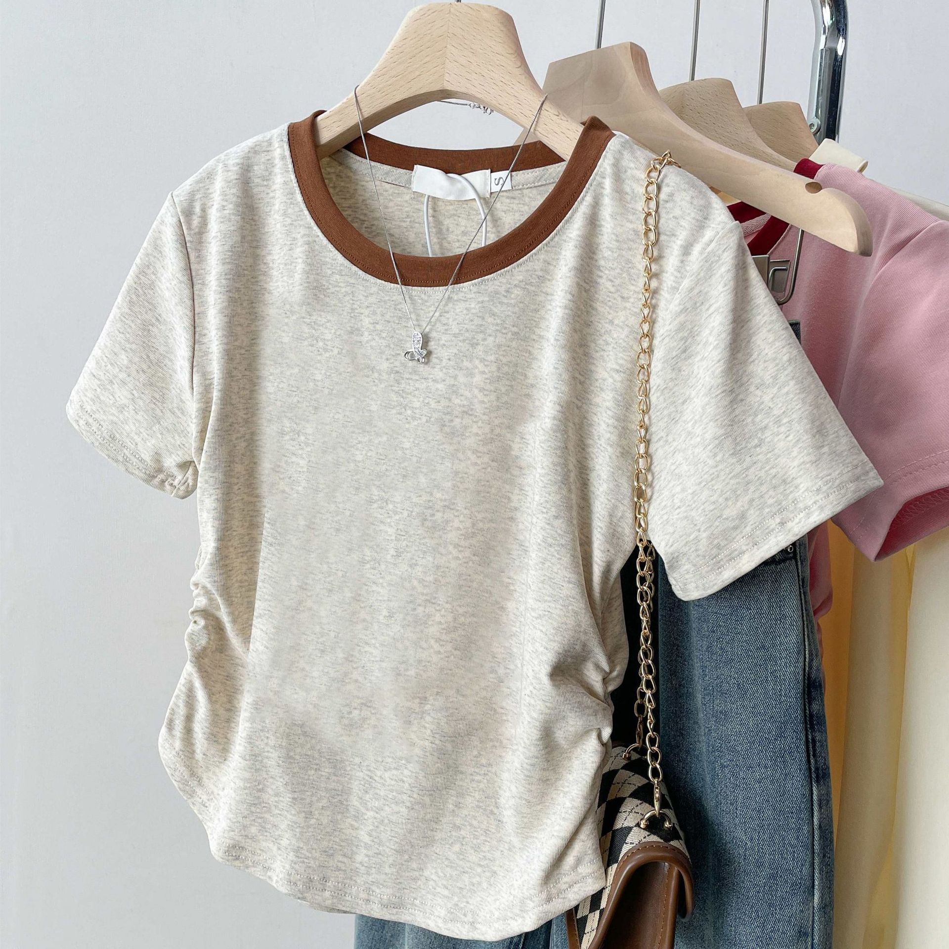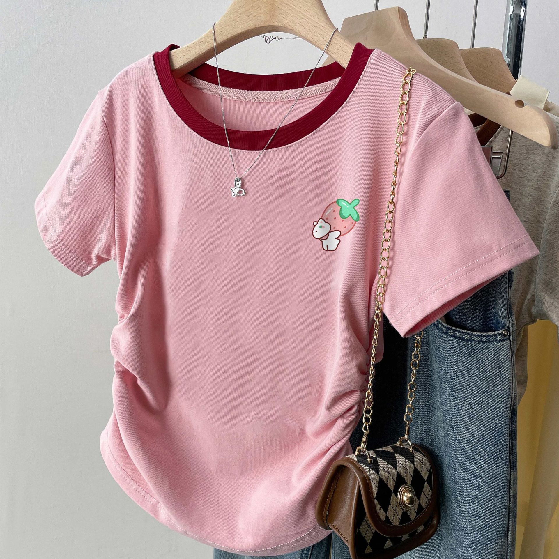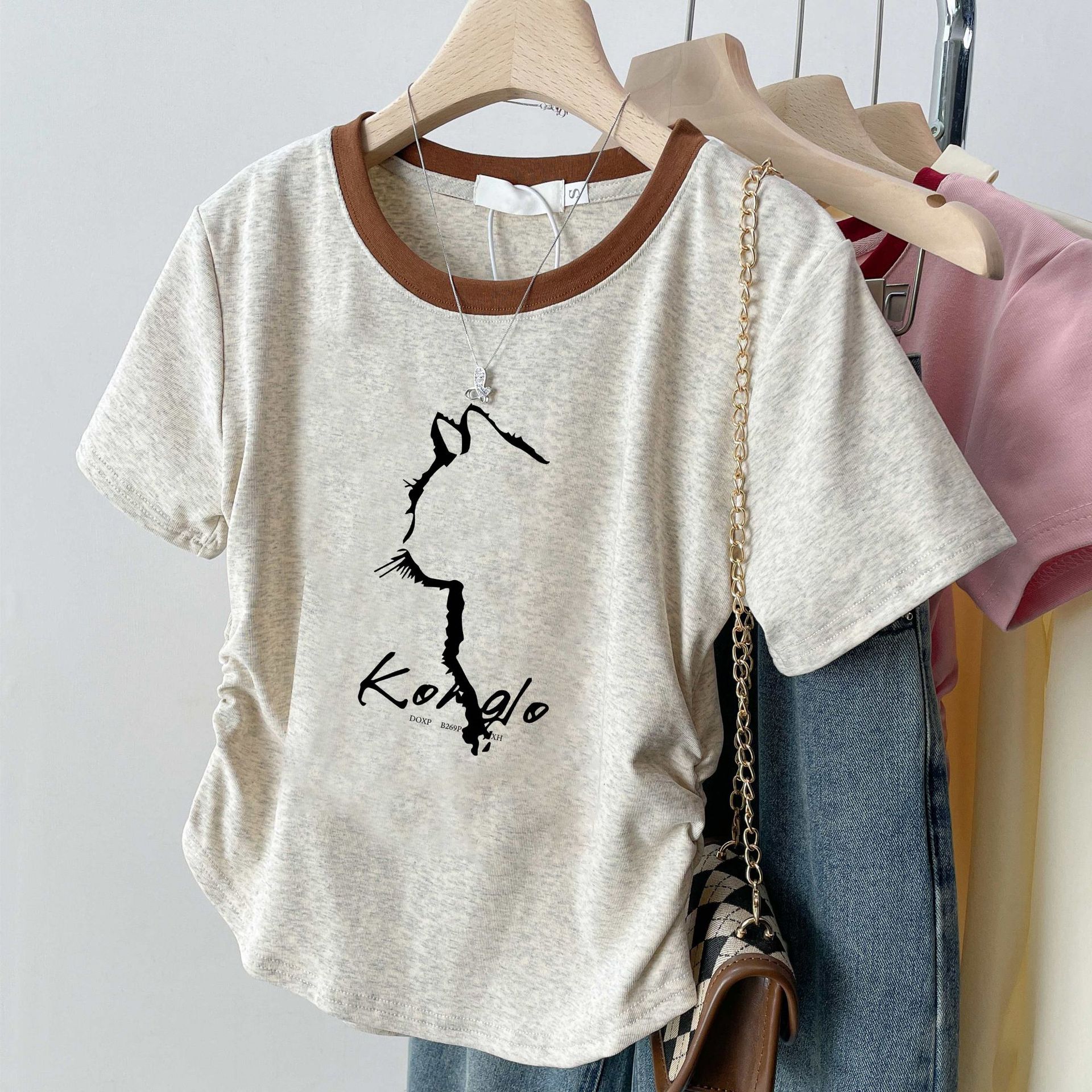 여름 여성을 위한 아메리칸 스타일 오른쪽 어깨 순면 반팔 셔츠, 새로운 스타일의 바닥 셔츠, 슬림한 디자인, 핫걸 스타일의 짧은 탑, 트렌디함스토어 가기