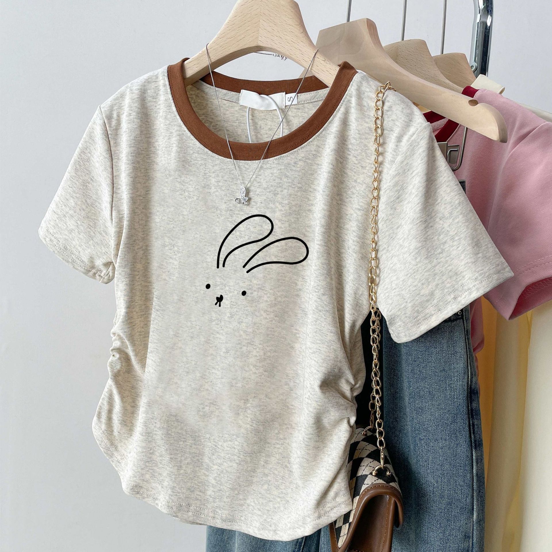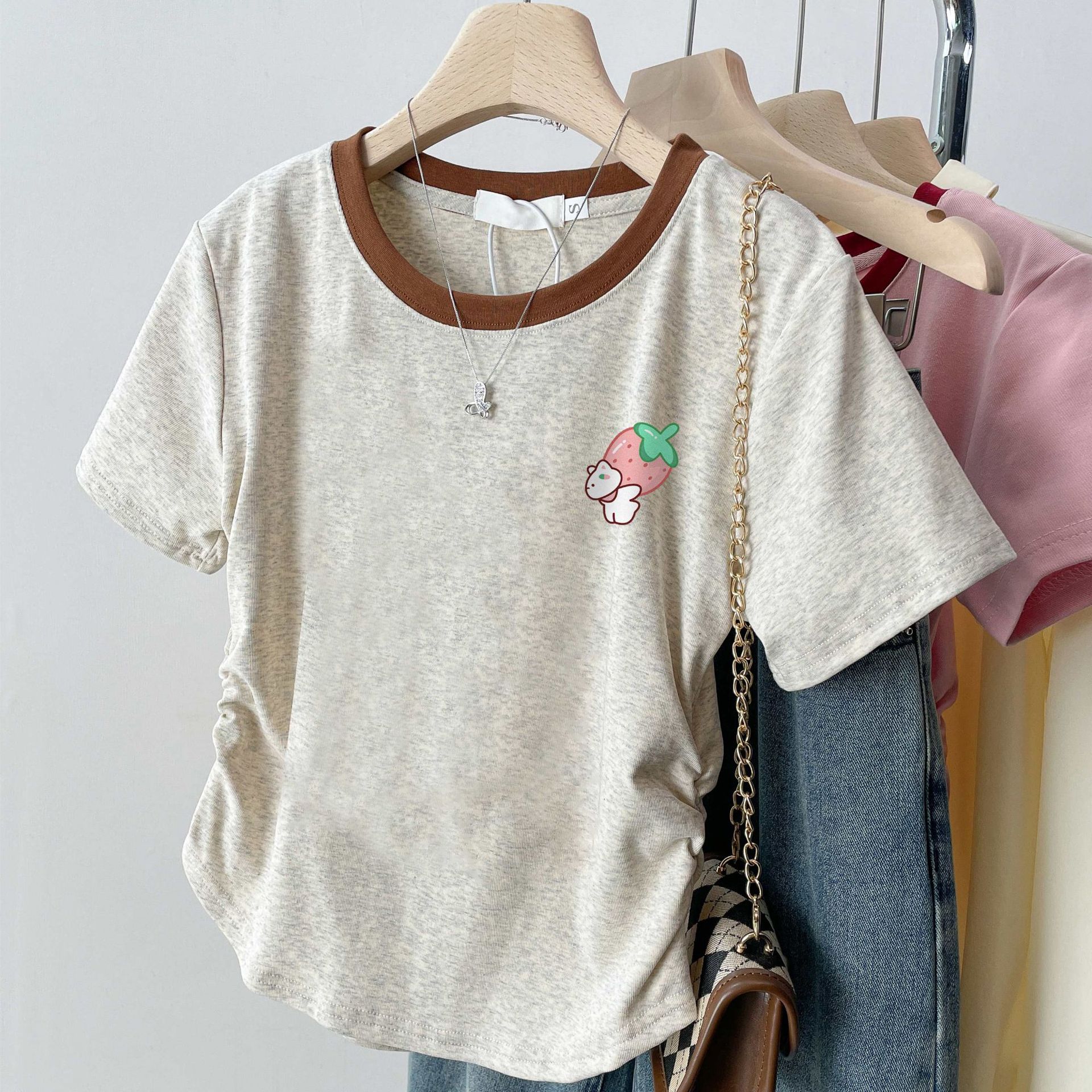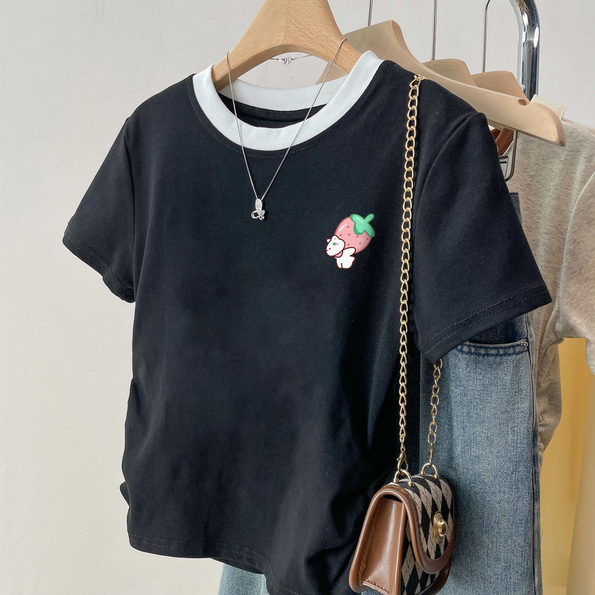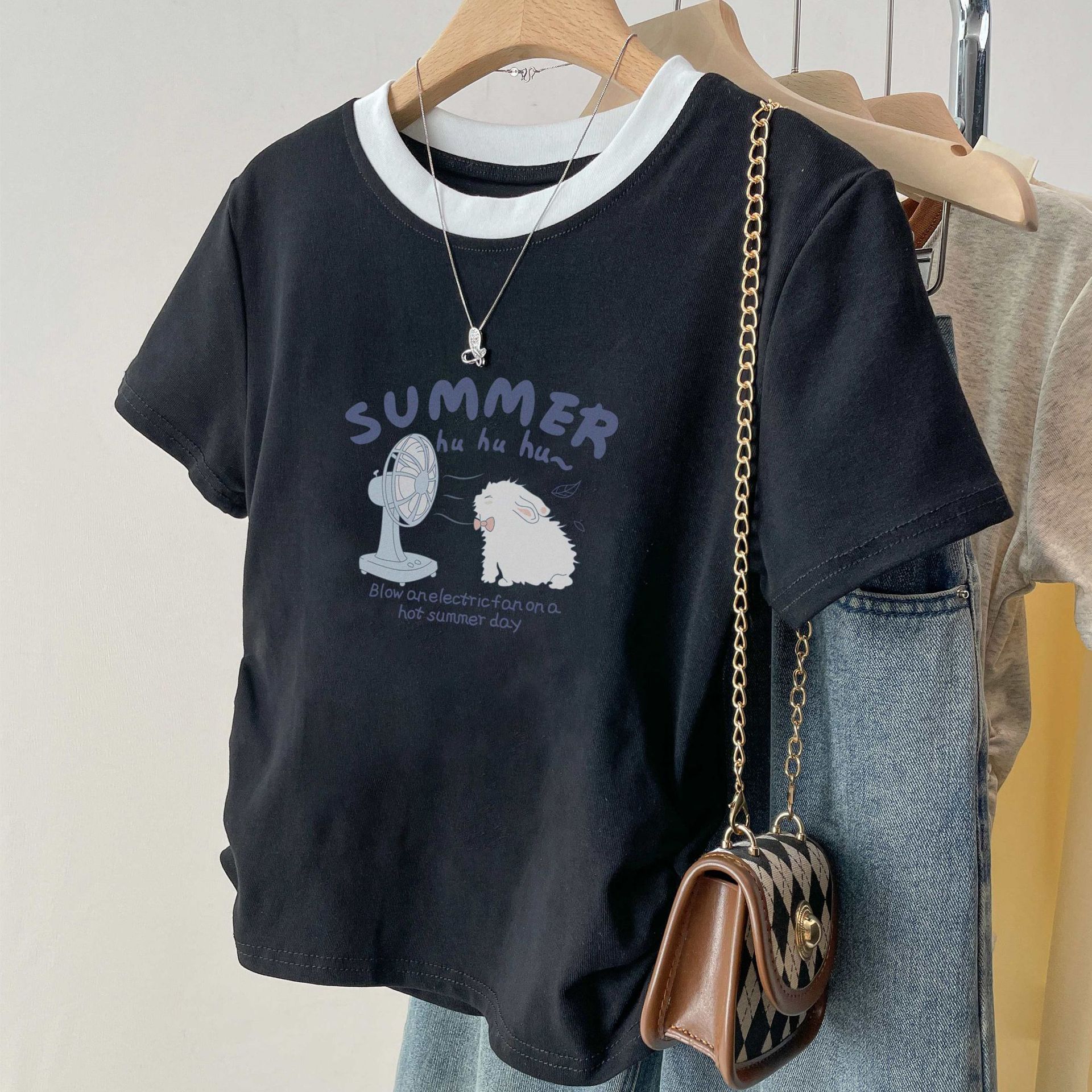 여름 여성을 위한 아메리칸 스타일 오른쪽 어깨 순면 반팔 셔츠, 새로운 스타일의 바닥 셔츠, 슬림한 디자인, 핫걸 스타일의 짧은 탑, 트렌디함스토어 가기