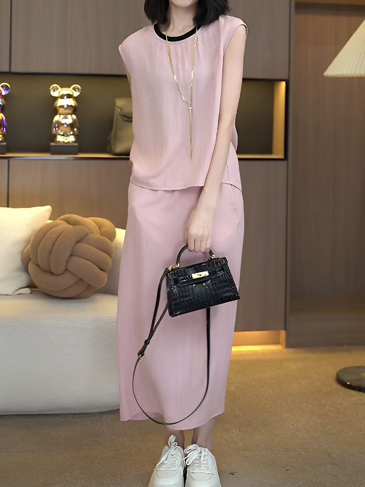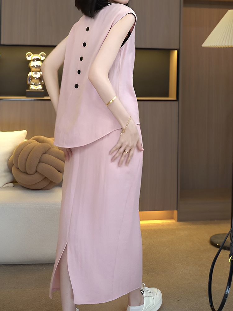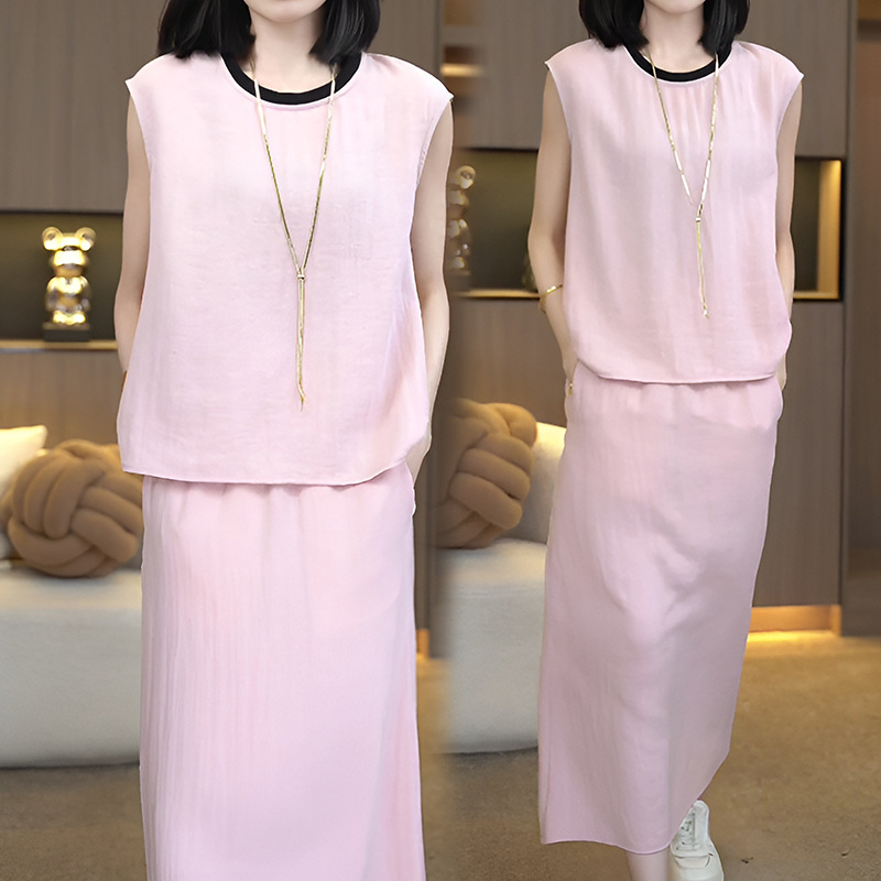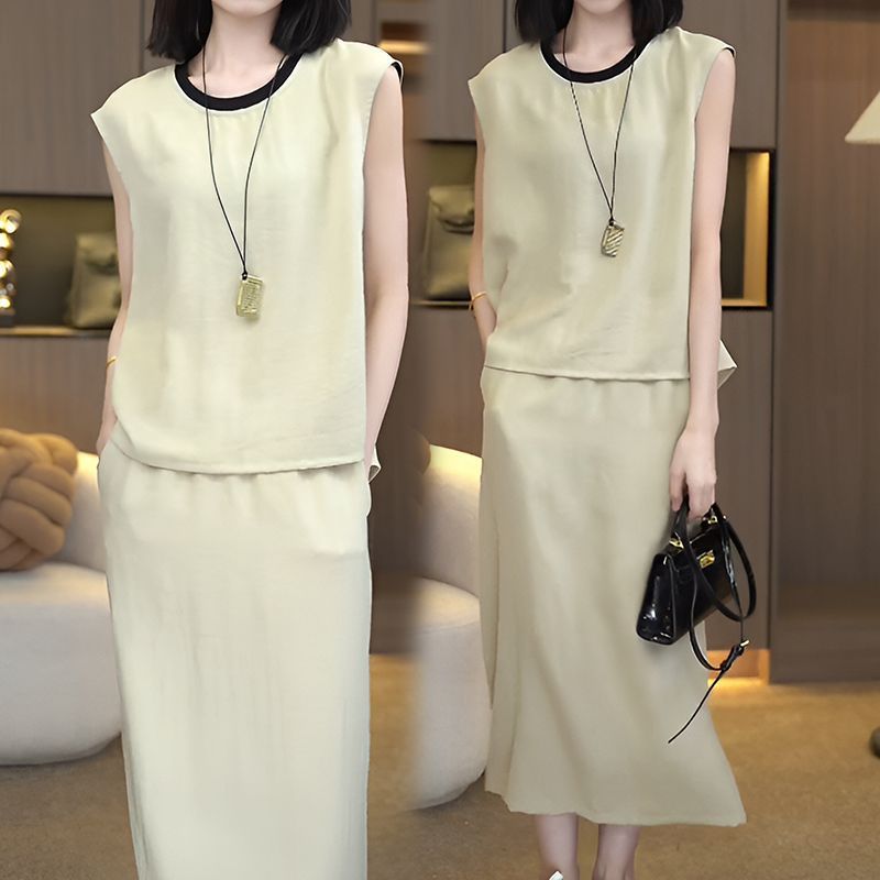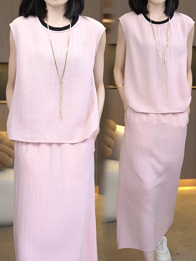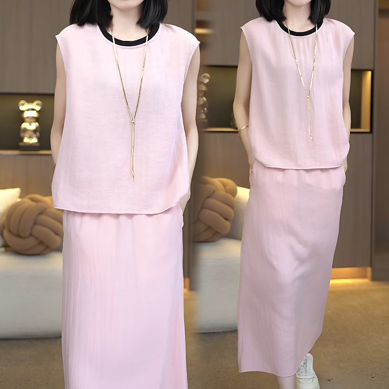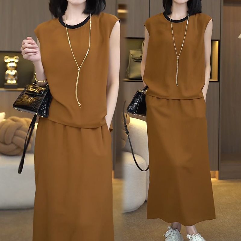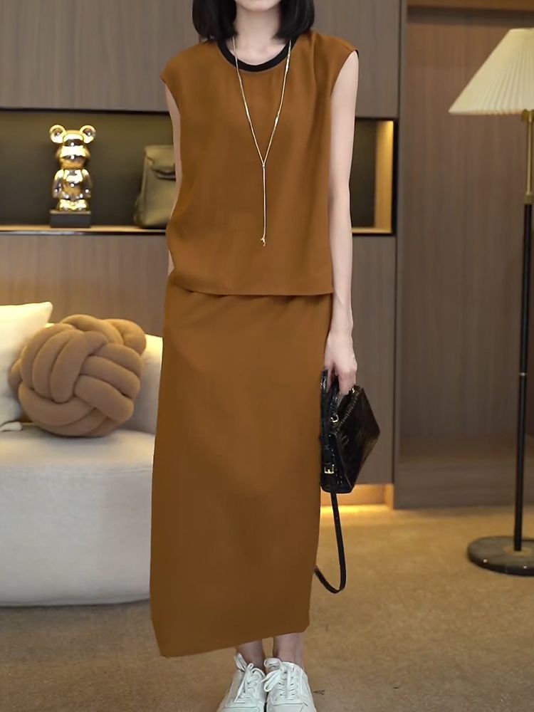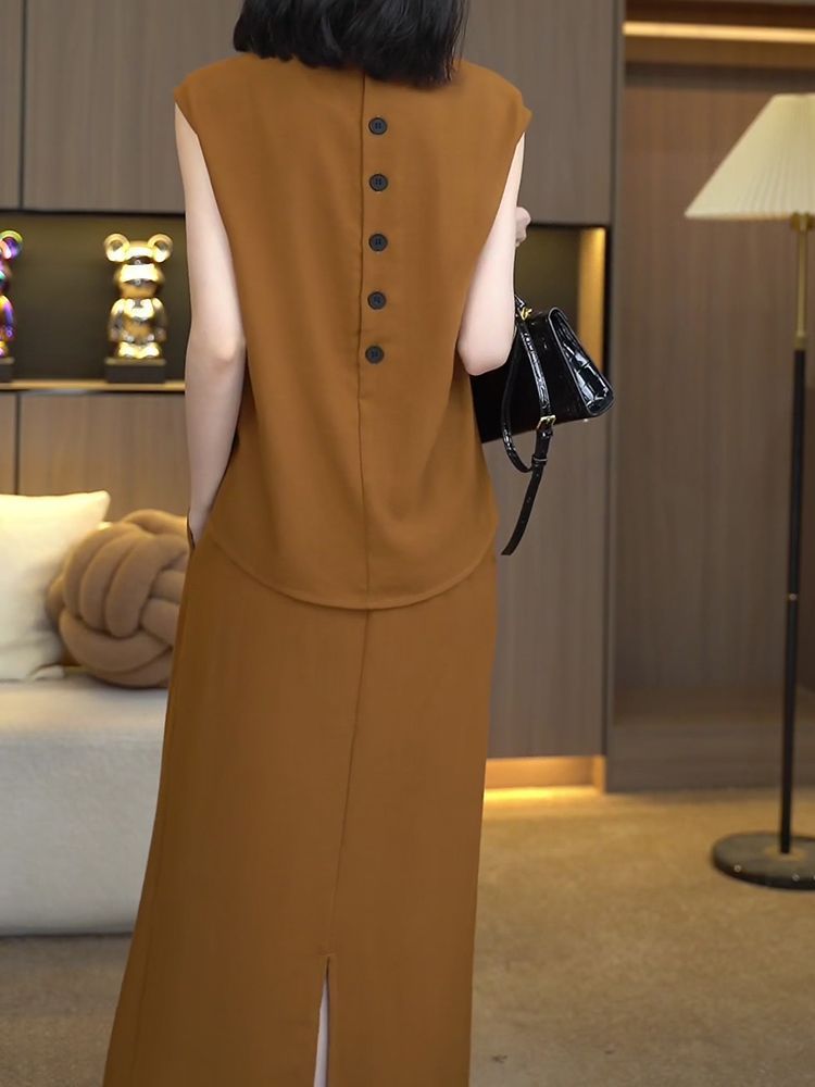 여성을위한 패션 정장 2025 새로운 여름 느슨한 슬림 민소매 셔츠 솔리드 컬러 슬릿 스커트 투피스 세트