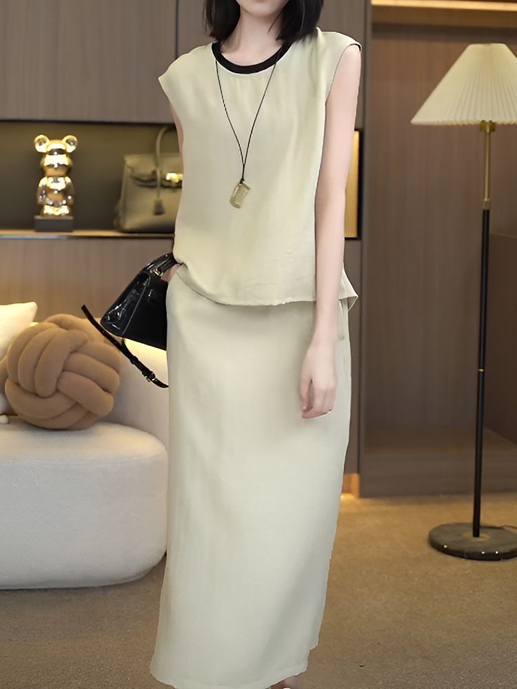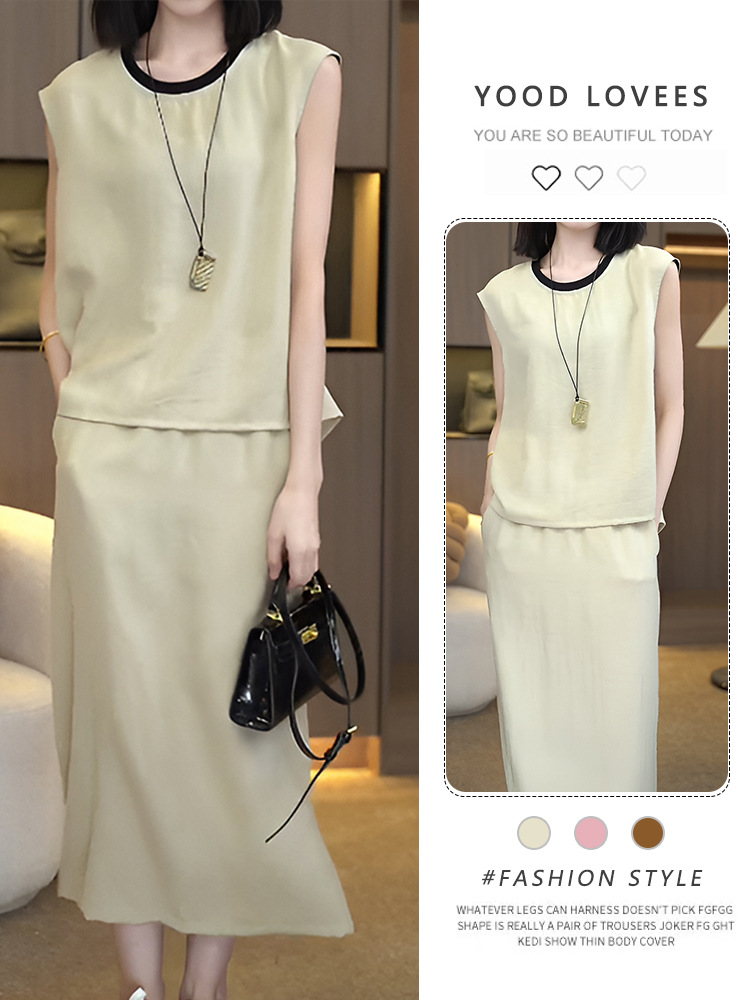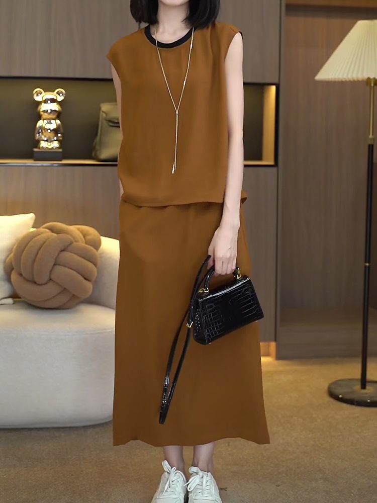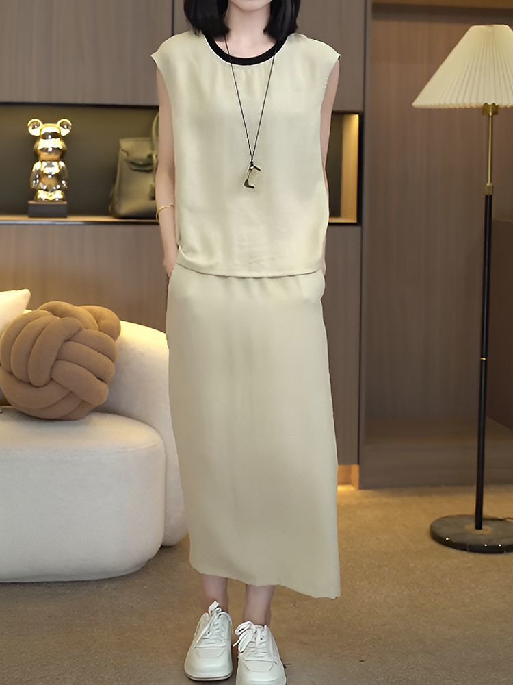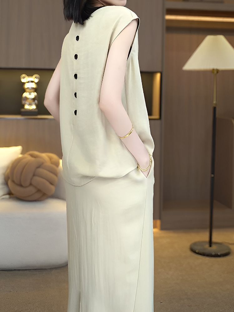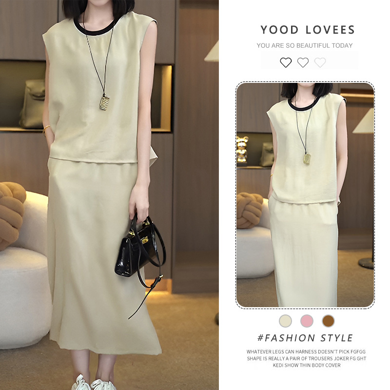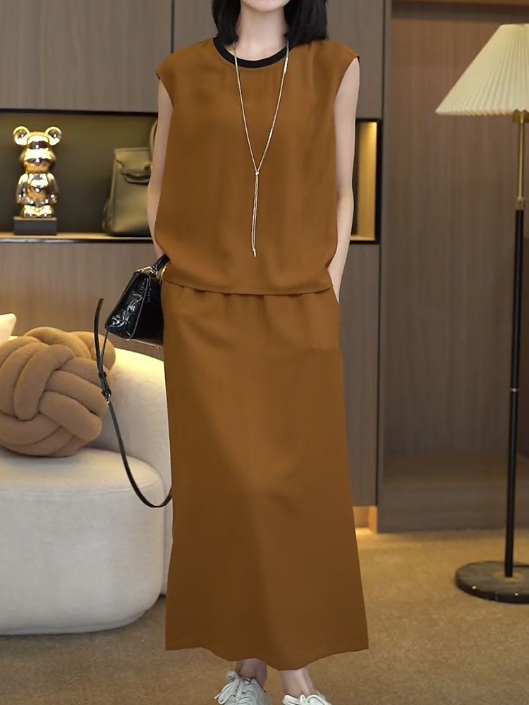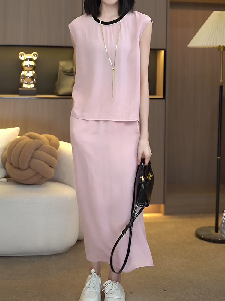 여성을위한 패션 정장 2025 새로운 여름 느슨한 슬림 민소매 셔츠 솔리드 컬러 슬릿 스커트 투피스 세트
