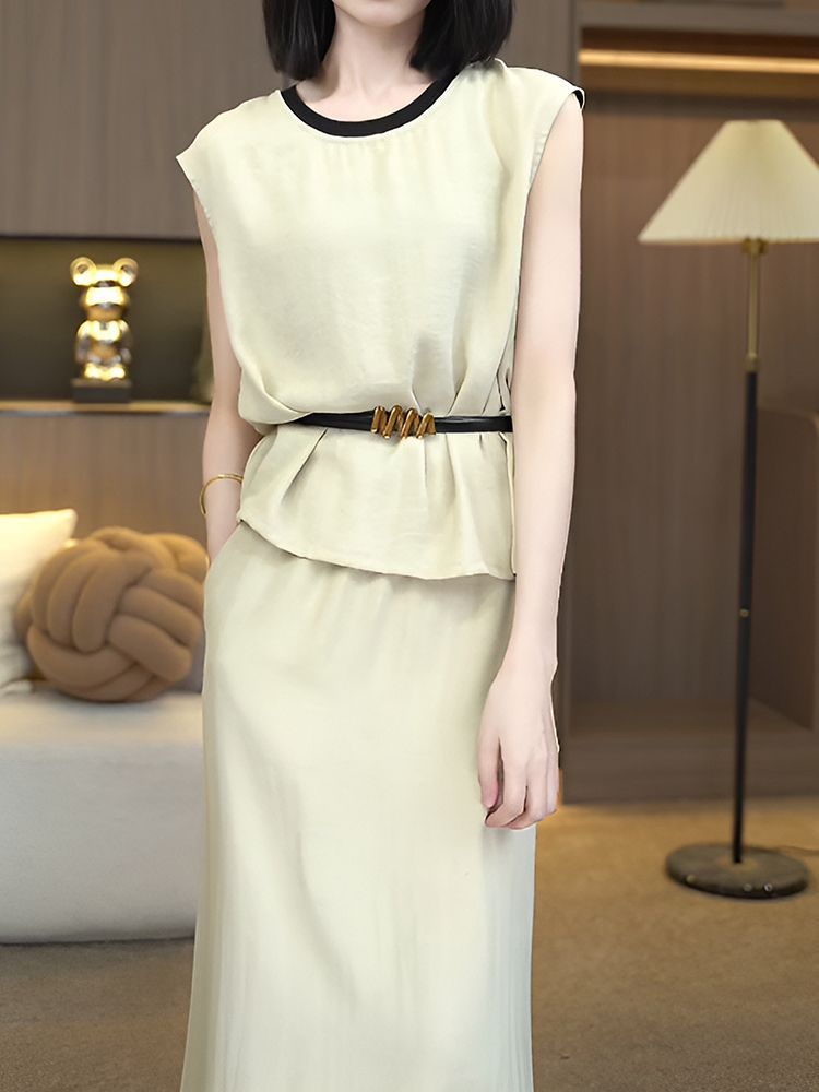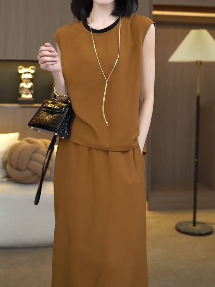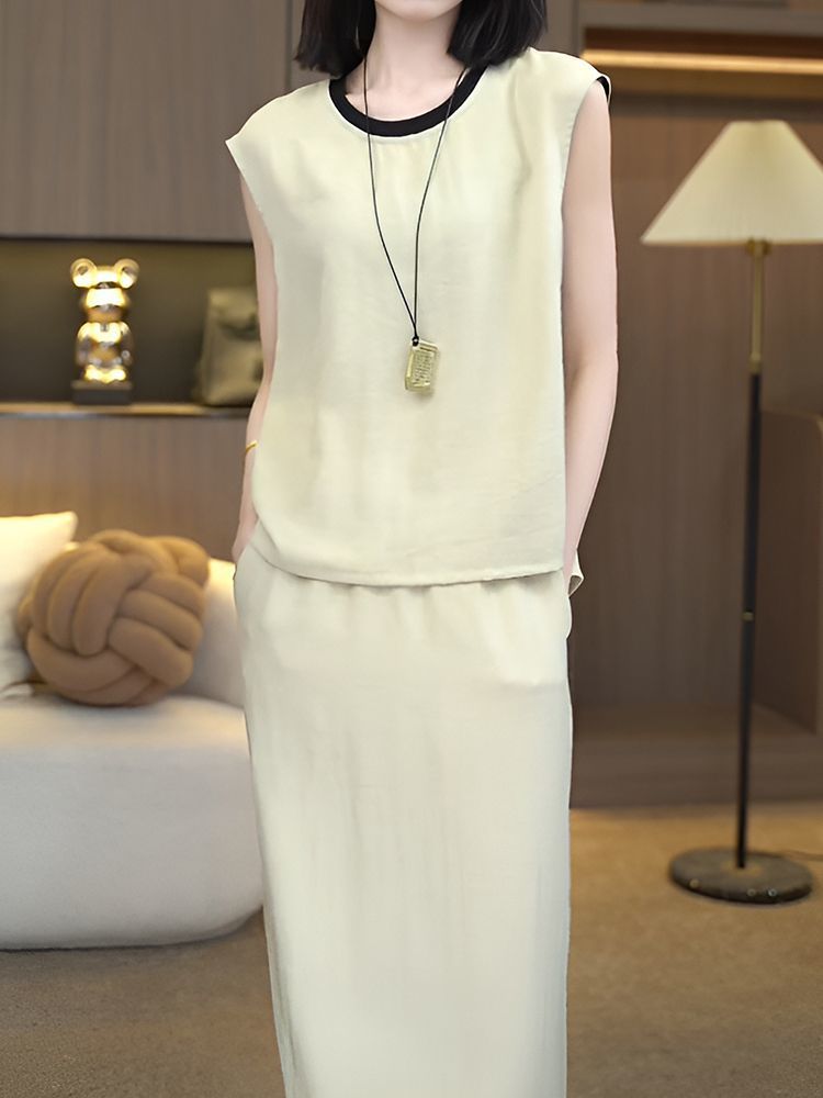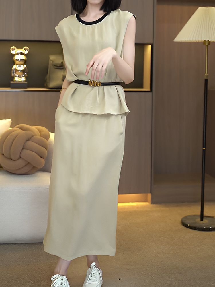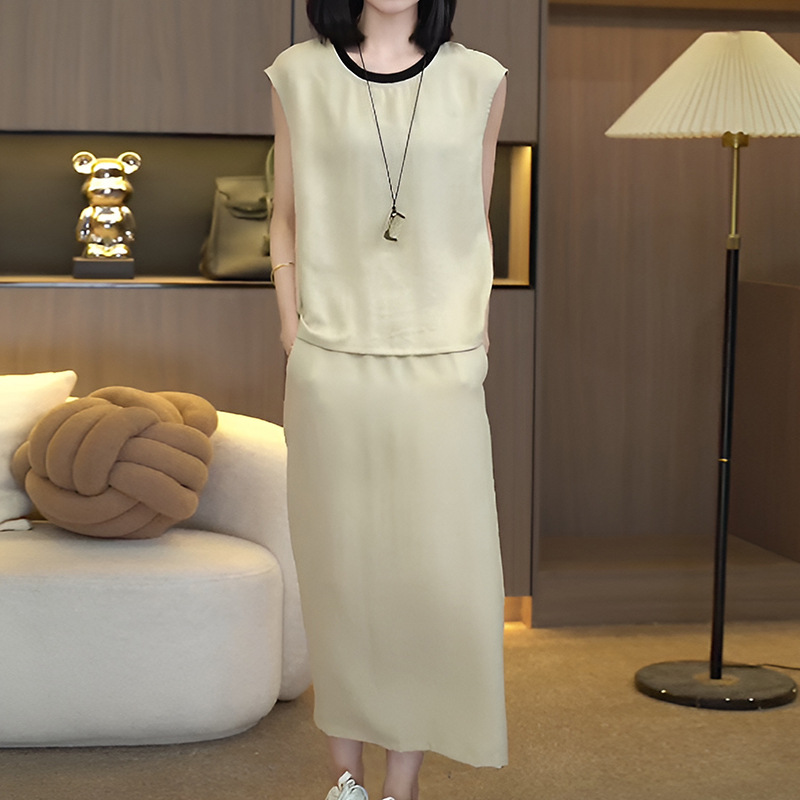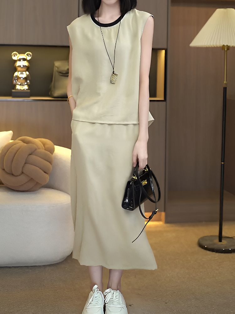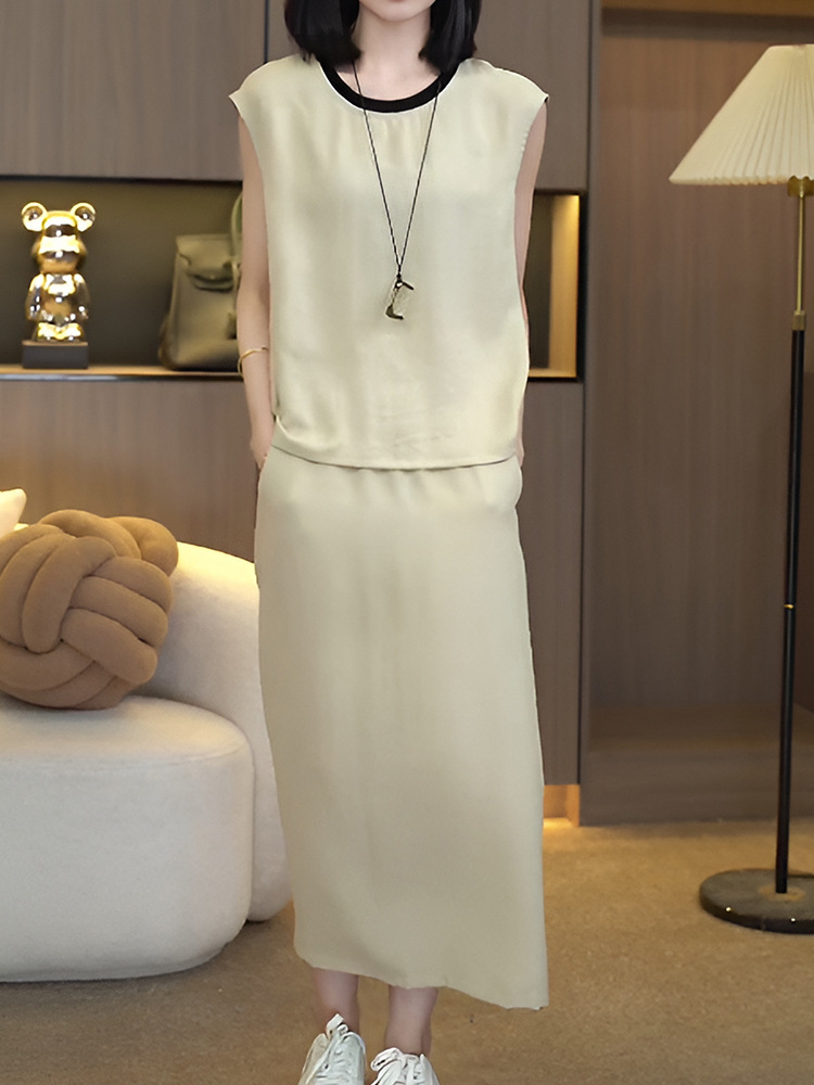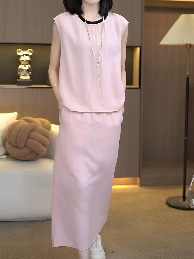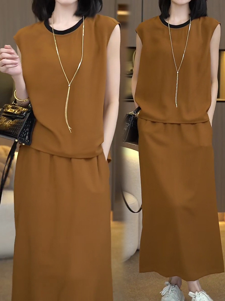 여성을위한 패션 정장 2025 새로운 여름 느슨한 슬림 민소매 셔츠 솔리드 컬러 슬릿 스커트 투피스 세트