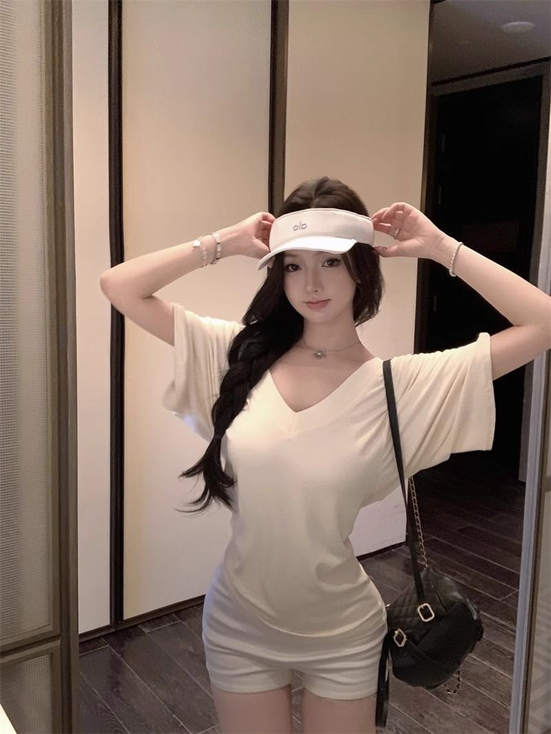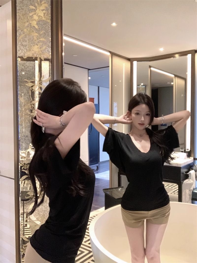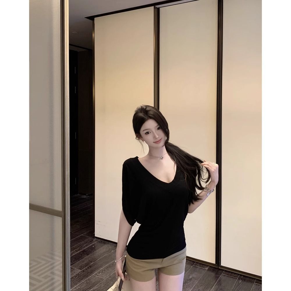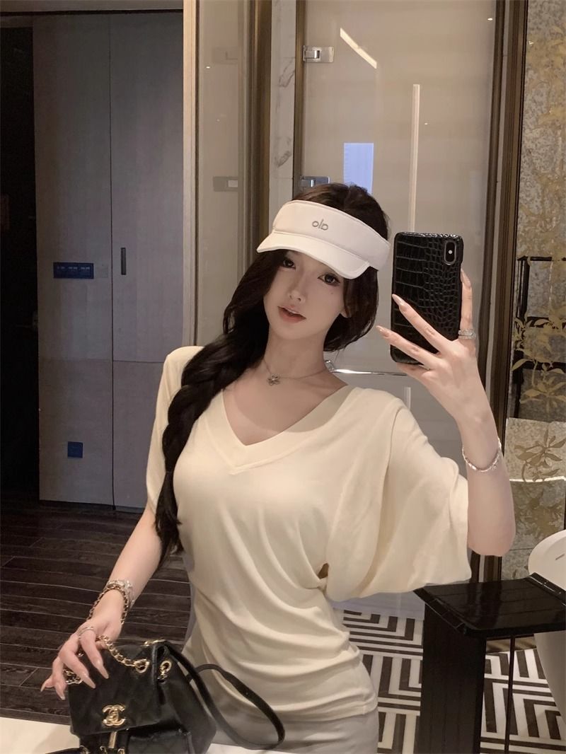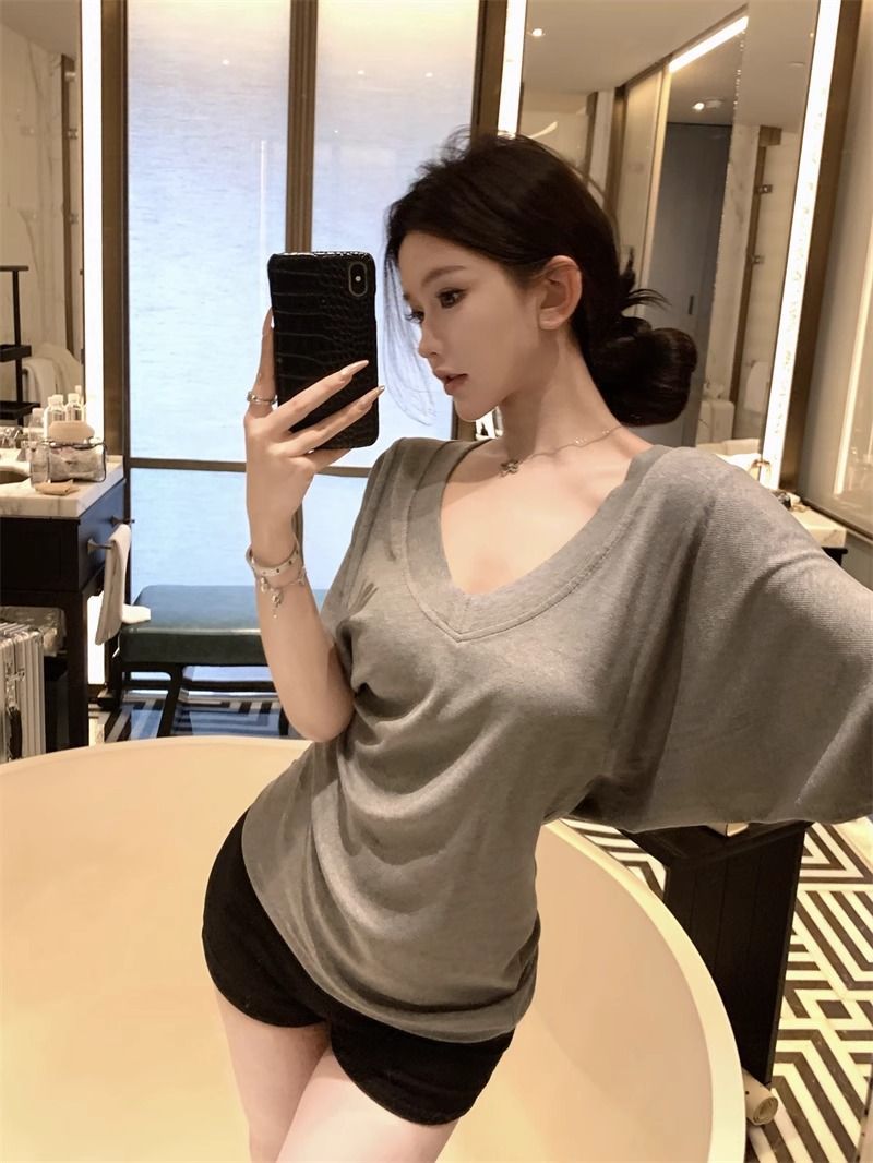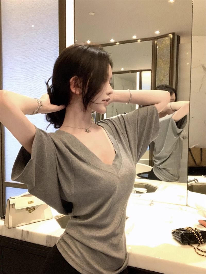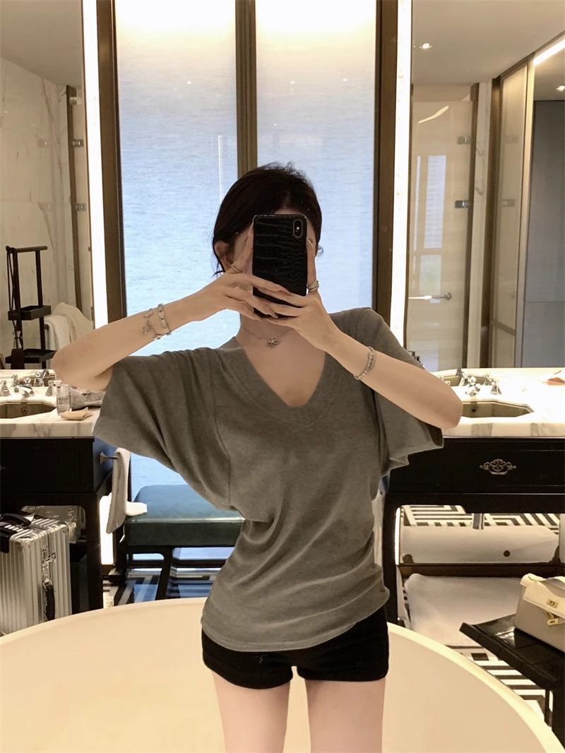 여름 슬리밍 2025 새로운 그레이 탑 여성을위한 배트 슬리브 v 넥 허리 디자인 얇은 반팔 티셔츠스토어 가기