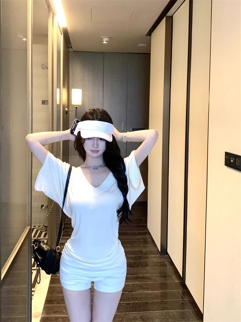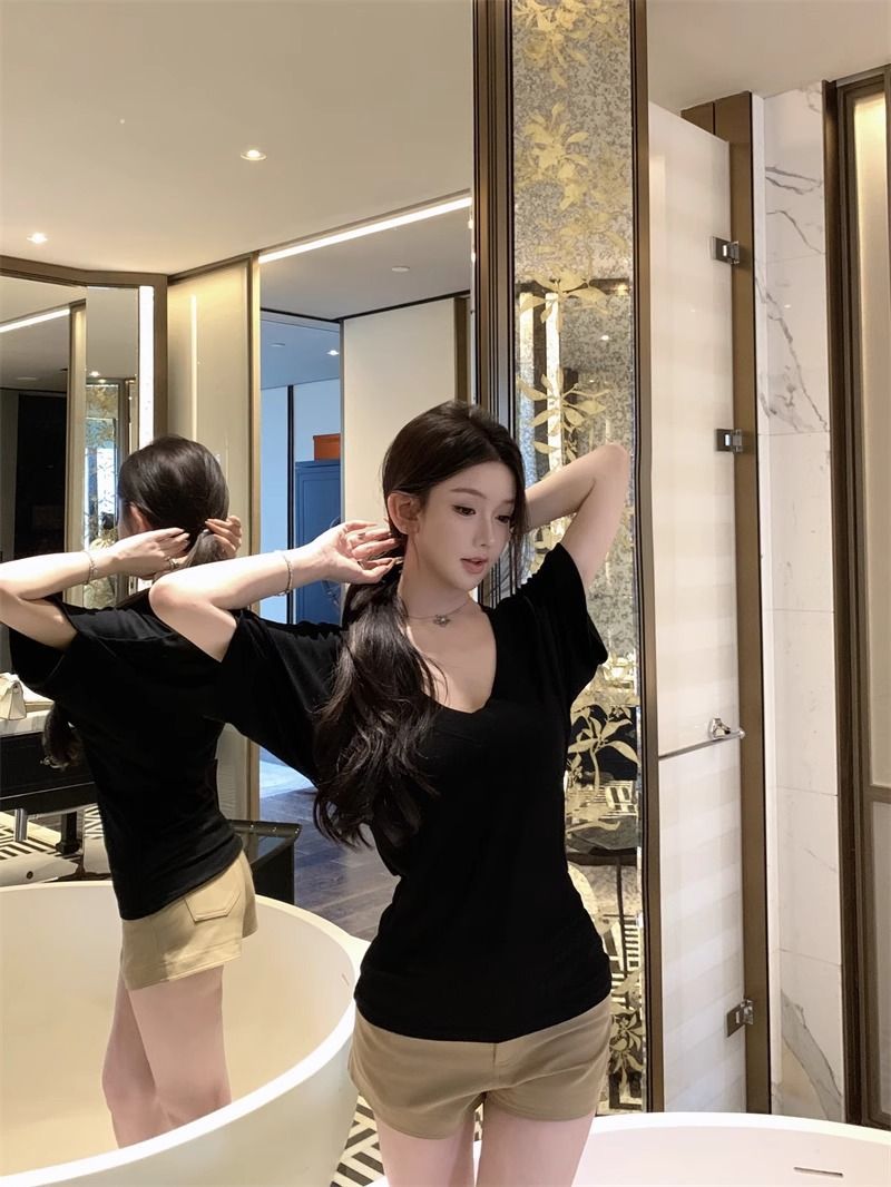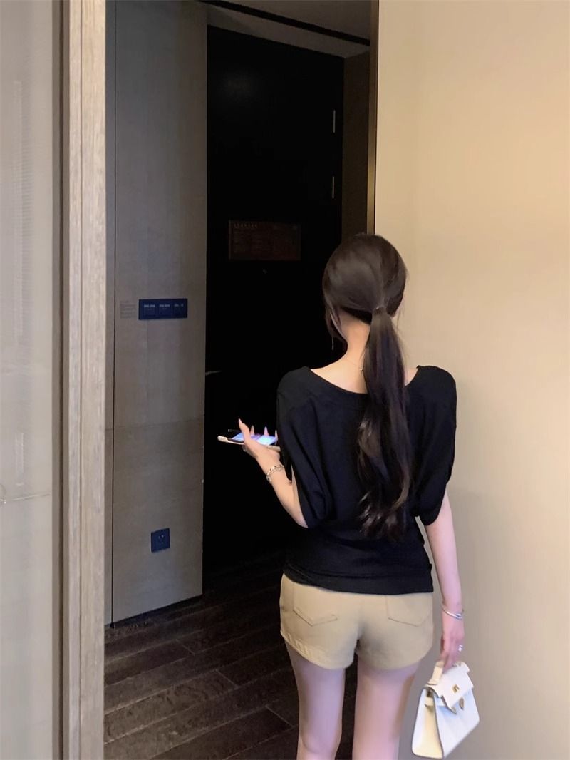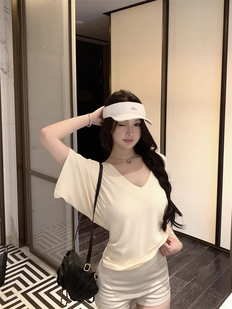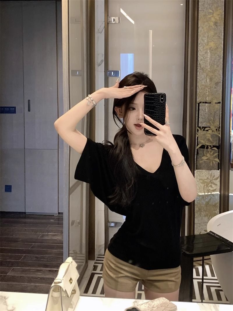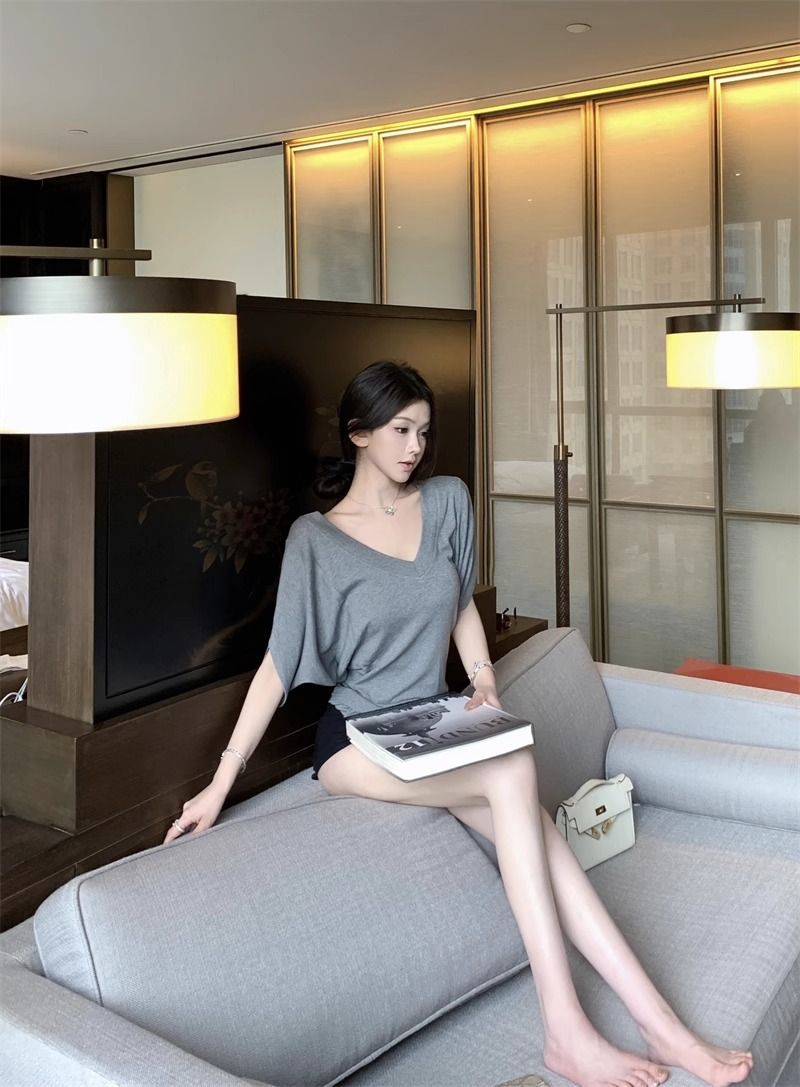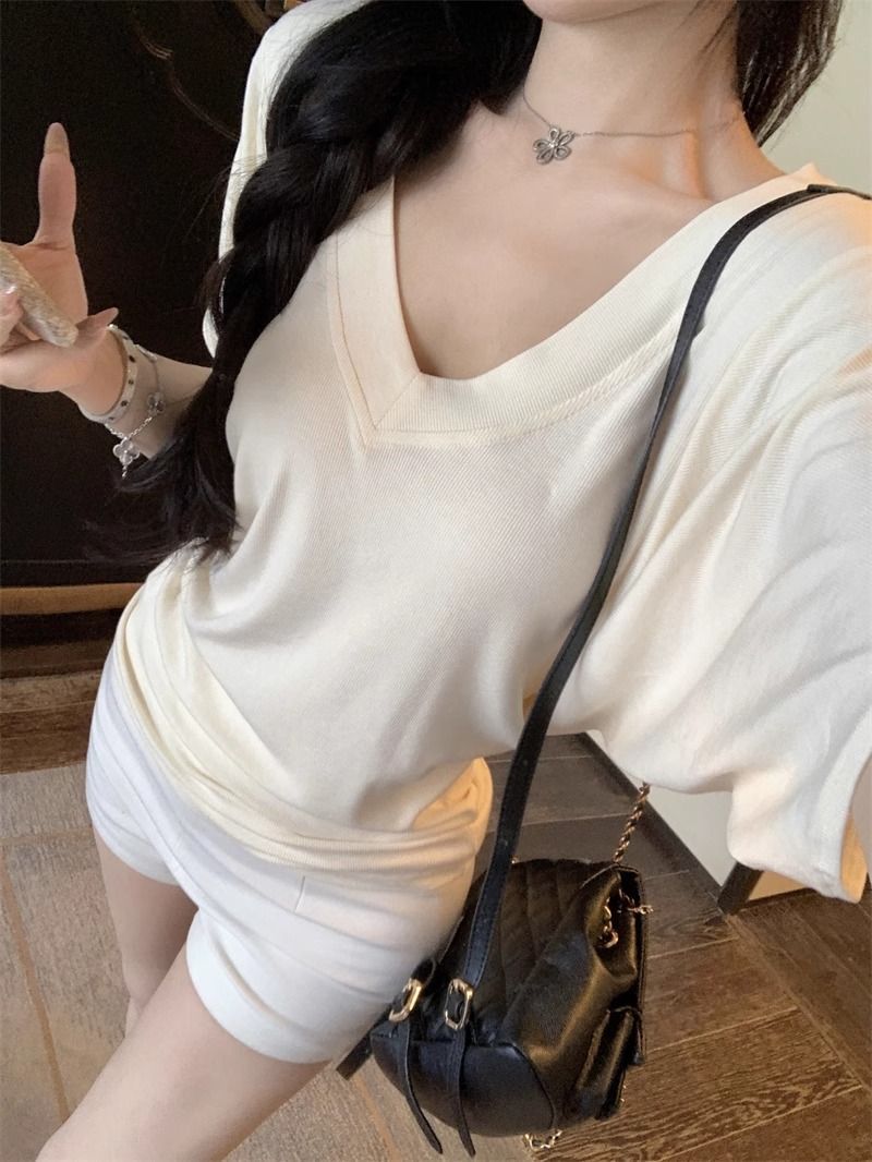 여름 슬리밍 2025 새로운 그레이 탑 여성을위한 배트 슬리브 v 넥 허리 디자인 얇은 반팔 티셔츠스토어 가기