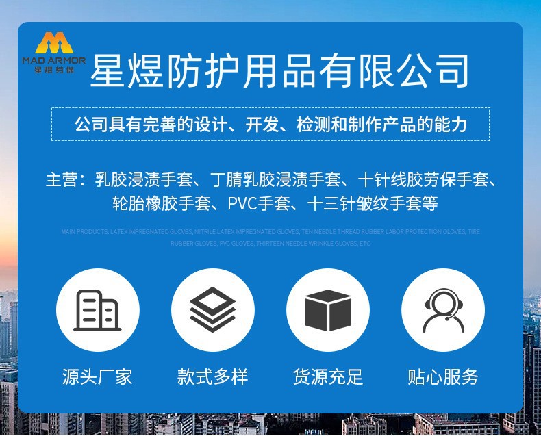 本司专业生产销售各款劳保手套,以接订单生产为主,可根据客户的来样生产定做,只要您有样品,只要您有要求,我们就可以为您定做。 (注:网上价格仅供参考,价格会因时间、数量、质量、包装方式等具体要求而有所变化,请来旺来电咨询)
