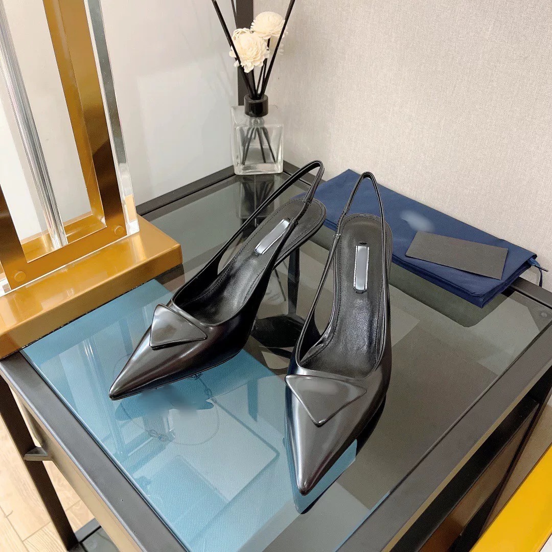 여성을위한 P의 삼각형 로고 발가락 샌들 2025 새로운 하이힐 요정 스타일 빈 가죽 뾰족한 하이힐스토어 가기