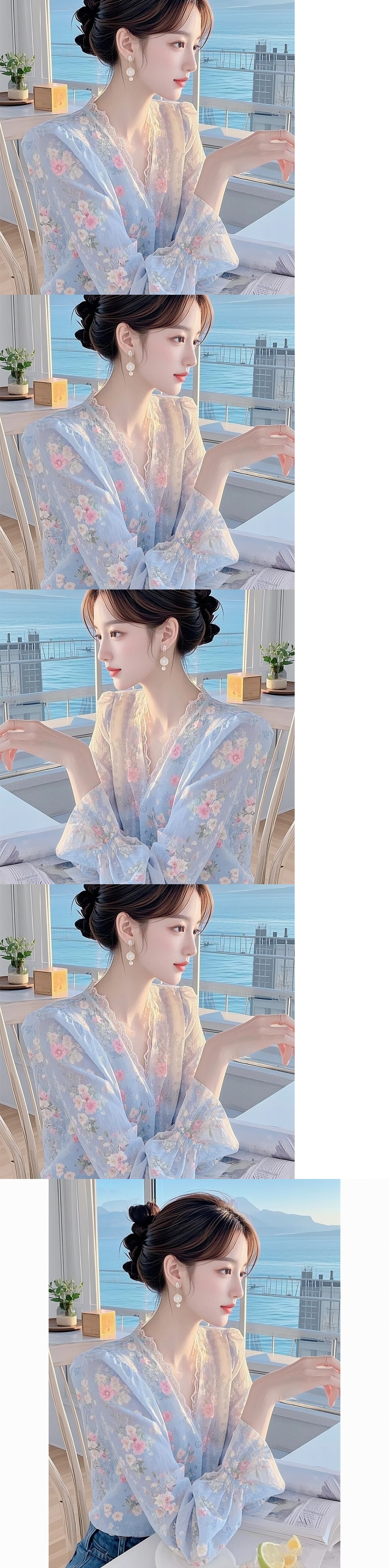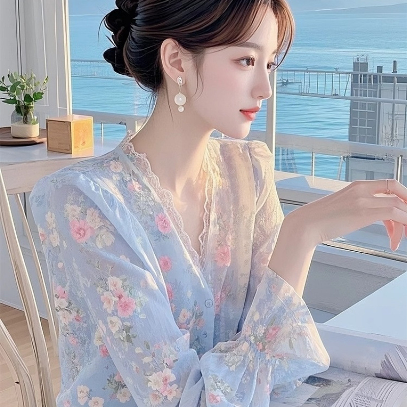 여성을위한 프랑스 고급 블루 꽃 무늬 긴팔 쉬폰 셔츠 봄 새로운 스타일의 가벼운 럭셔리 스타일 아름다운 탑