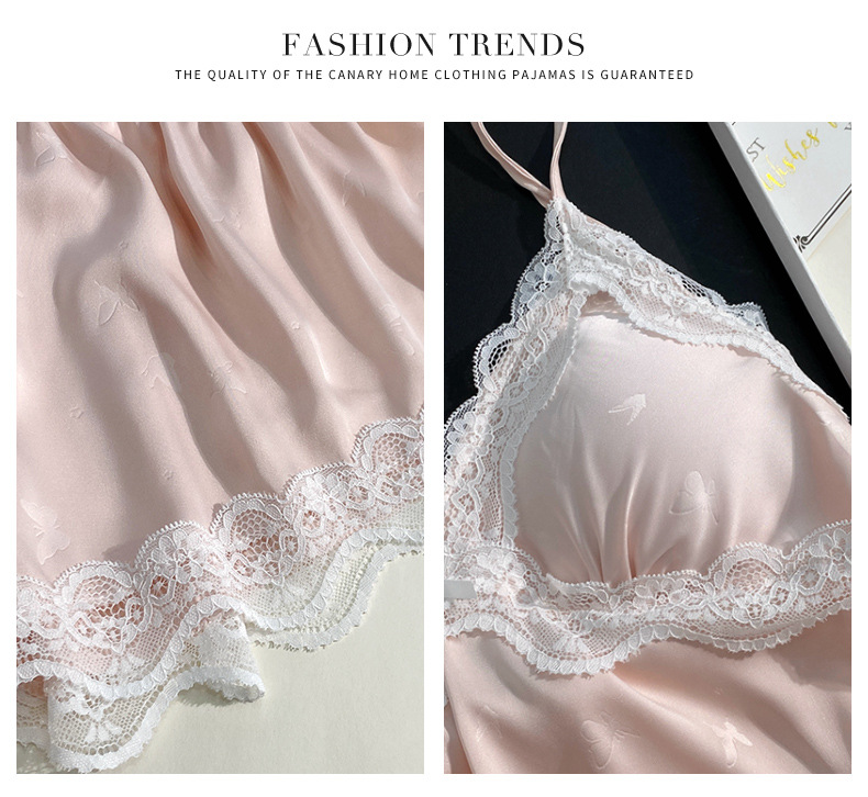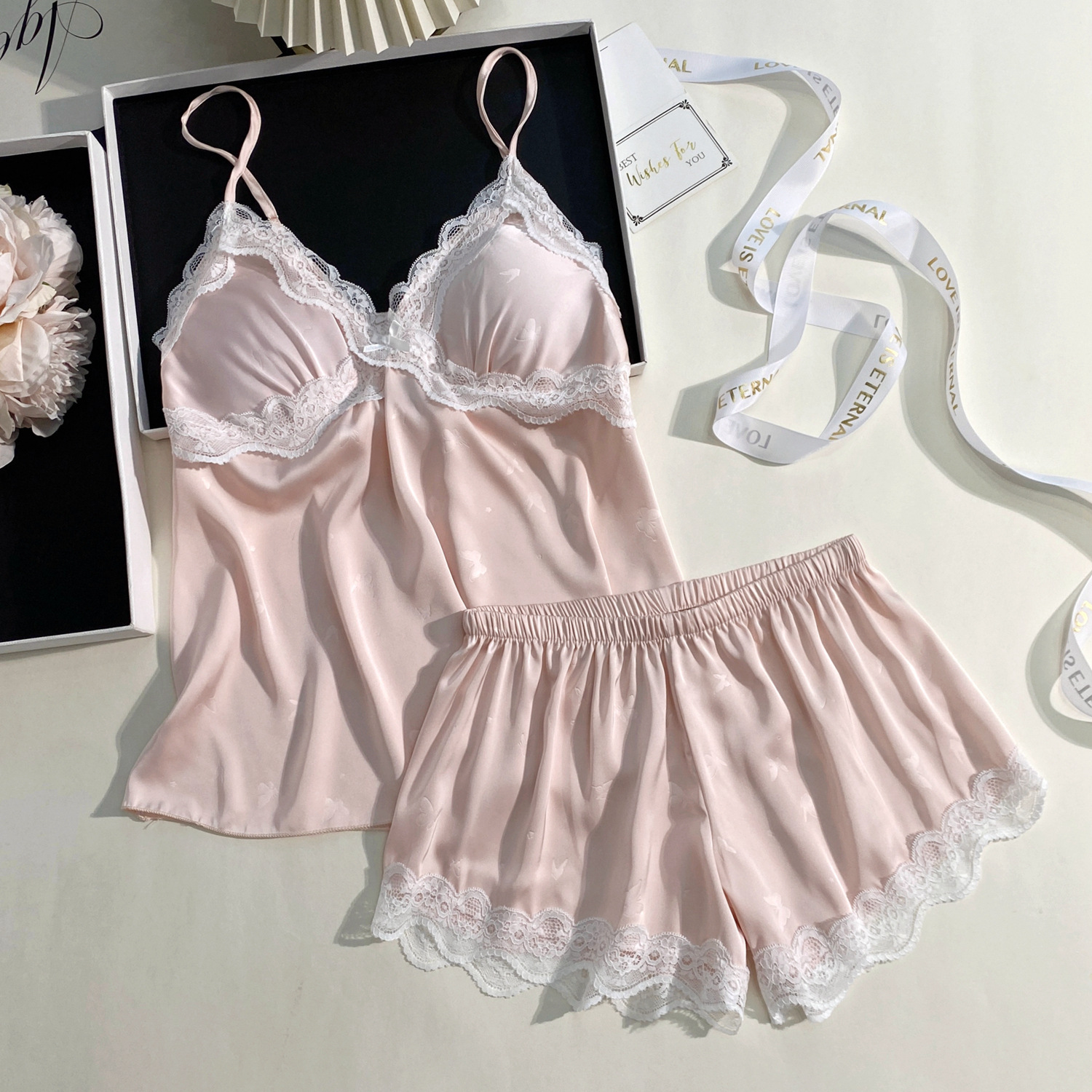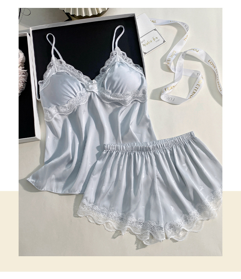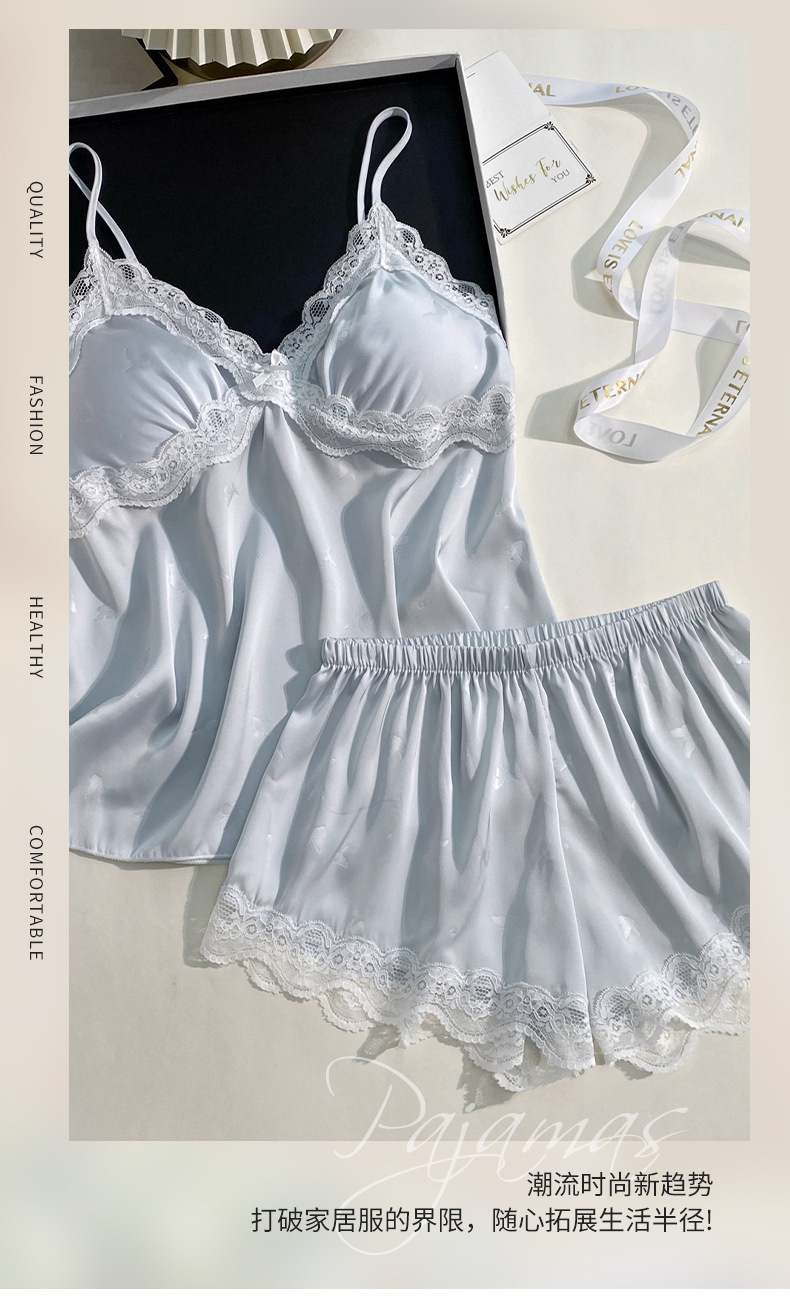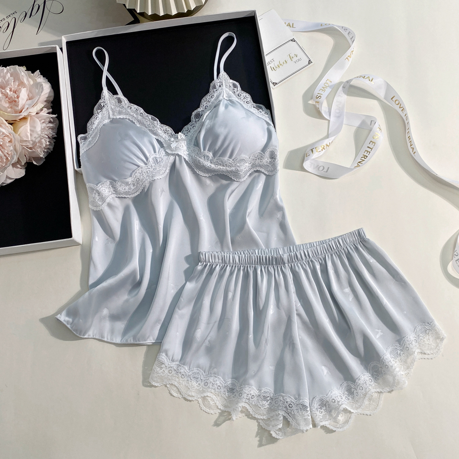 여름 새로운 얼음 실크 슬링 반바지 세트 여성 홈 잠옷 가볍고 편안한 답답하지 않은 레이스 트림 잠옷