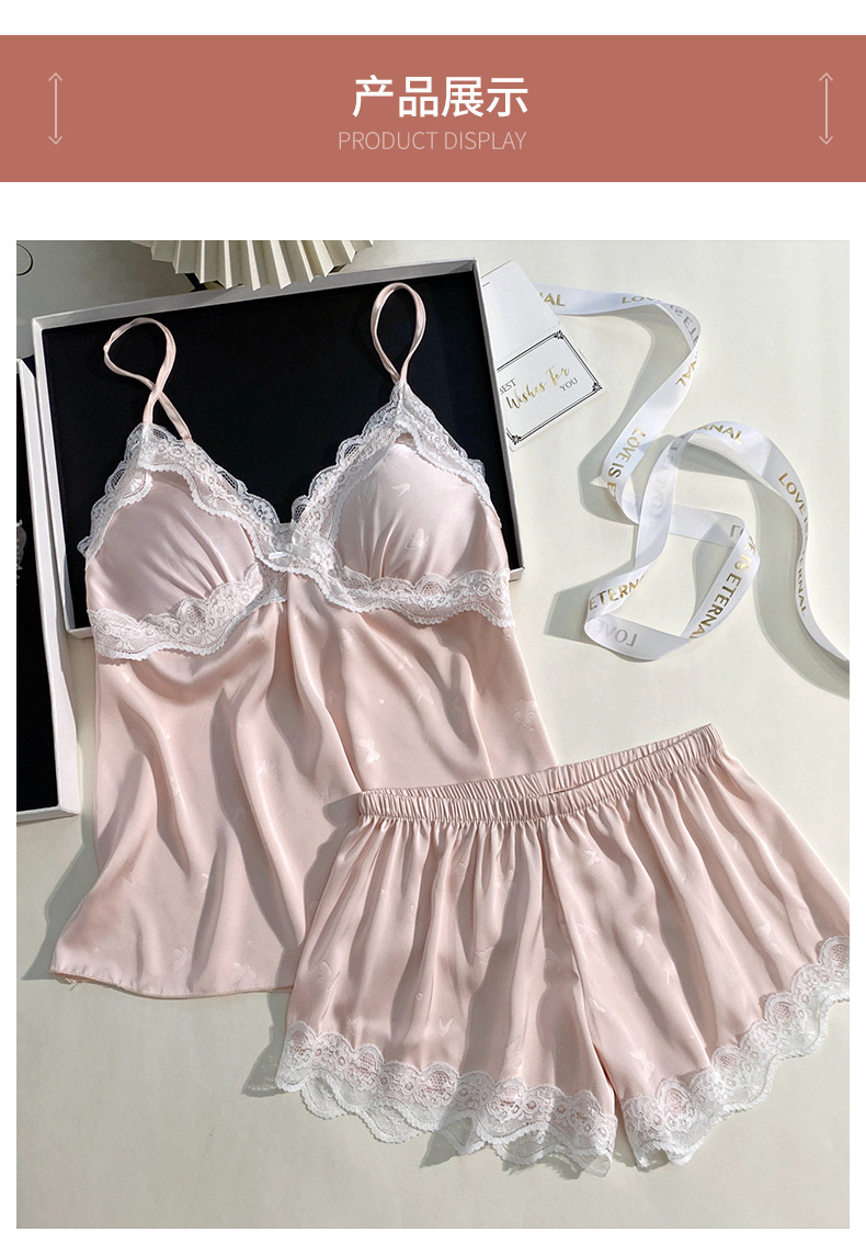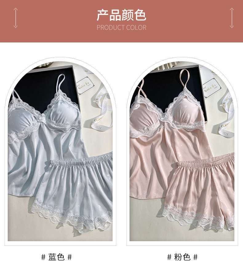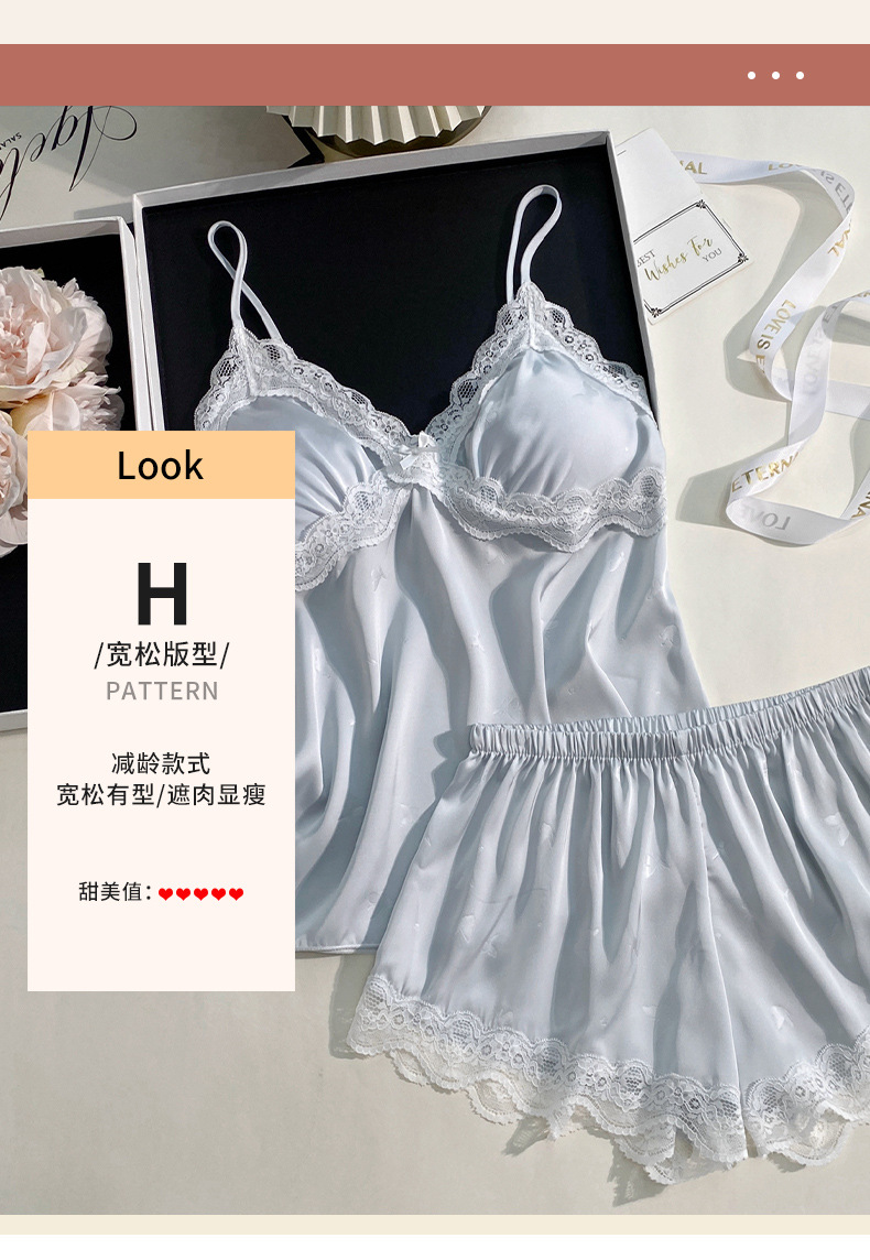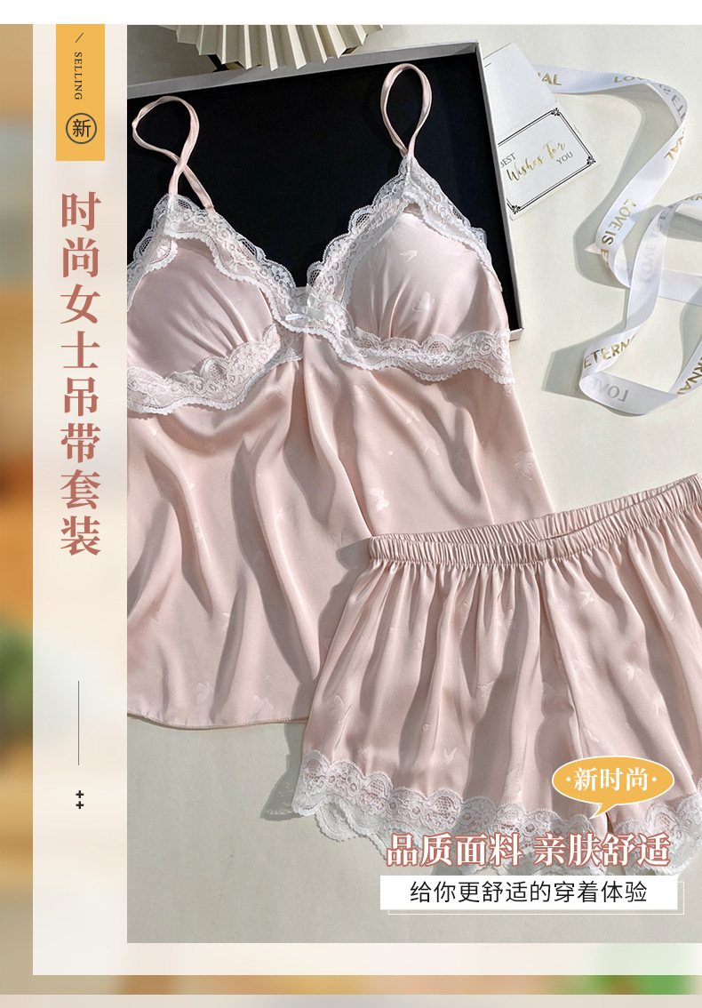 여름 새로운 얼음 실크 슬링 반바지 세트 여성 홈 잠옷 가볍고 편안한 답답하지 않은 레이스 트림 잠옷스토어 가기