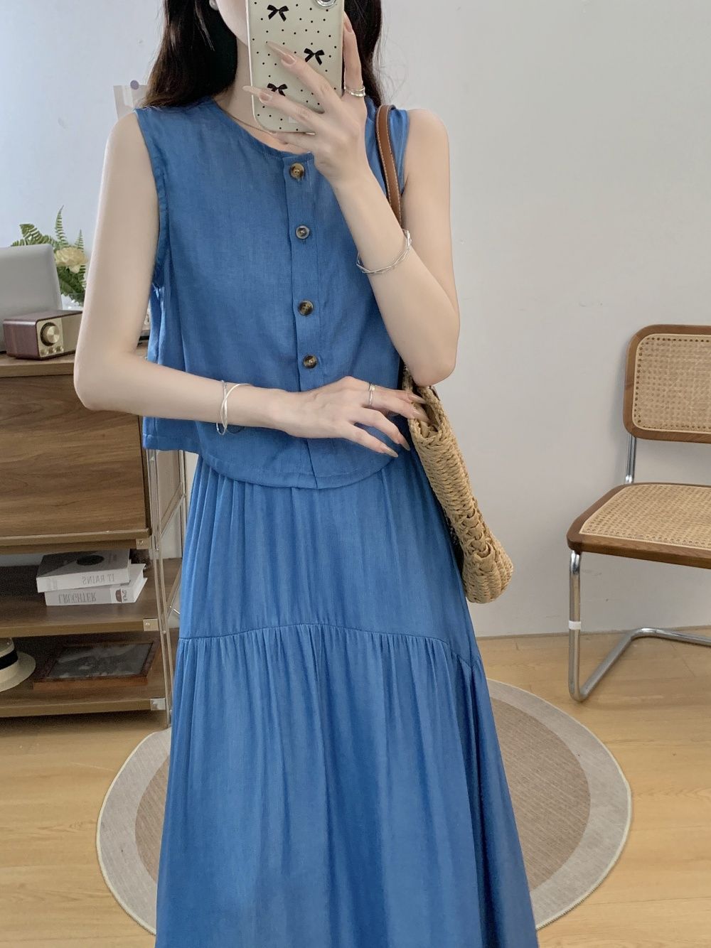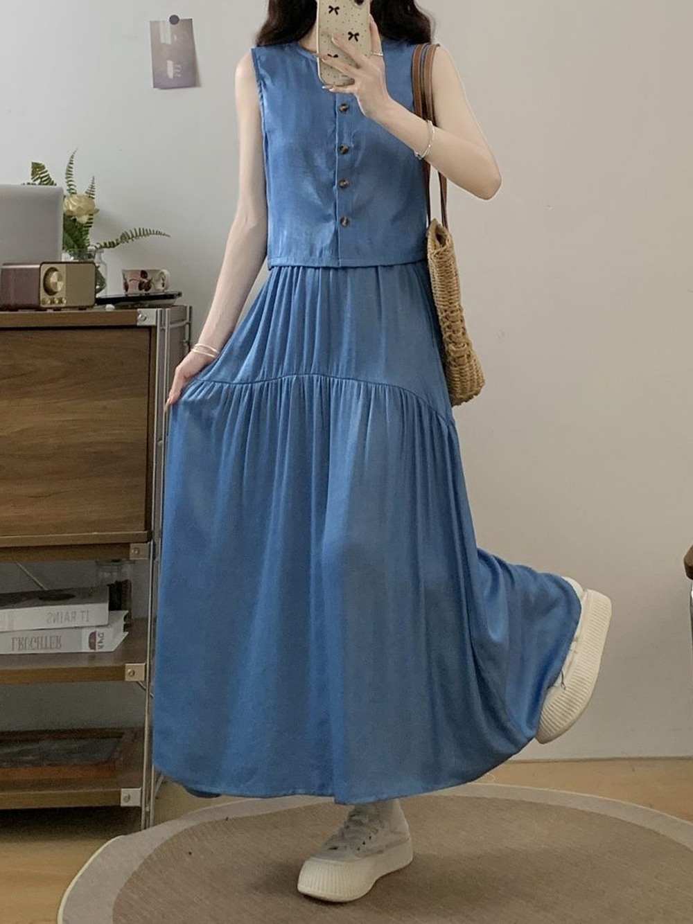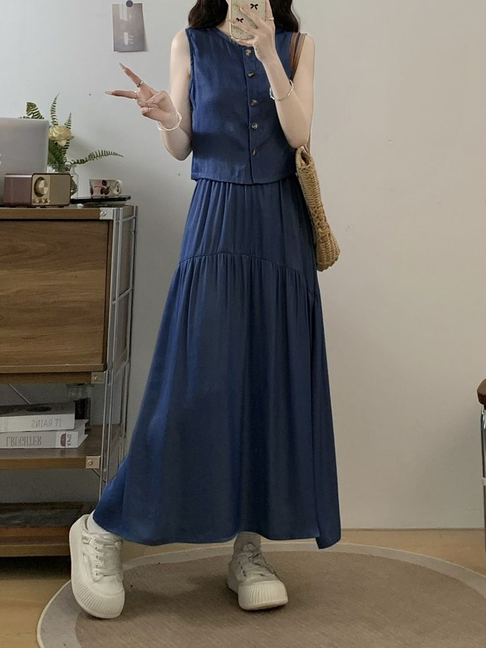 여성을위한 투피스 프렌치 햅번 스타일 민소매 조끼 탑 여름 2025 새로운 대형 스커트 정장스토어 가기