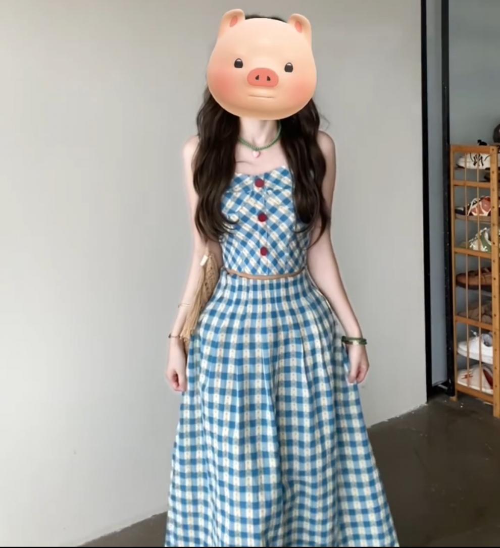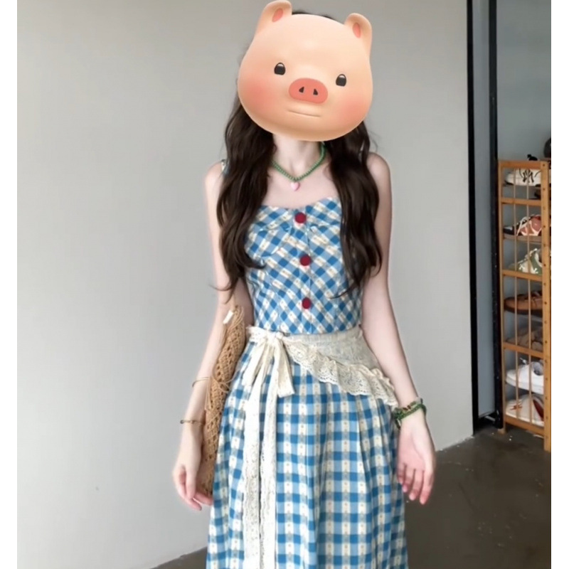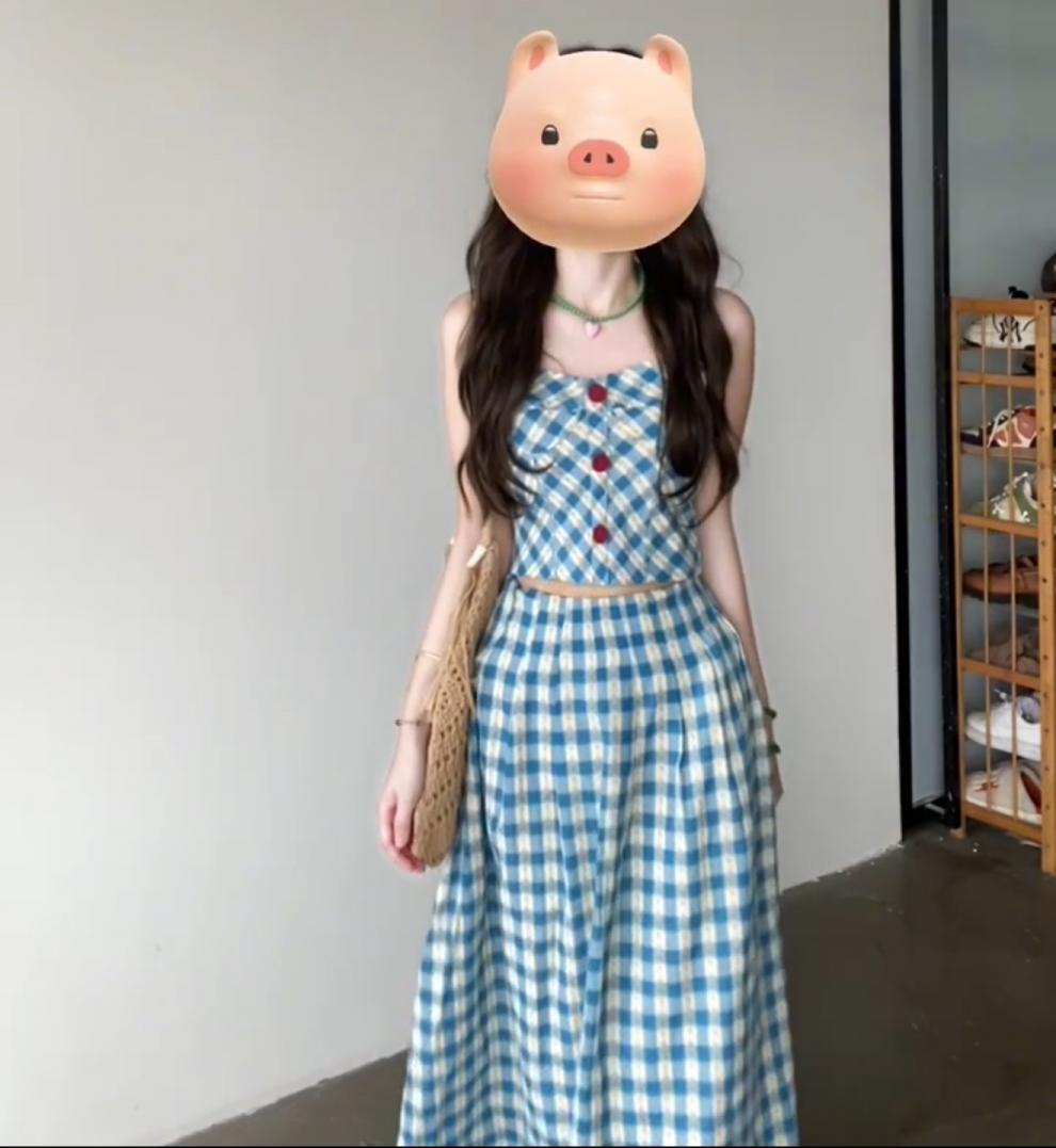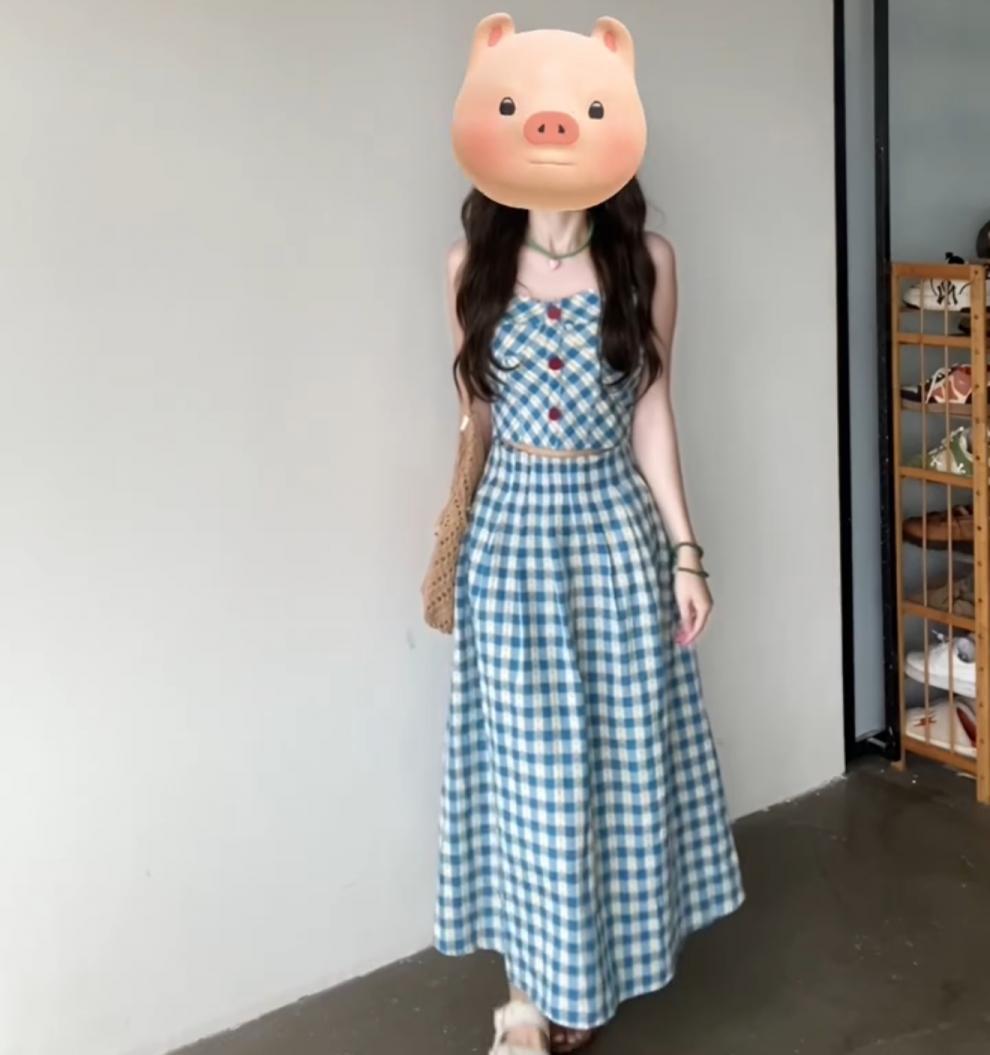 여성을위한 프랑스 복고풍 파란색 격자 무늬 서스펜더 슈트 여름 새로운 대학 스타일 허리 슬리밍 스커트 투피스 세트스토어 가기