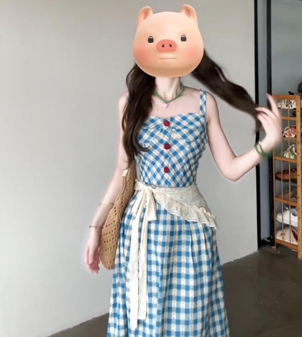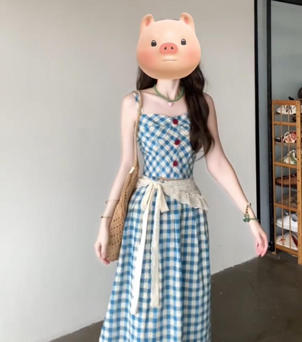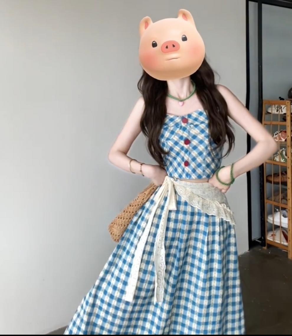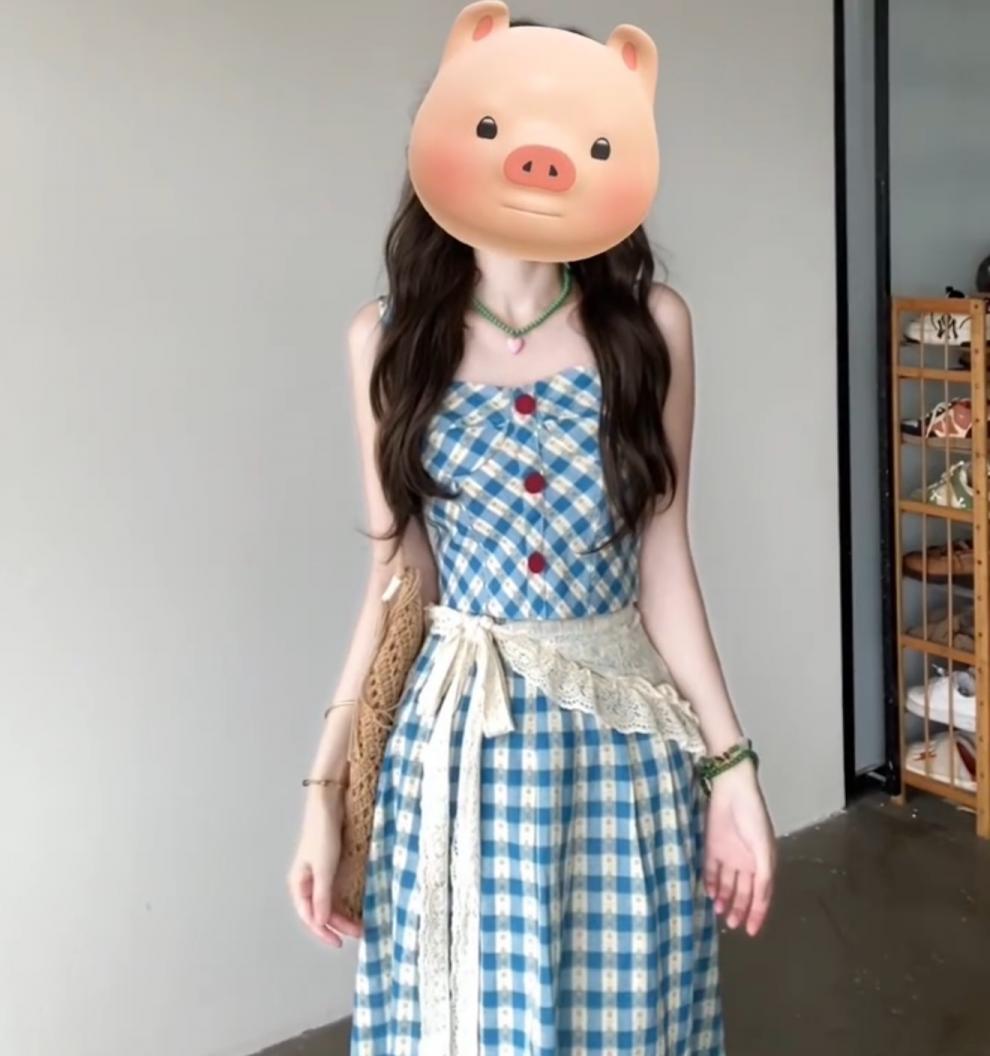 여성을위한 프랑스 복고풍 파란색 격자 무늬 서스펜더 슈트 여름 새로운 대학 스타일 허리 슬리밍 스커트 투피스 세트스토어 가기