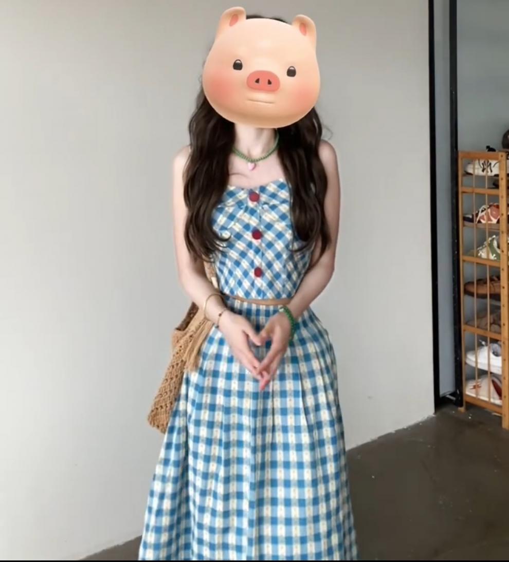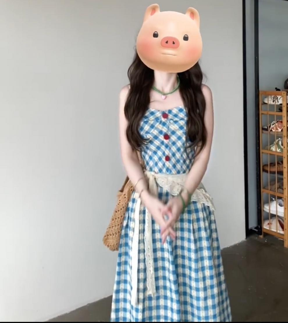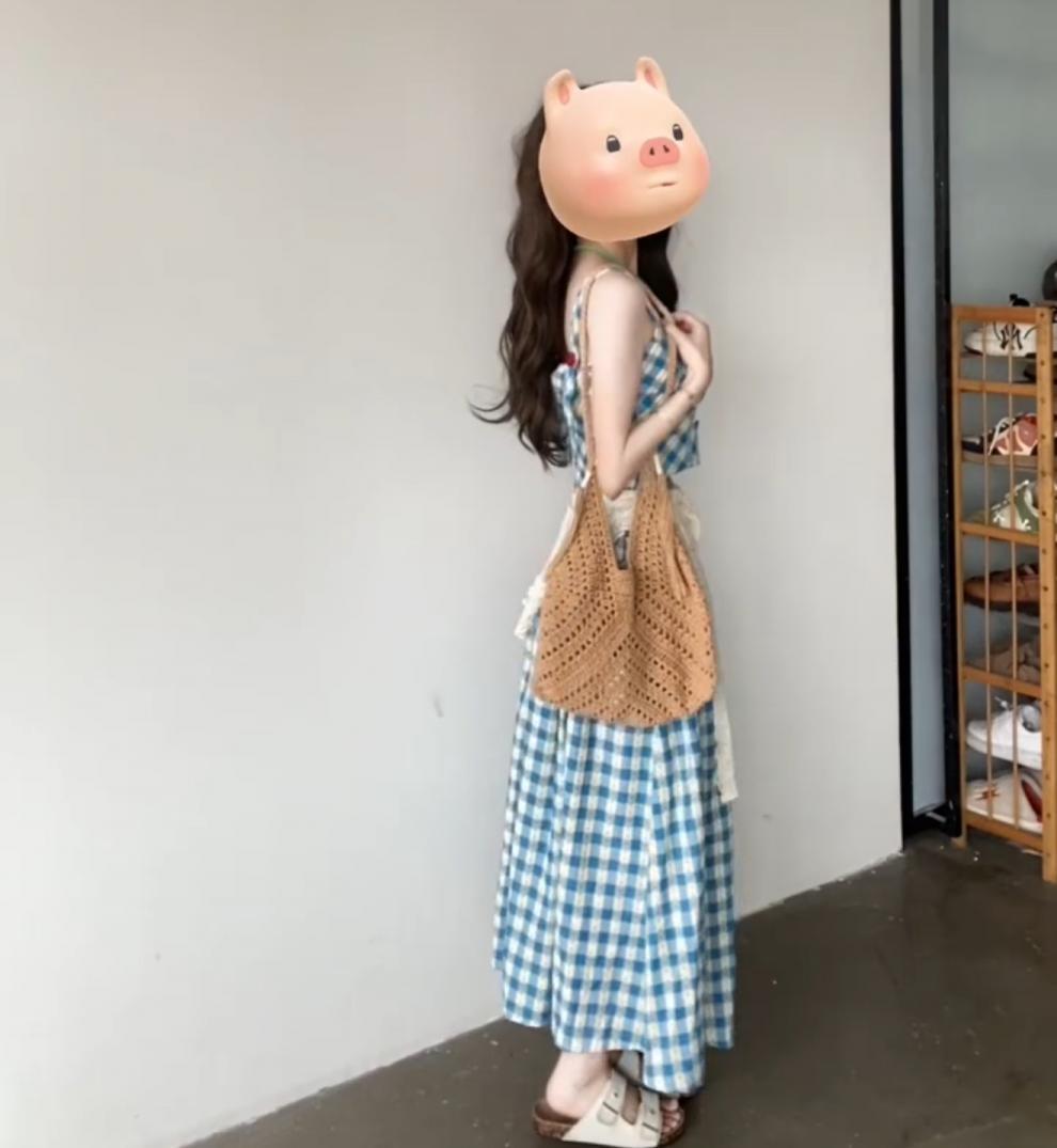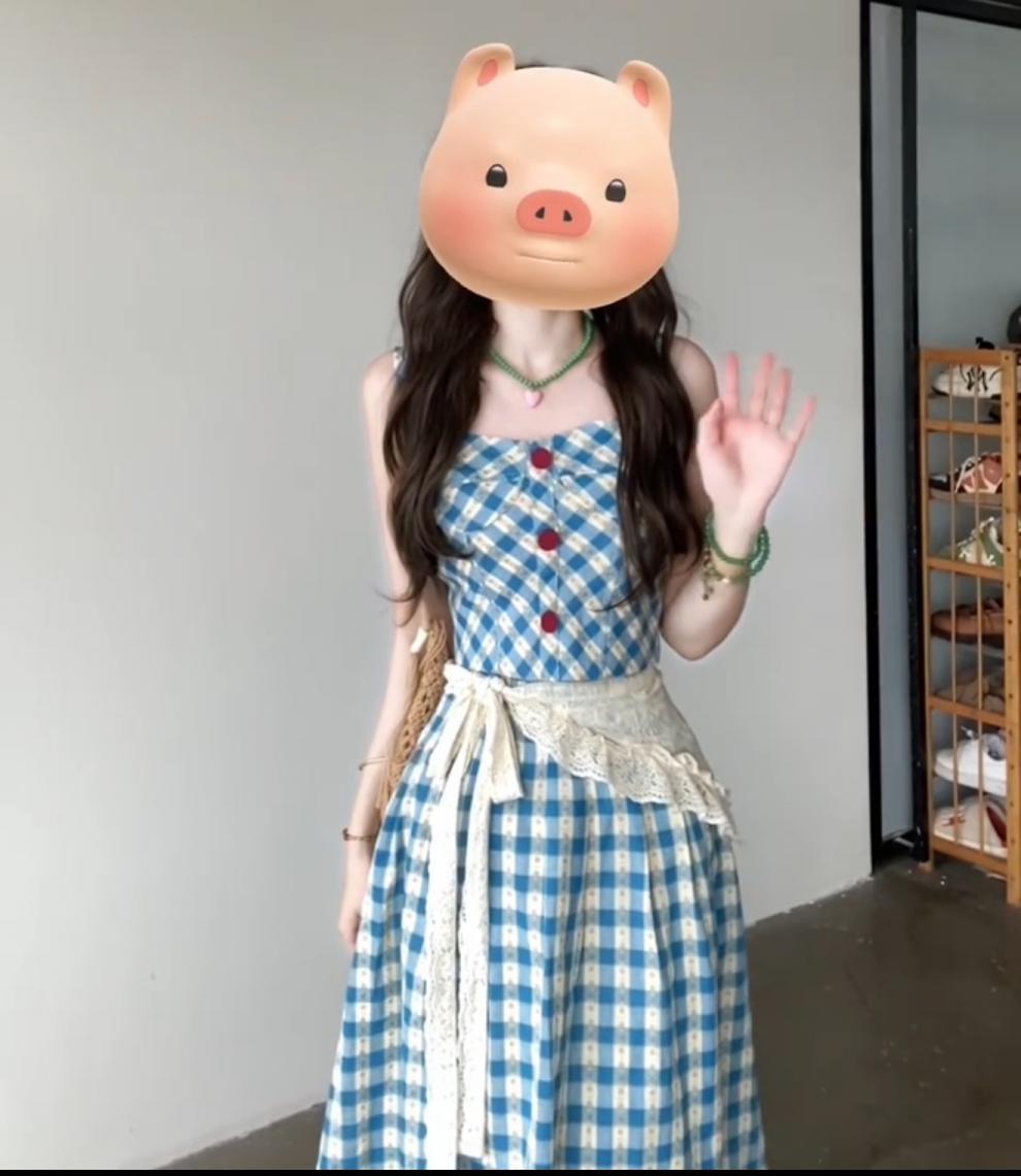 여성을위한 프랑스 복고풍 파란색 격자 무늬 서스펜더 슈트 여름 새로운 대학 스타일 허리 슬리밍 스커트 투피스 세트스토어 가기