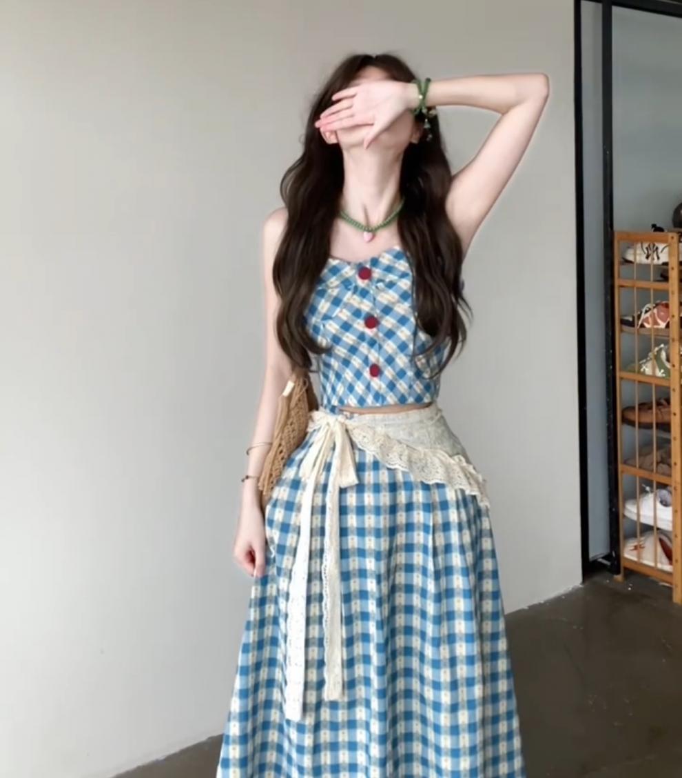 여성을위한 프랑스 복고풍 파란색 격자 무늬 서스펜더 슈트 여름 새로운 대학 스타일 허리 슬리밍 스커트 투피스 세트