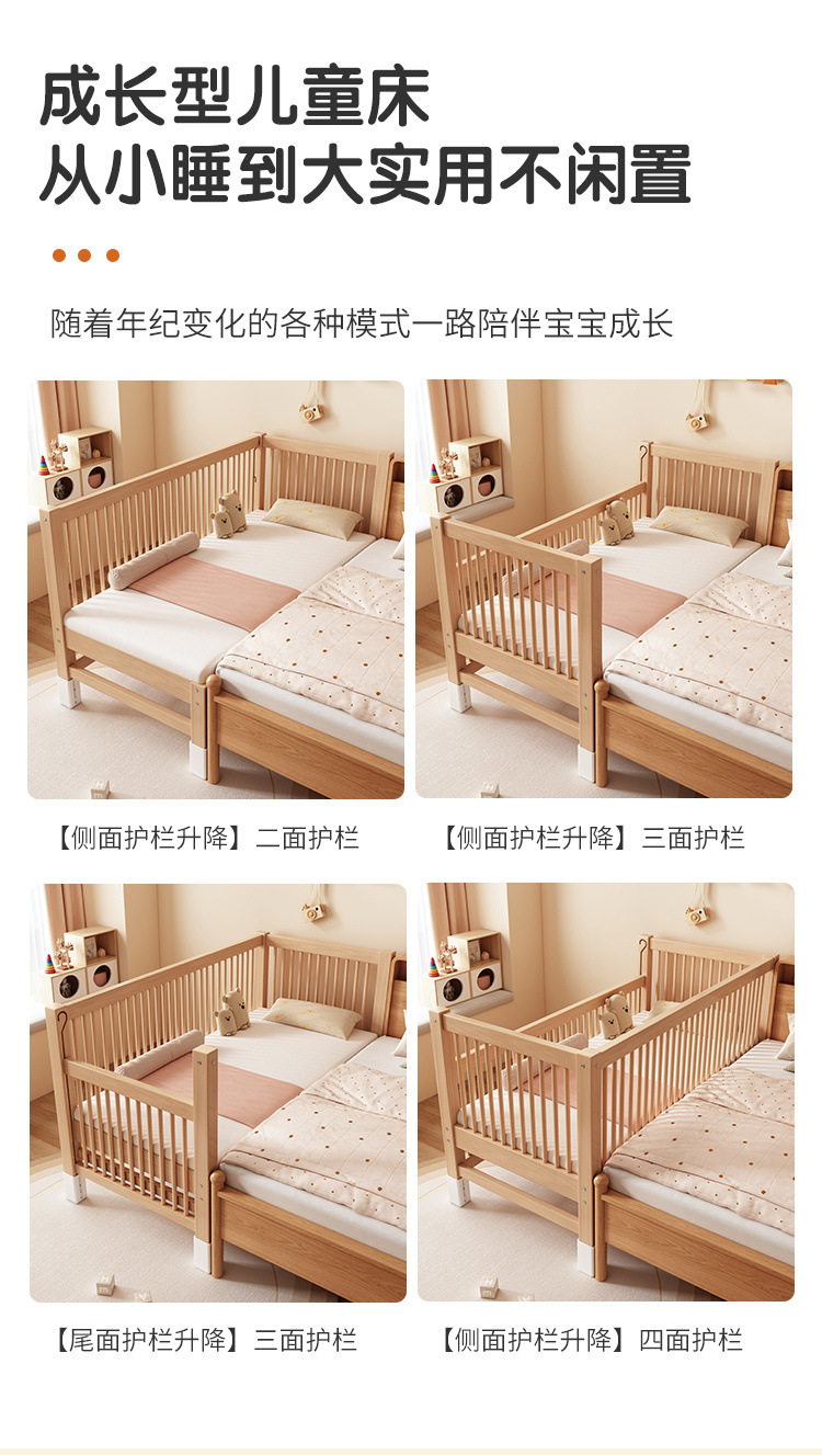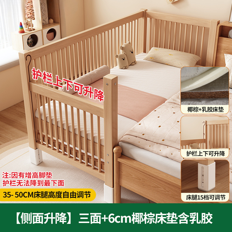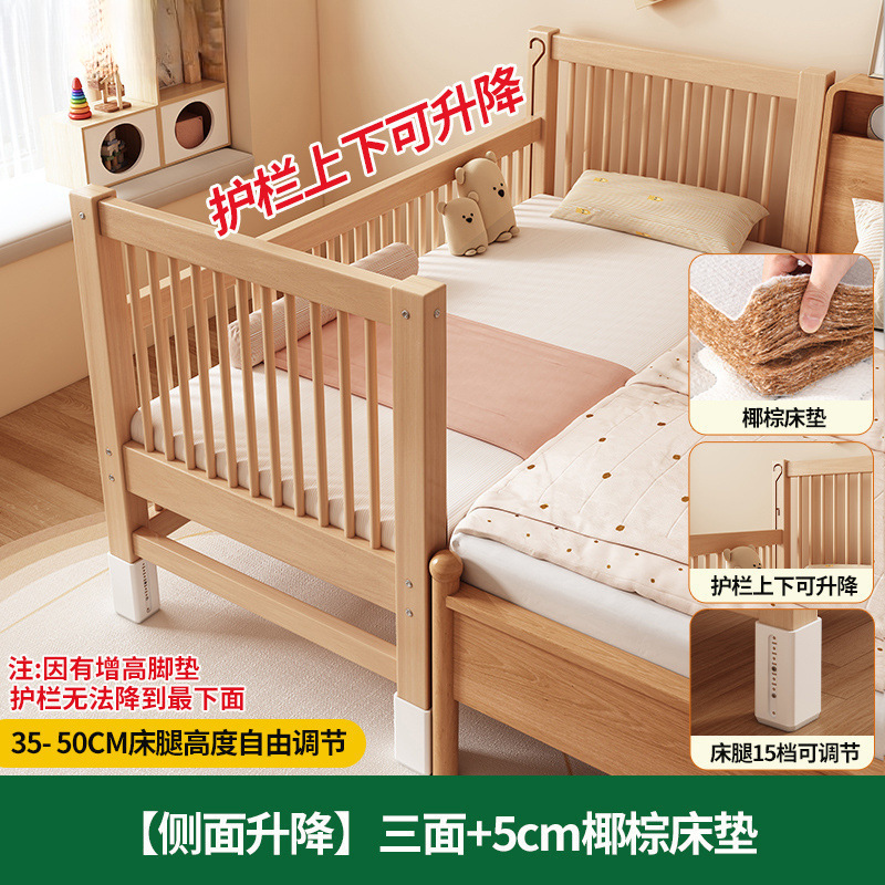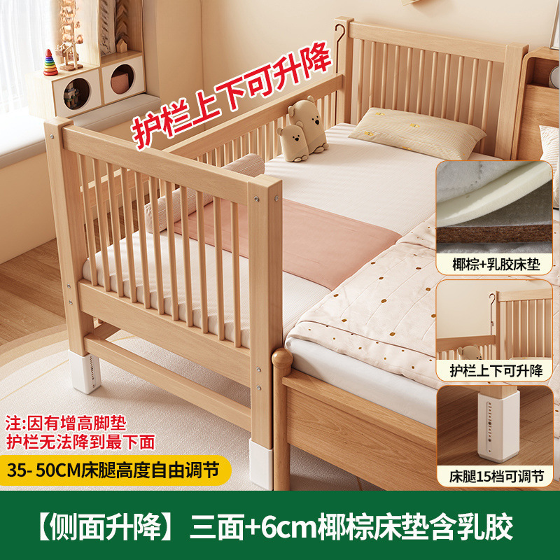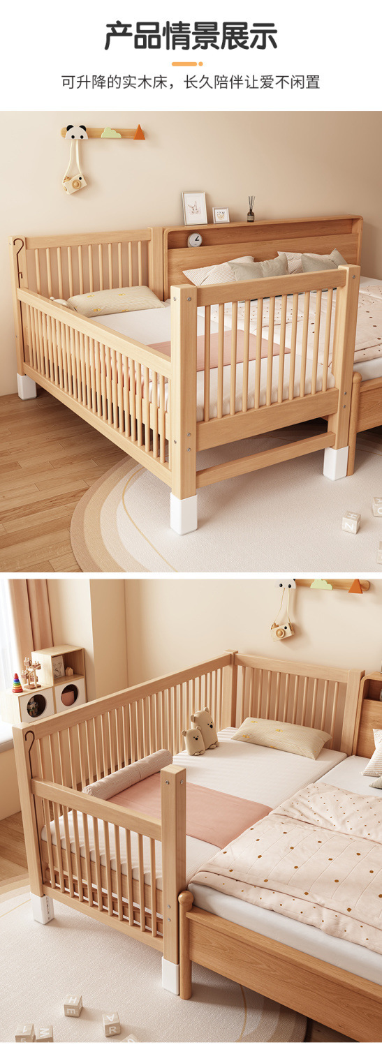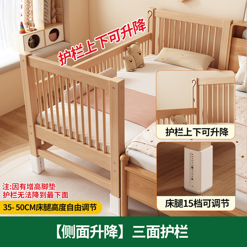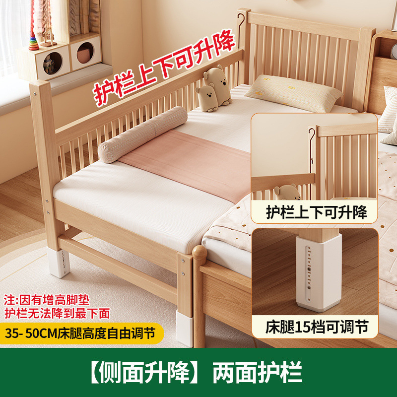 접합 침대, 어린이 침대, 높이 조절 가능한 아기 원목 침대 옆 확장, 성인이 수면할 수 있는 리프팅 울타리, 너도밤나무 침대