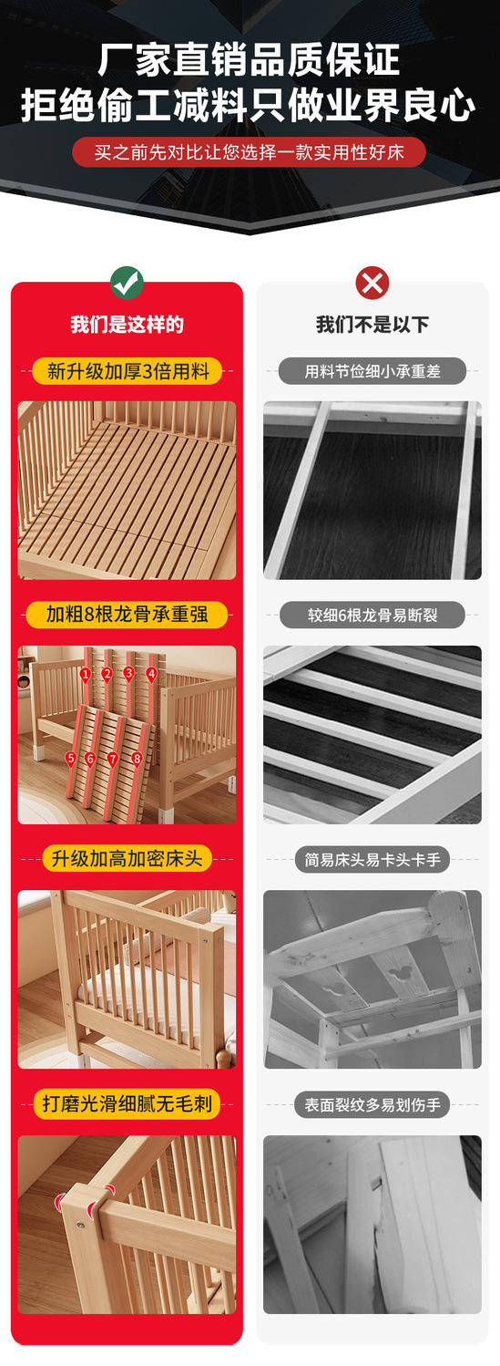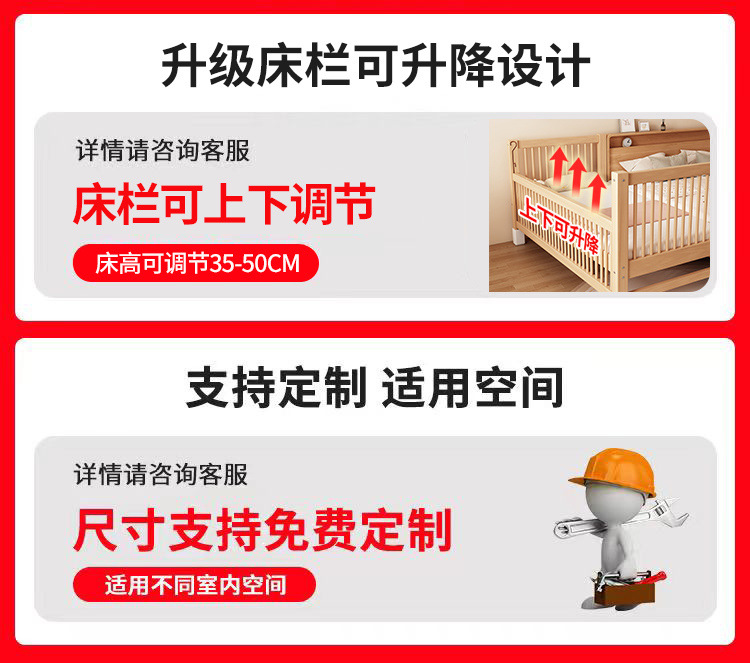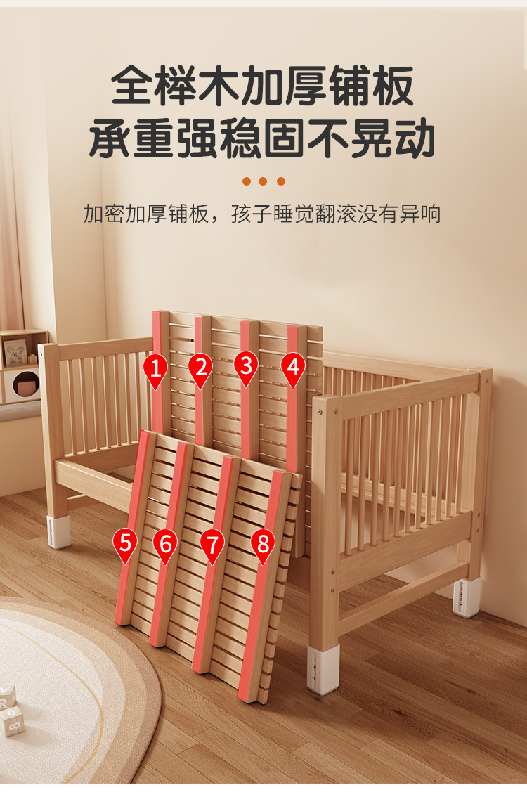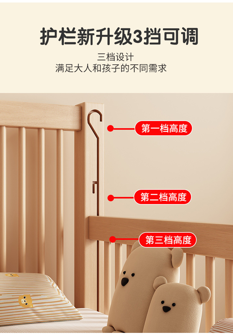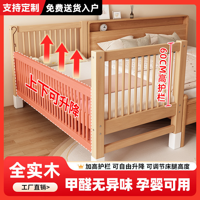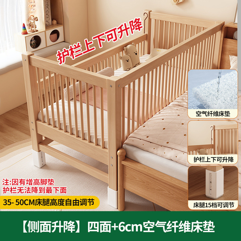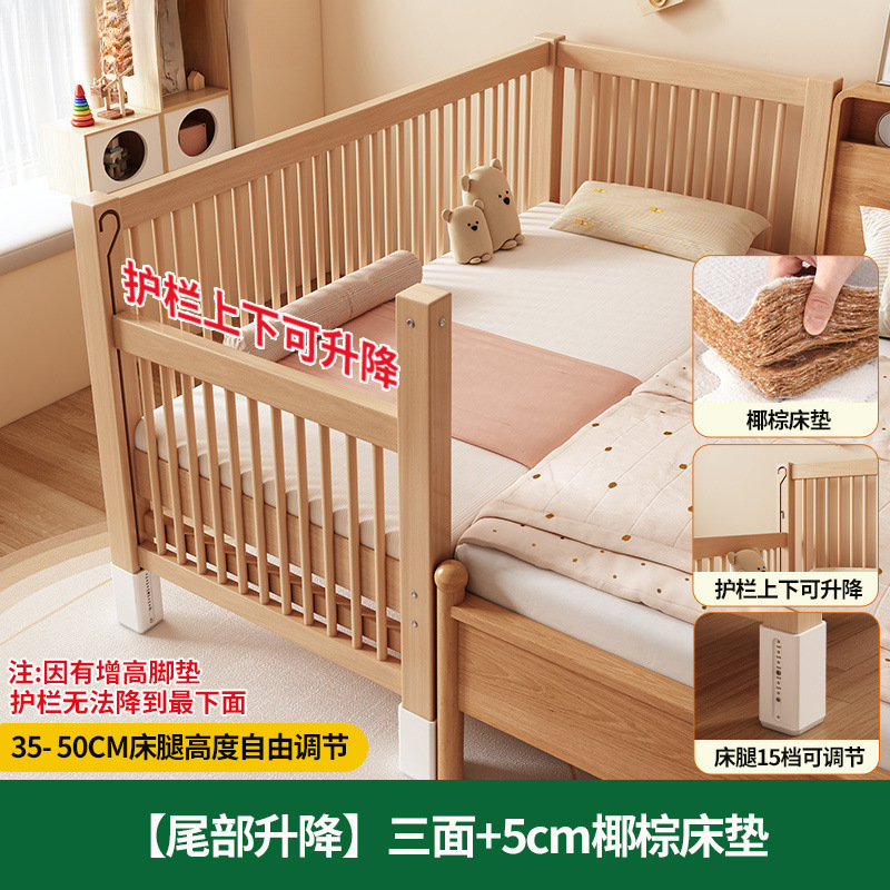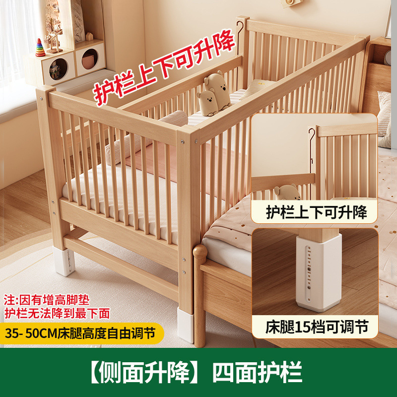 접합 침대, 어린이 침대, 높이 조절 가능한 아기 원목 침대 옆 확장, 성인이 수면할 수 있는 리프팅 울타리, 너도밤나무 침대