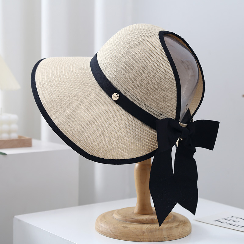 • 플랫 캡 보우 밀짚모자 - 베이지