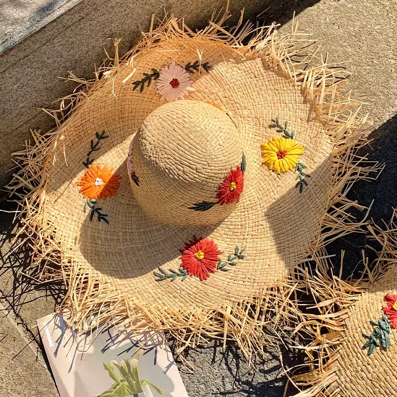 • 챙이 큰 로우 엣지 자수 밀짚모자 - 베이지