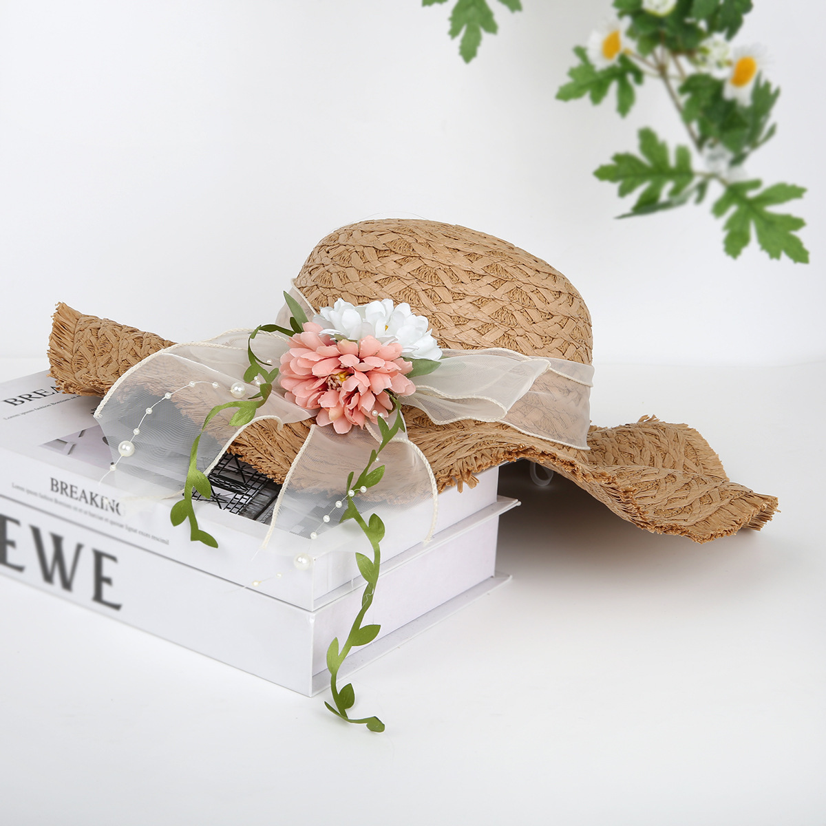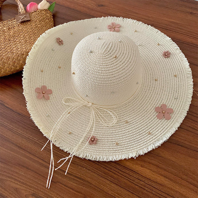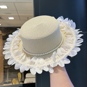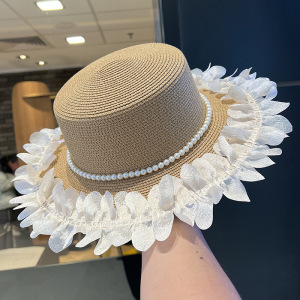 • 큰 레이스와 진주 밀짚모자 - 베이지