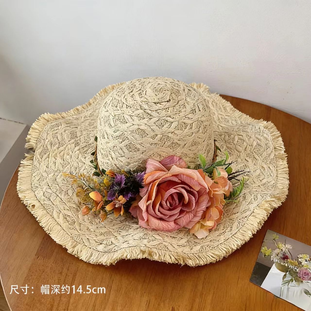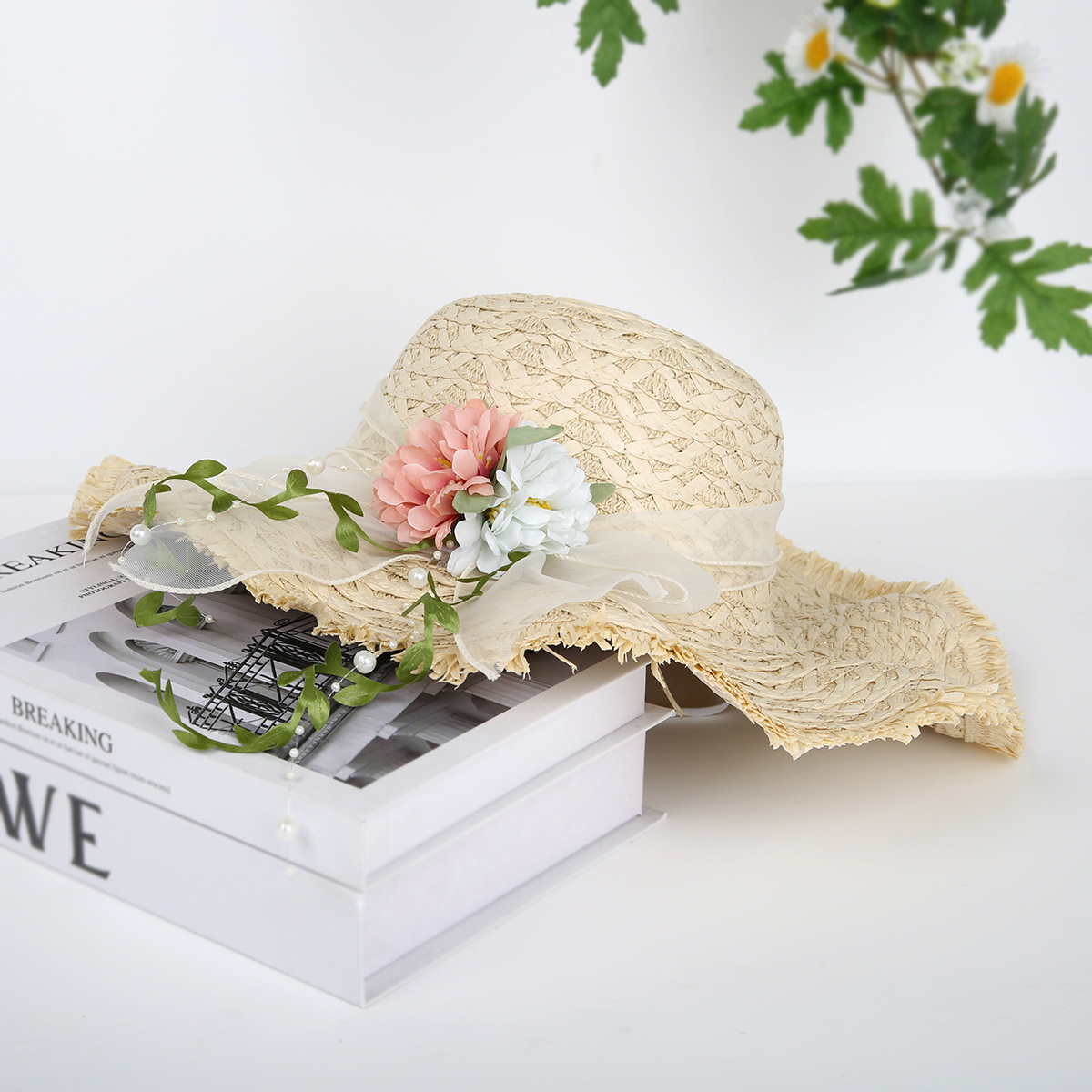 • 챙이 넓은 4cm 로우 엣지 레이스 밀짚모자 - 베이지