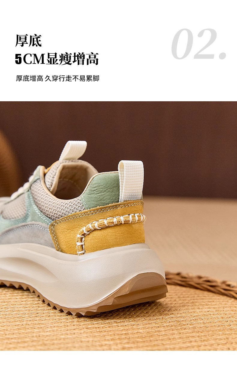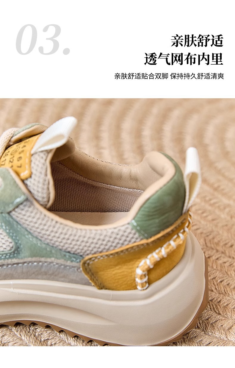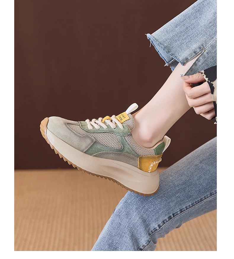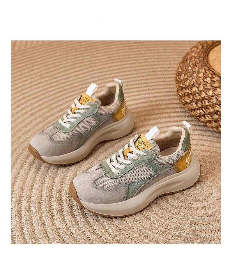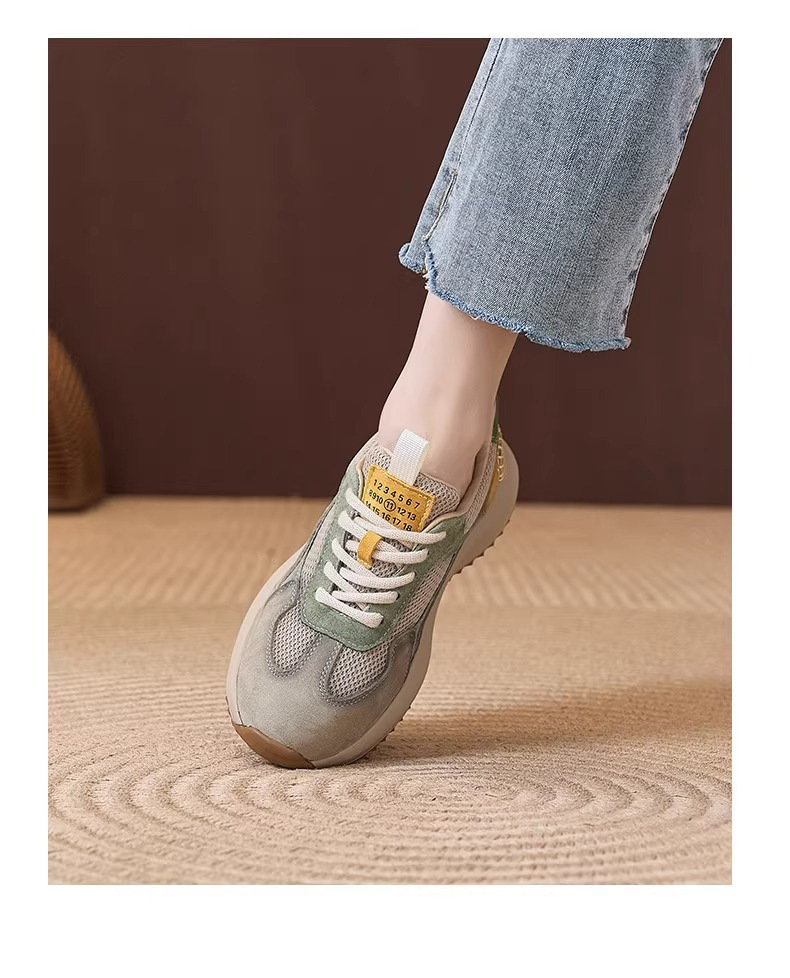 여성을위한 정품 가죽 두꺼운 밑창 포레스트 검프 신발 봄 새로운 스타일 편안하고 다재다능한 아빠 신발 메쉬 통기성 레이스 업 캐주얼 육군 훈련 신발