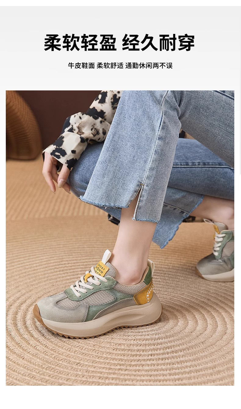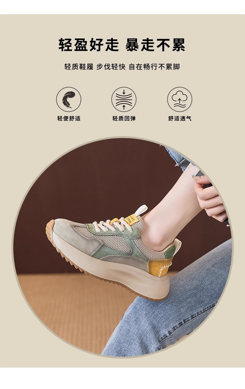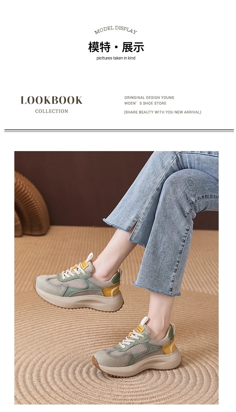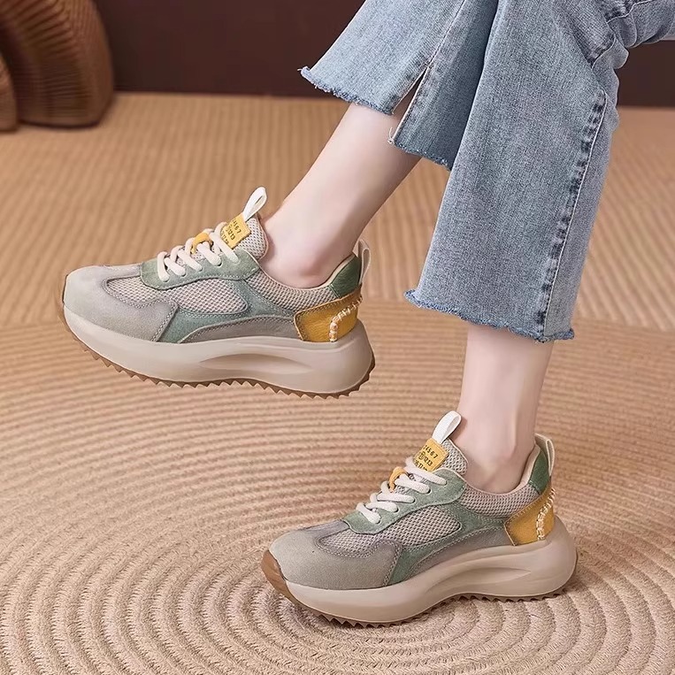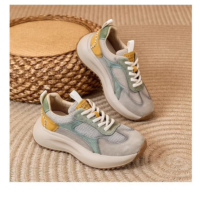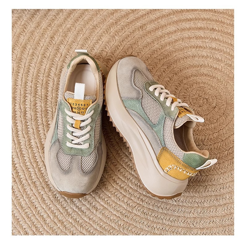 여성을위한 정품 가죽 두꺼운 밑창 포레스트 검프 신발 봄 새로운 스타일 편안하고 다재다능한 아빠 신발 메쉬 통기성 레이스 업 캐주얼 육군 훈련 신발스토어 가기
