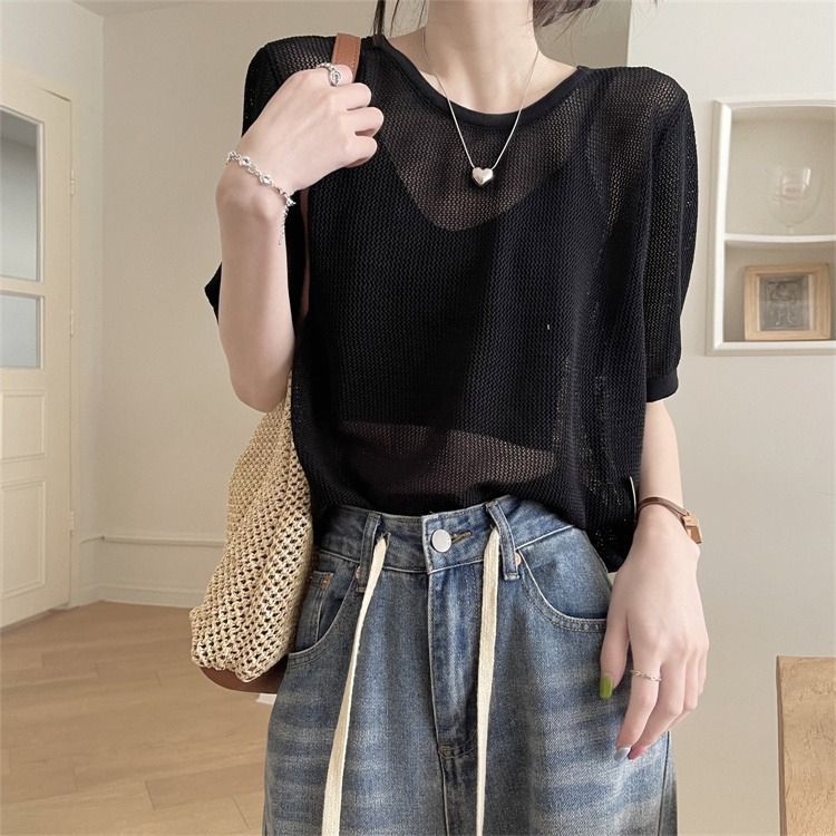 여름용 스트라이프 백리스 반팔 티셔츠 아이스 실크 자외선 차단 블라우스 다용도 캐주얼 시크 쇼트 살짝 시스루 탑 인스토어 가기