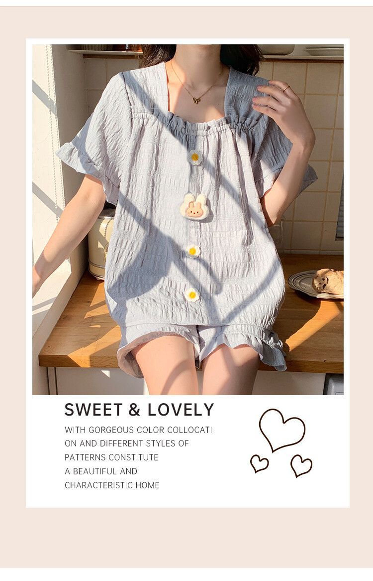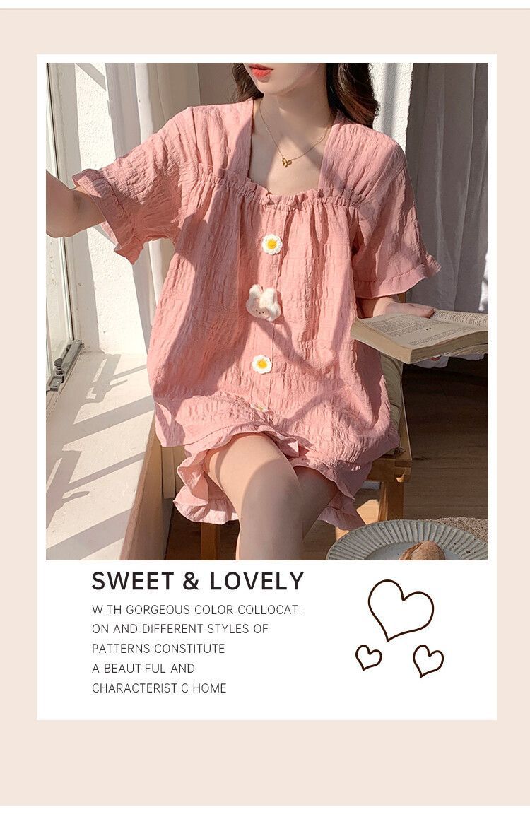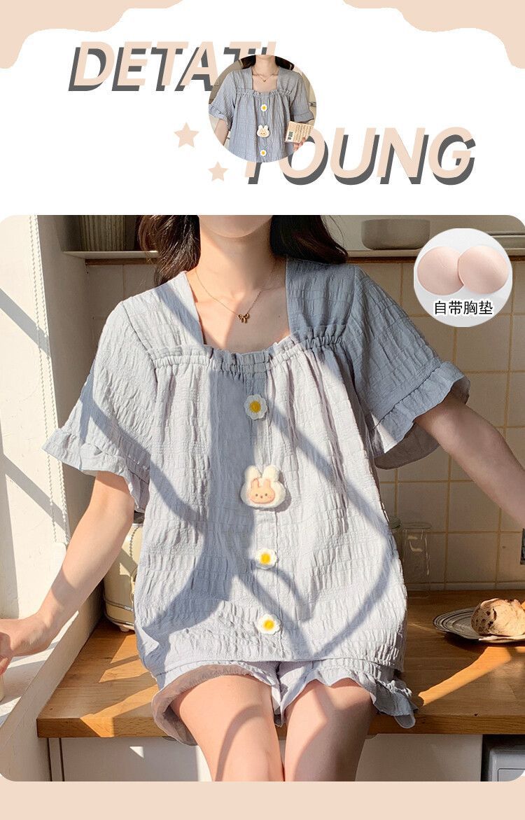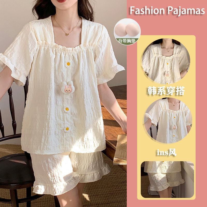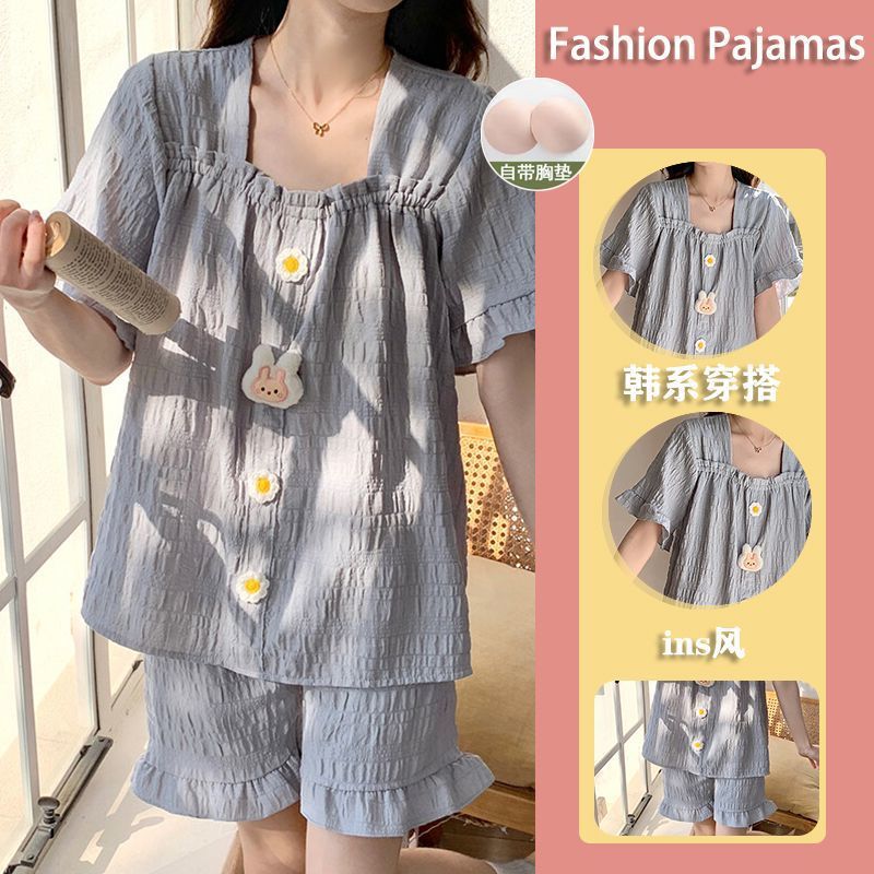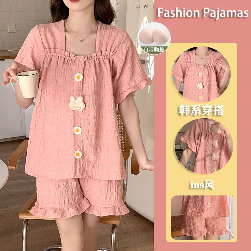 여성용 가슴 패드가있는 잠옷 여름 반팔 클라우드 코튼 스위트 플라워 한국 스타일 공주 스타일 학생 홈웨어 투피스 세트스토어 가기