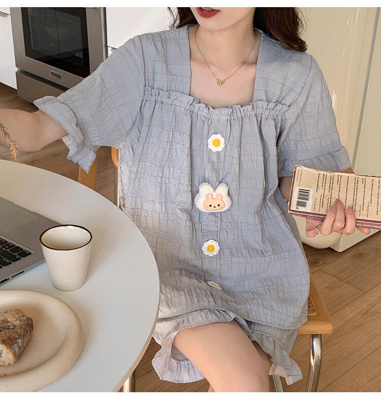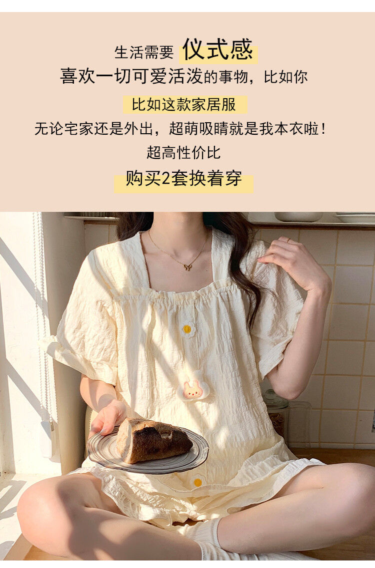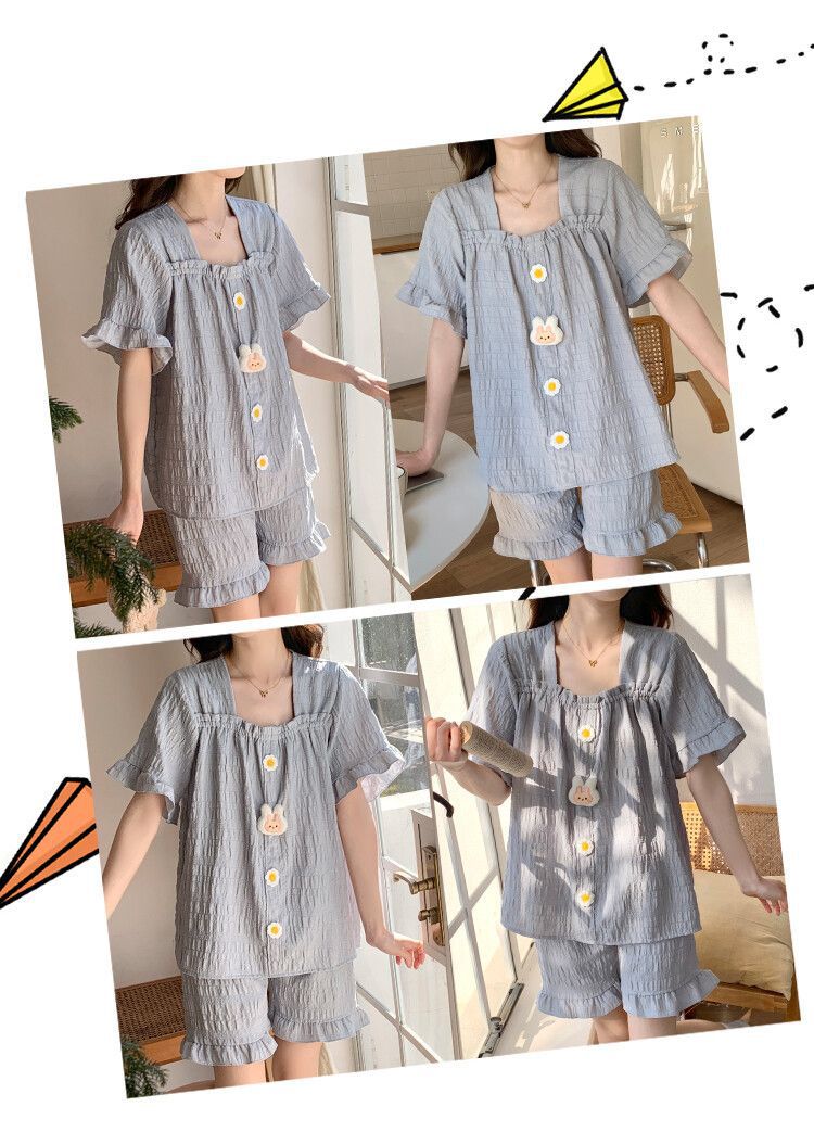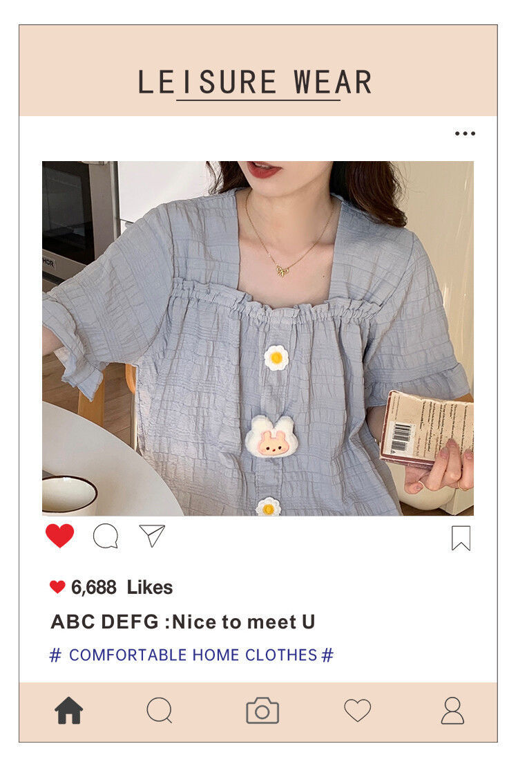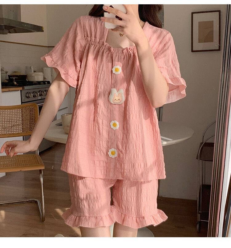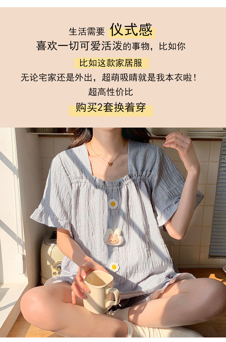 여성용 가슴 패드가있는 잠옷 여름 반팔 클라우드 코튼 스위트 플라워 한국 스타일 공주 스타일 학생 홈웨어 투피스 세트스토어 가기